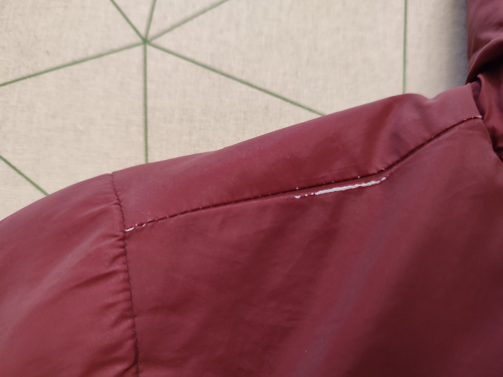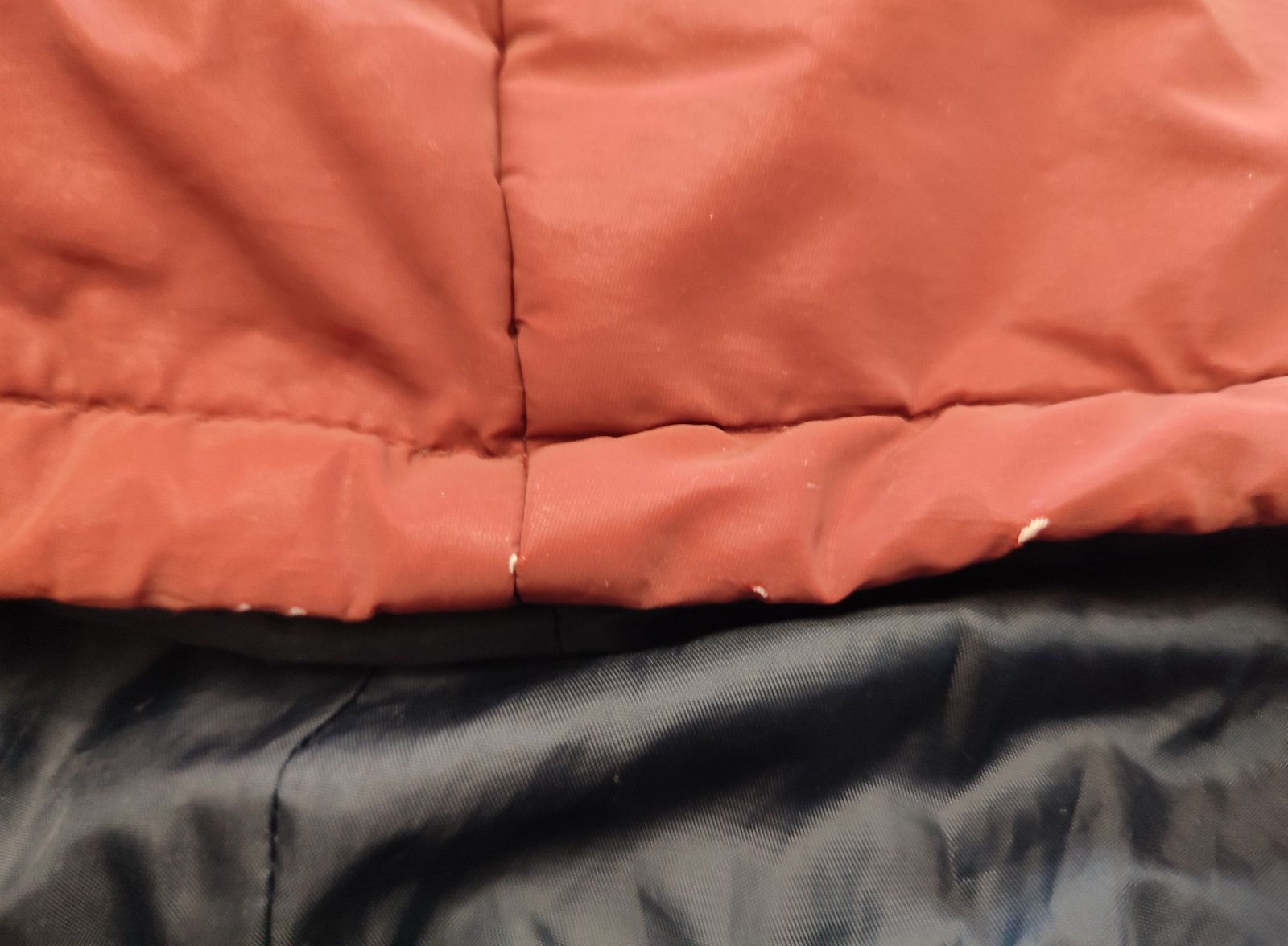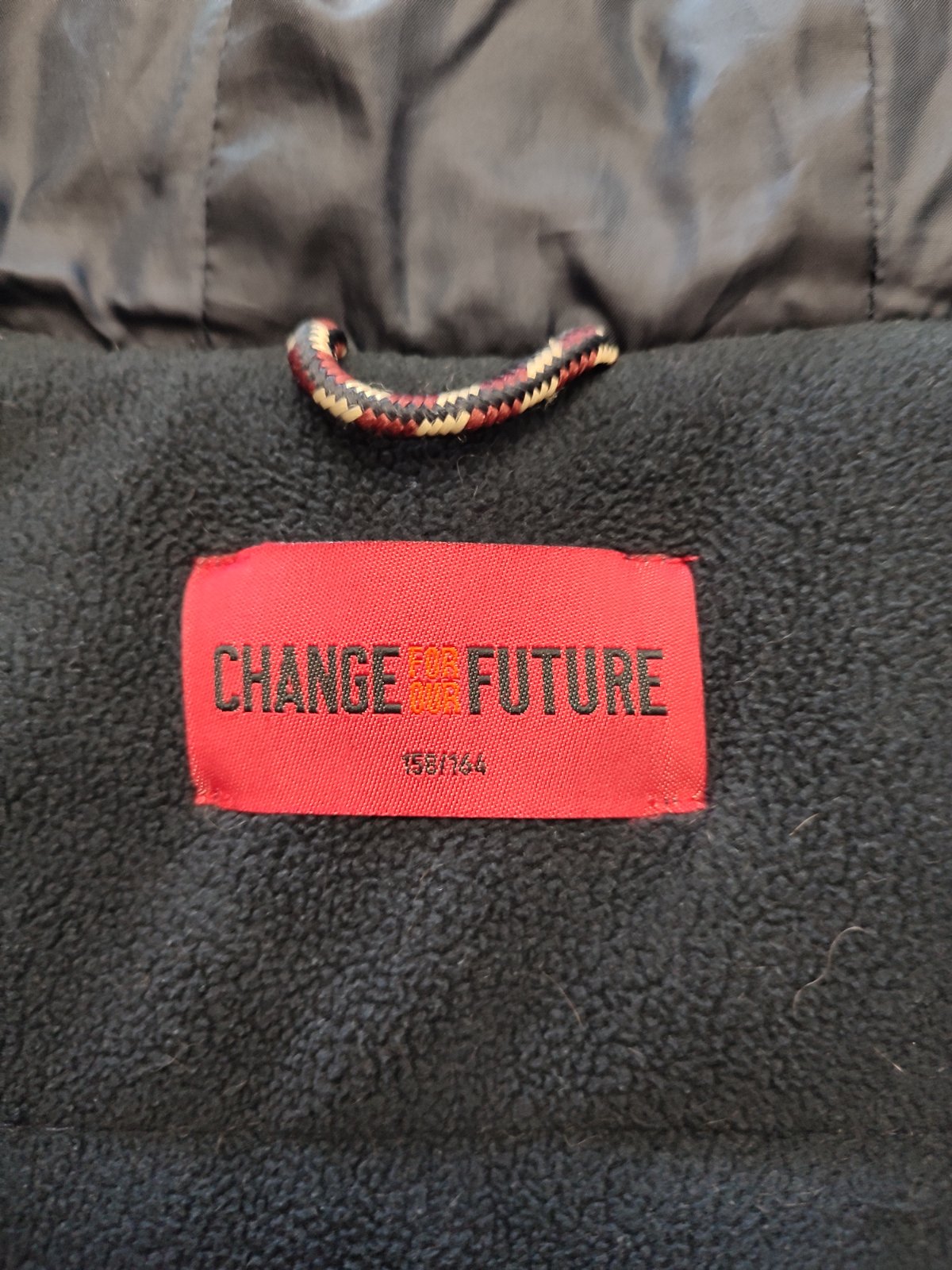 Teplá, vatovaná vetrovka na zimu. Závada - ošúchaná látka na kapucni a pleci /viz foto/, inak bez fľakov a žmolkov.