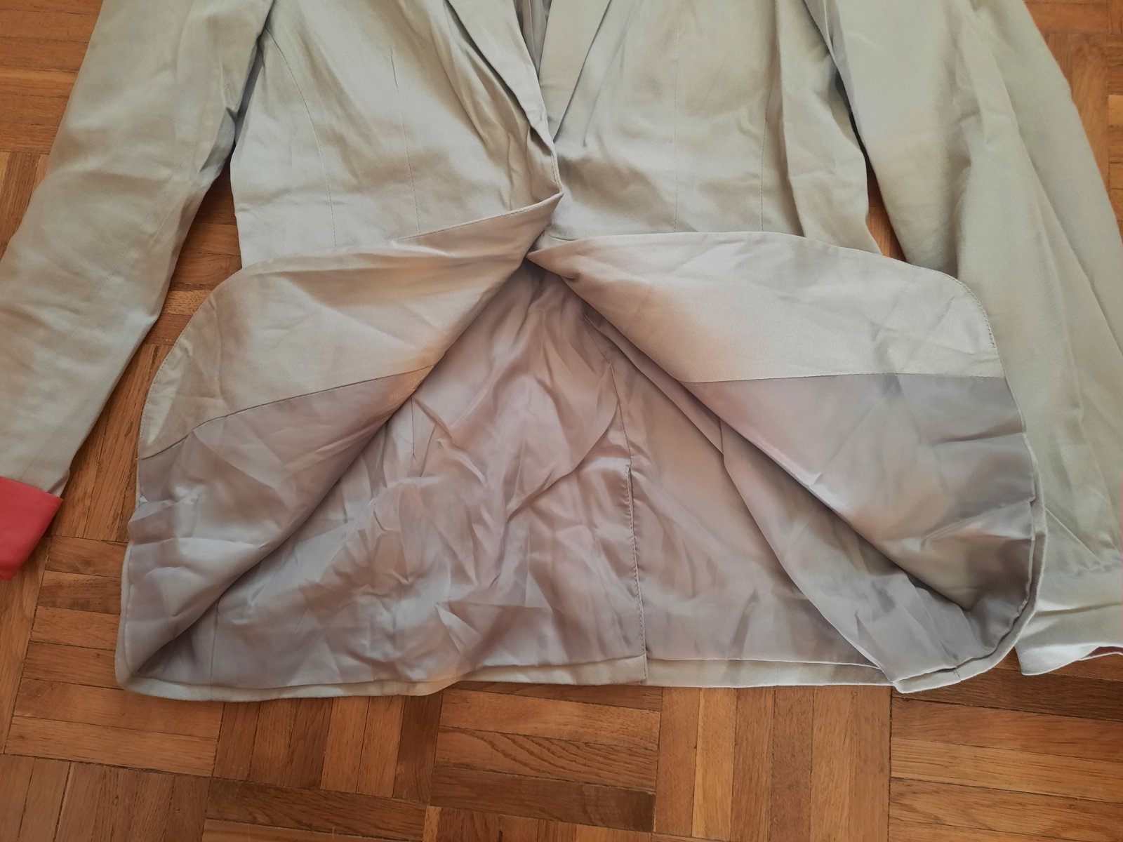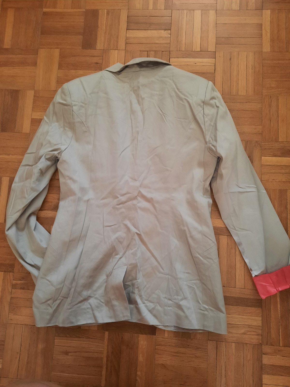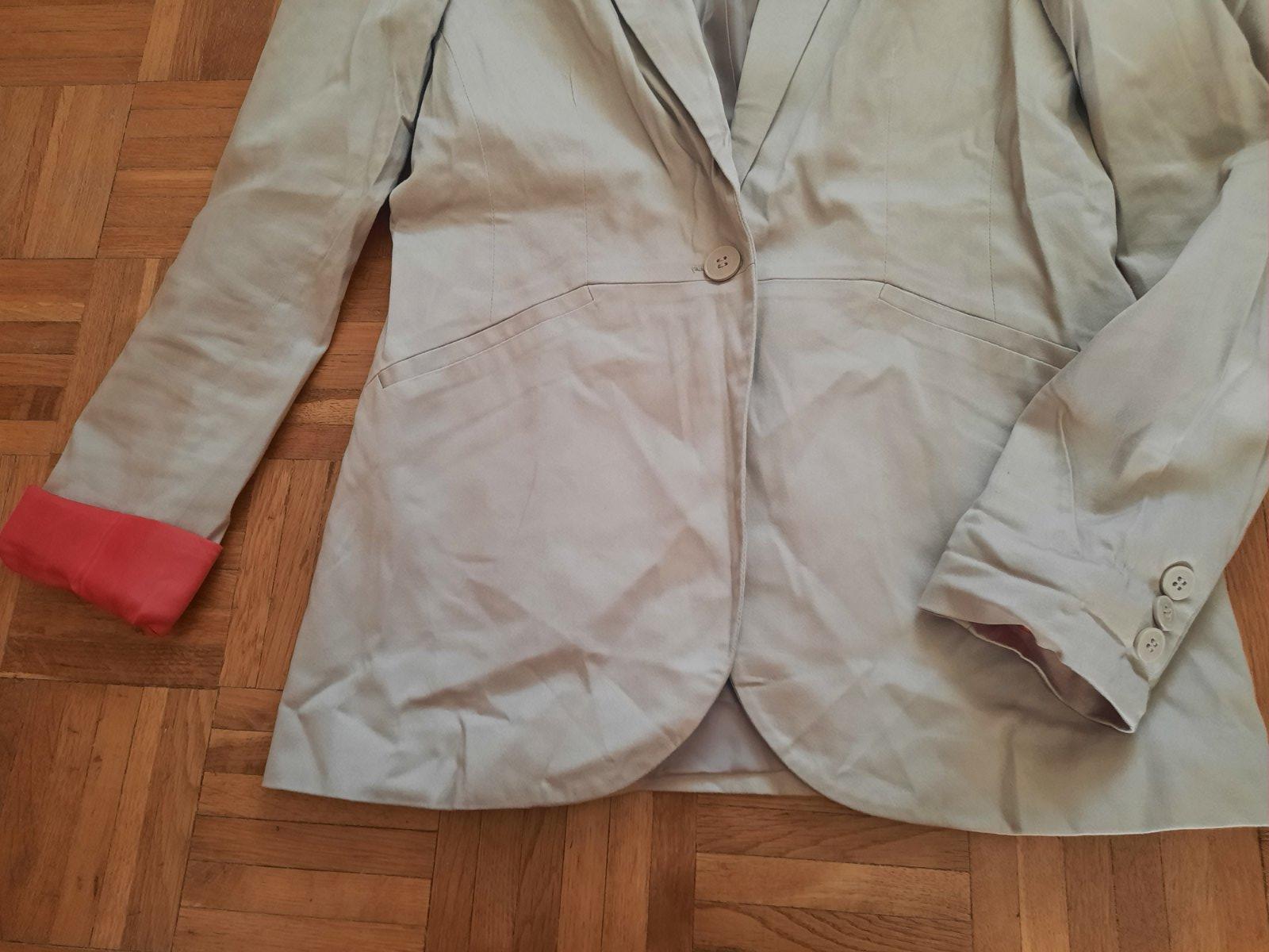 Super podšité sako, iba vypraté, nenosené. Aj vačky sú ešte zašité. Rukávy sú podšité farebnou ružovou látkou, dajú sa vyhrnúť a tak nosiť-super to vyzerá. Vzadu je malý rázporok.