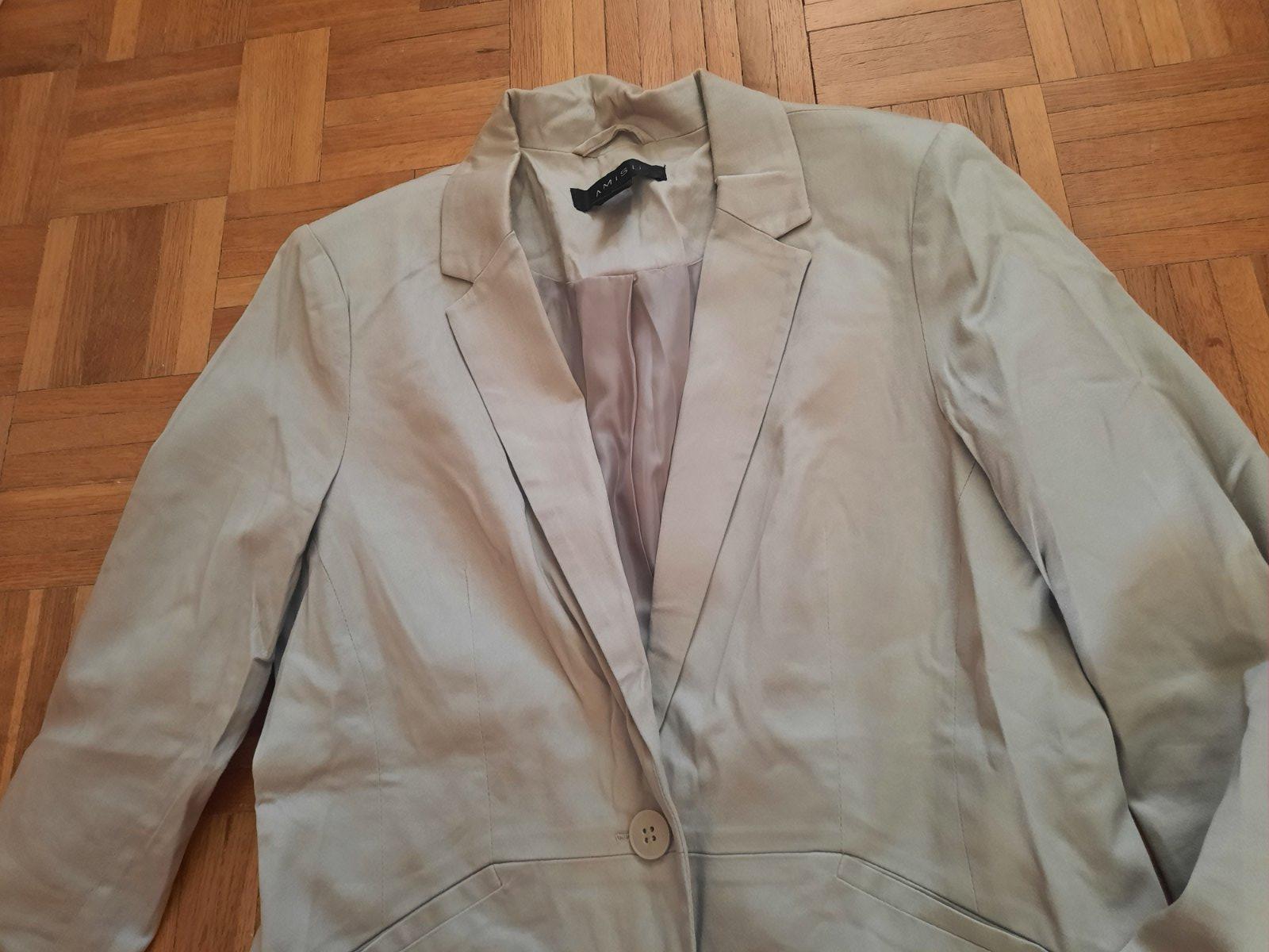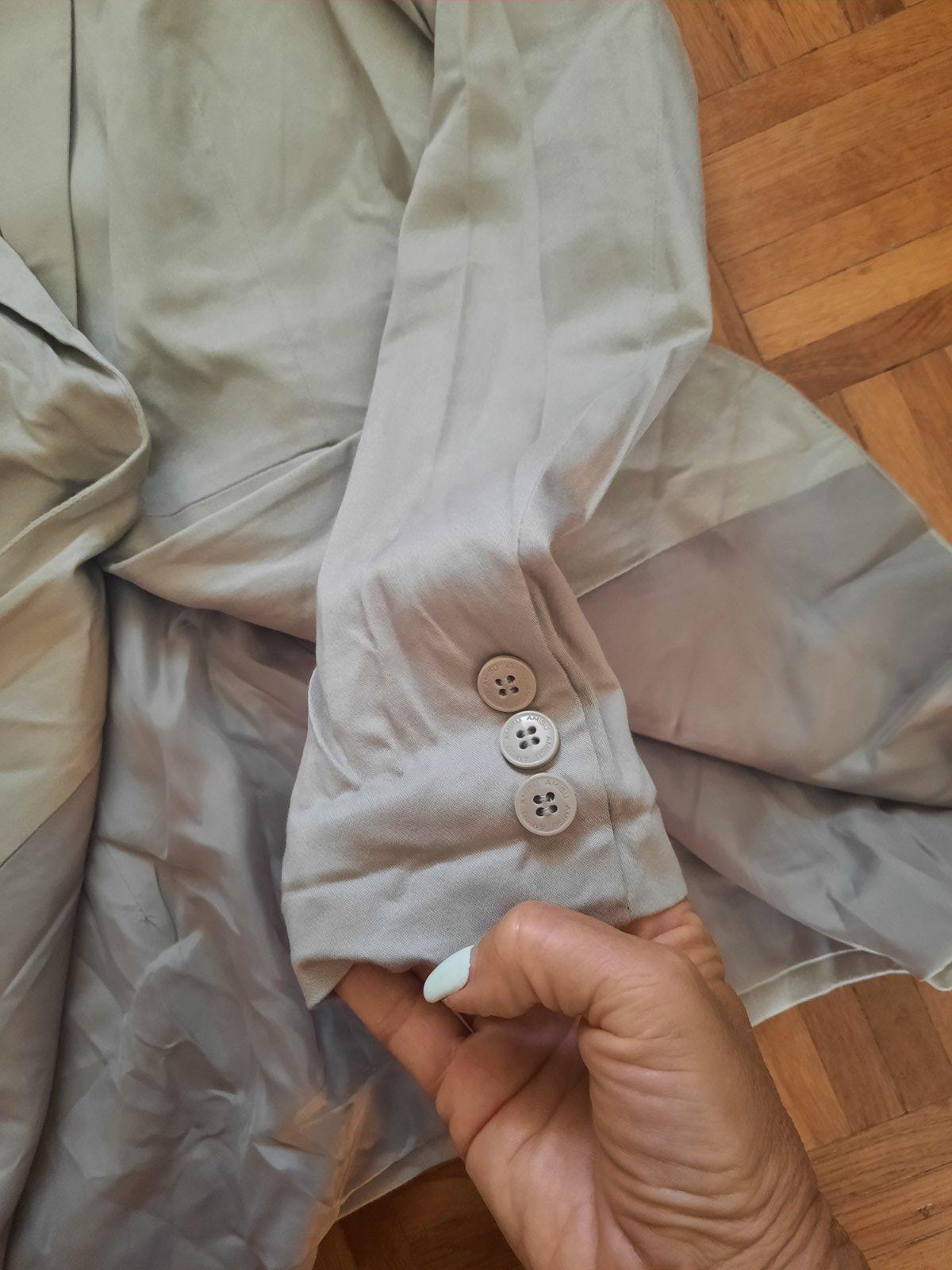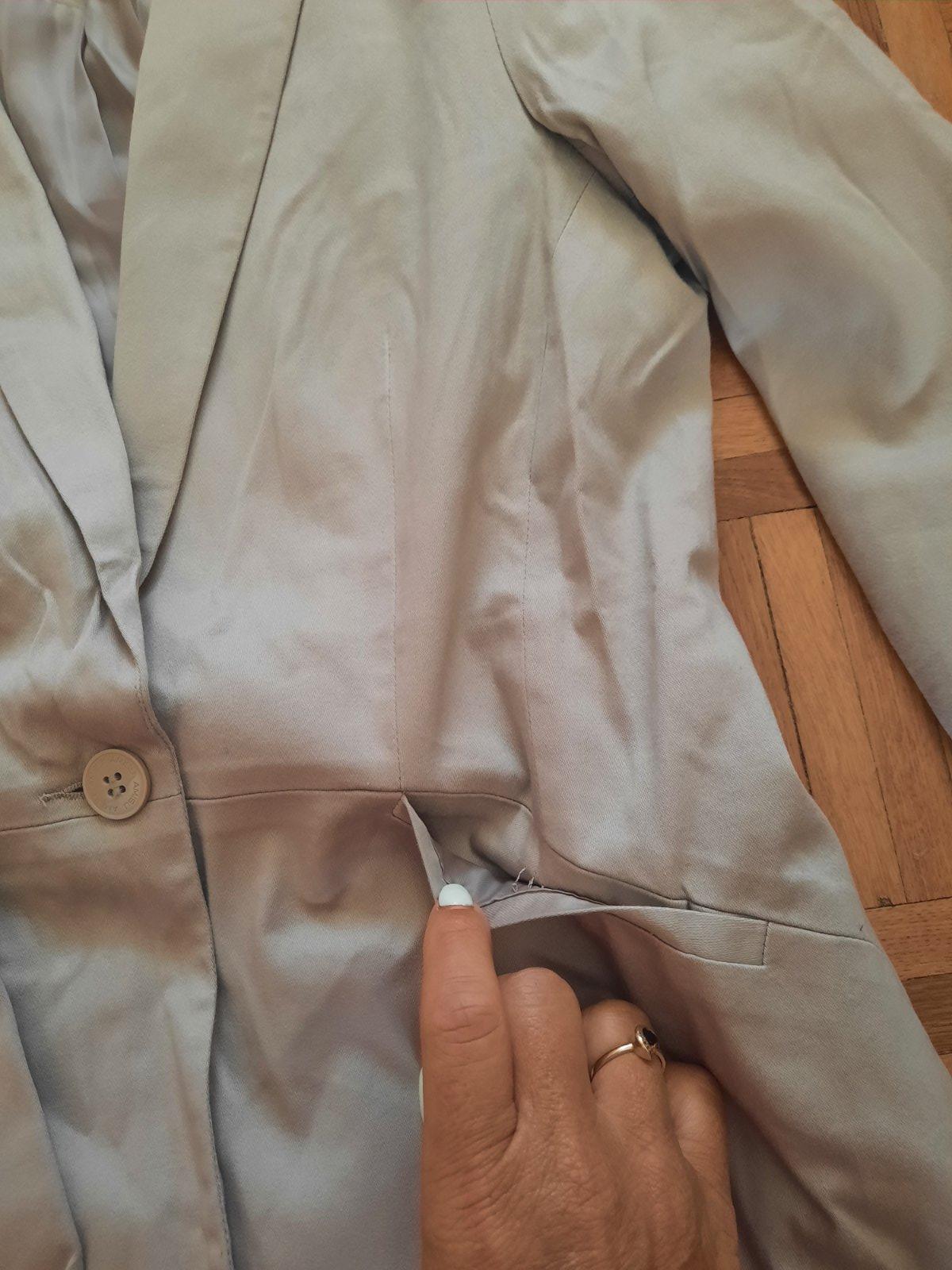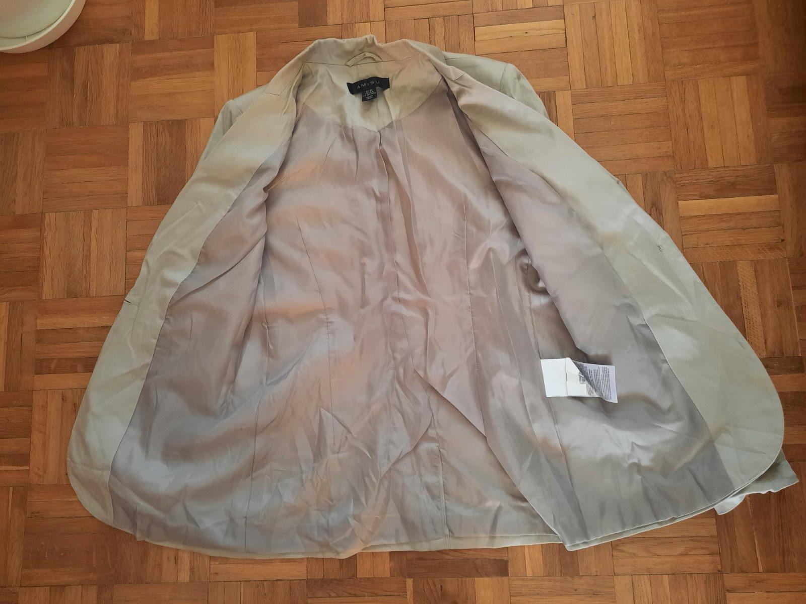 Super podšité sako, iba vypraté, nenosené. Aj vačky sú ešte zašité. Rukávy sú podšité farebnou ružovou látkou, dajú sa vyhrnúť a tak nosiť-super to vyzerá. Vzadu je malý rázporok.