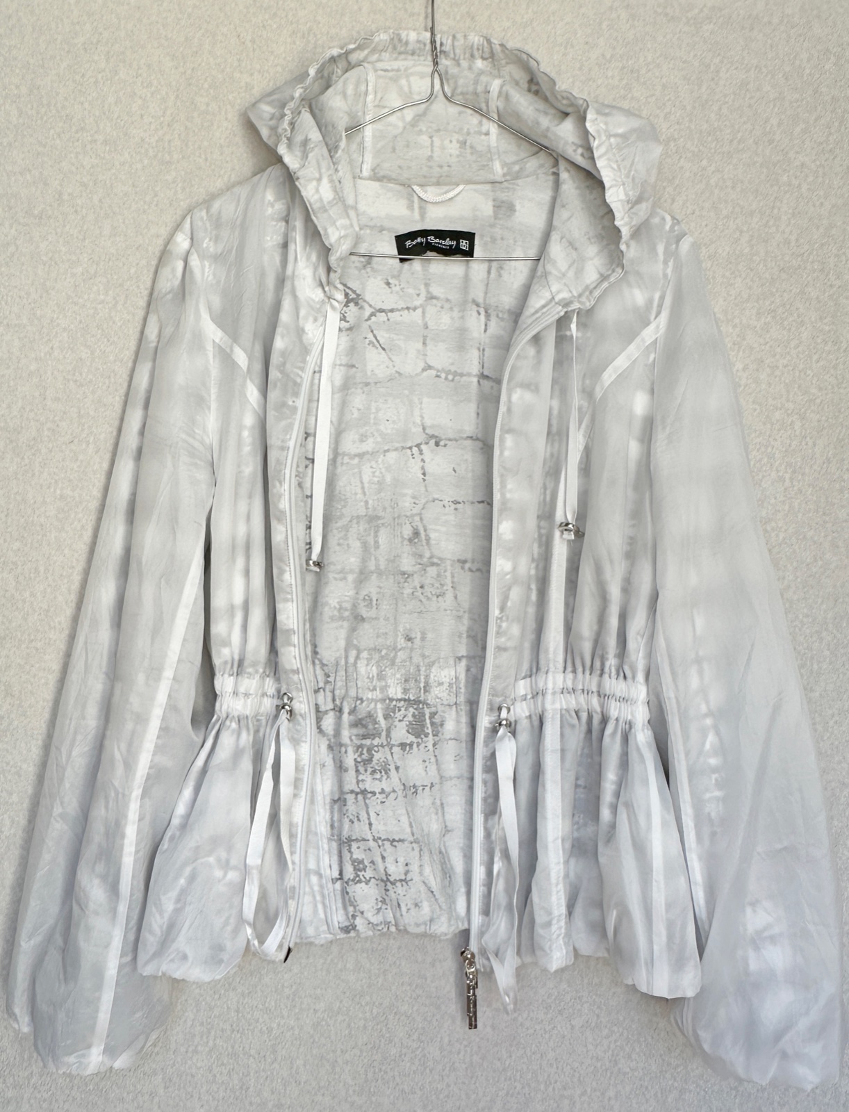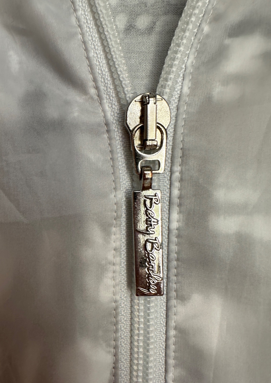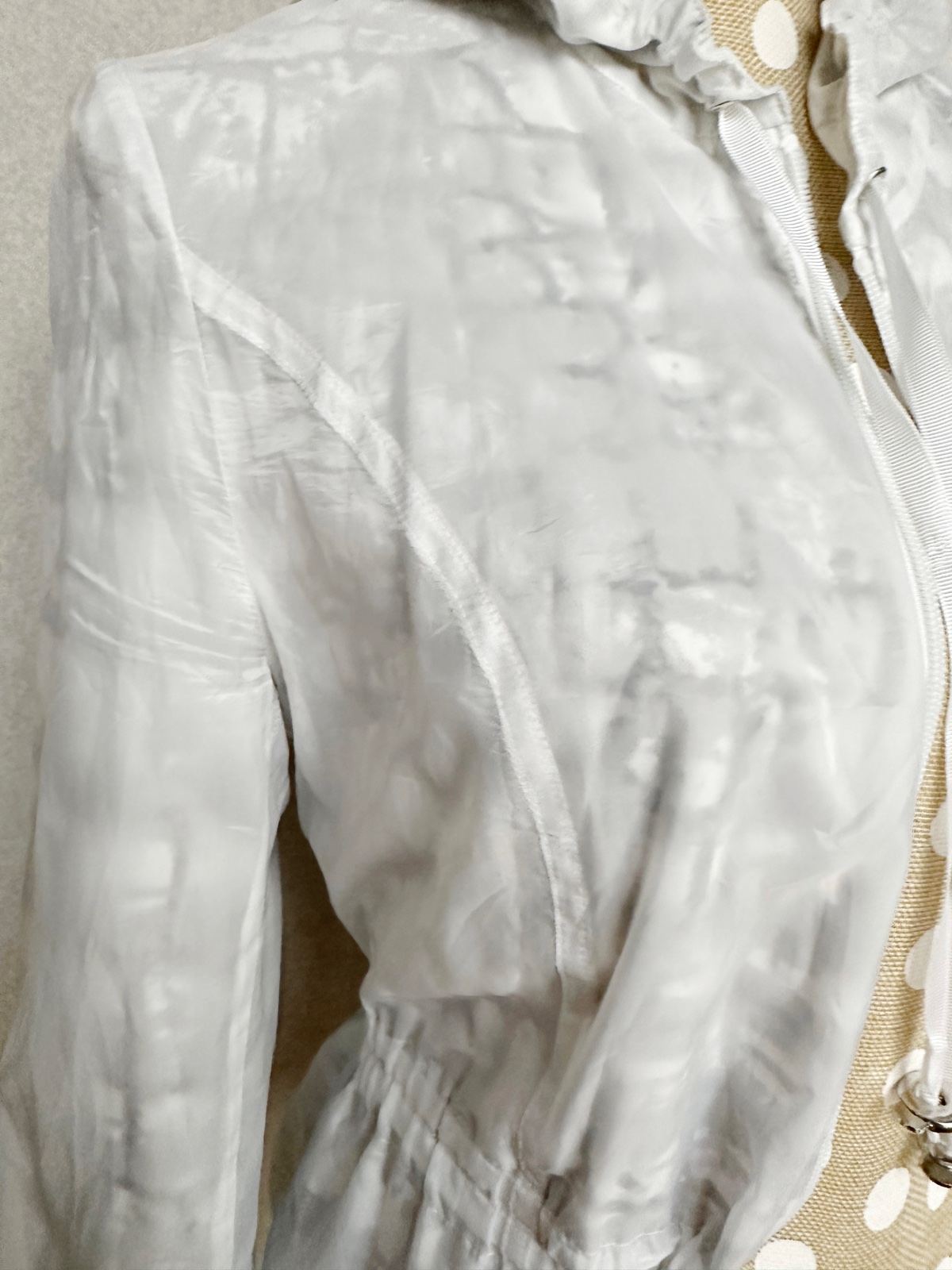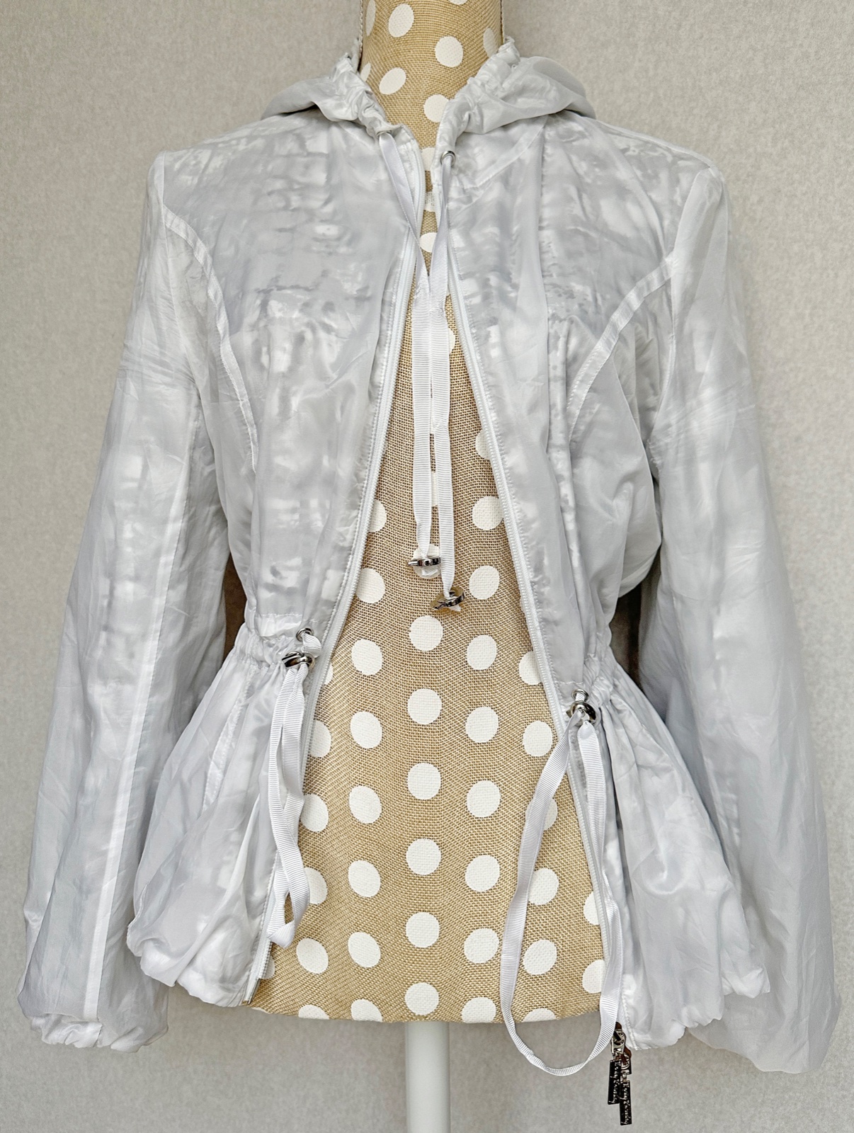 Príjemná bunda z ultra hebkého materiálu zvonku aj z vnútorenej strany. Je šitá z dvoch vrstiev - spodná je jemný bavlnený úplet s jemným svetlošedým vzorom, na nej je vrstva tenšej mierne trasparentnej látky, cez ktorú jemne presvitajú vzory. Naživo bunda pôsobí veľmi zaujímavo a unikátne. Má uťahovacie šnúrky v páse a v kapucni, uško na zavesenie, spodný lem (trup, rukávy) je jemne riasený do pružnej gumky, zapína sa na obojsmerný zips. Kovové doplnky - bežce, stopery, kovové dierky sú v lesklej striebornej.