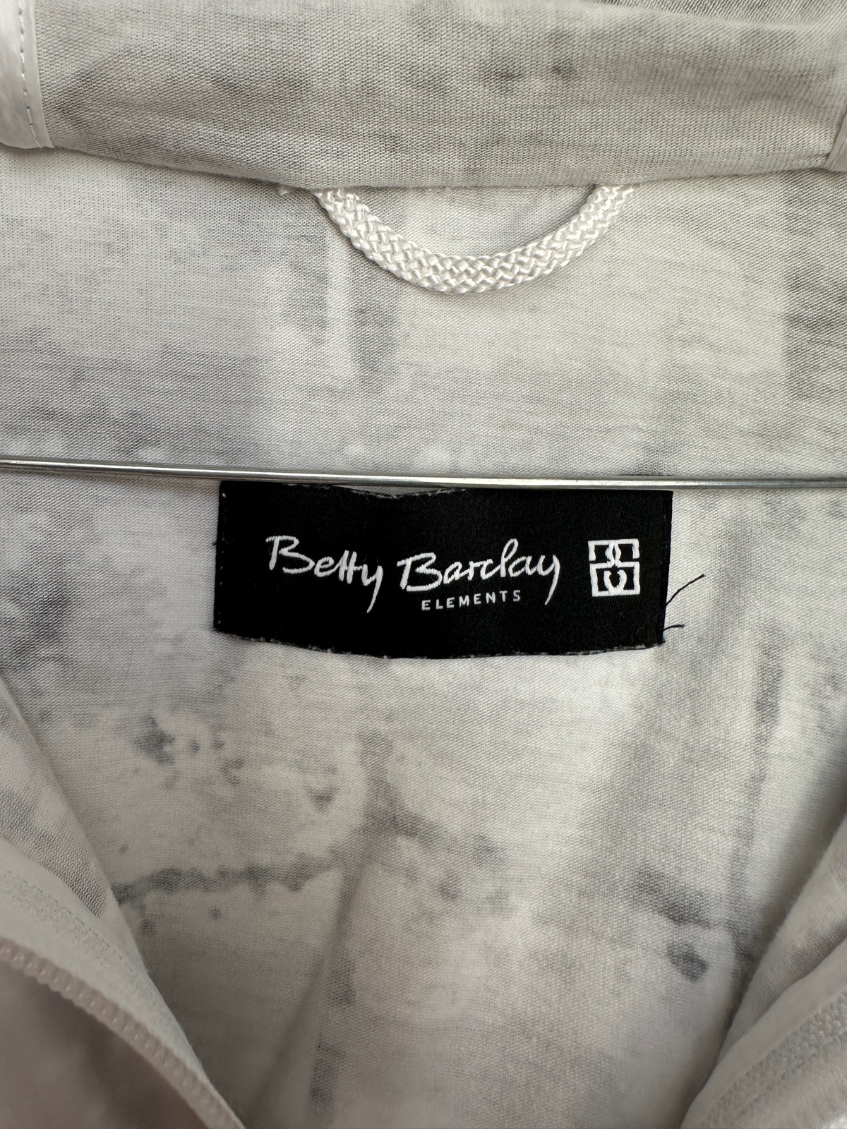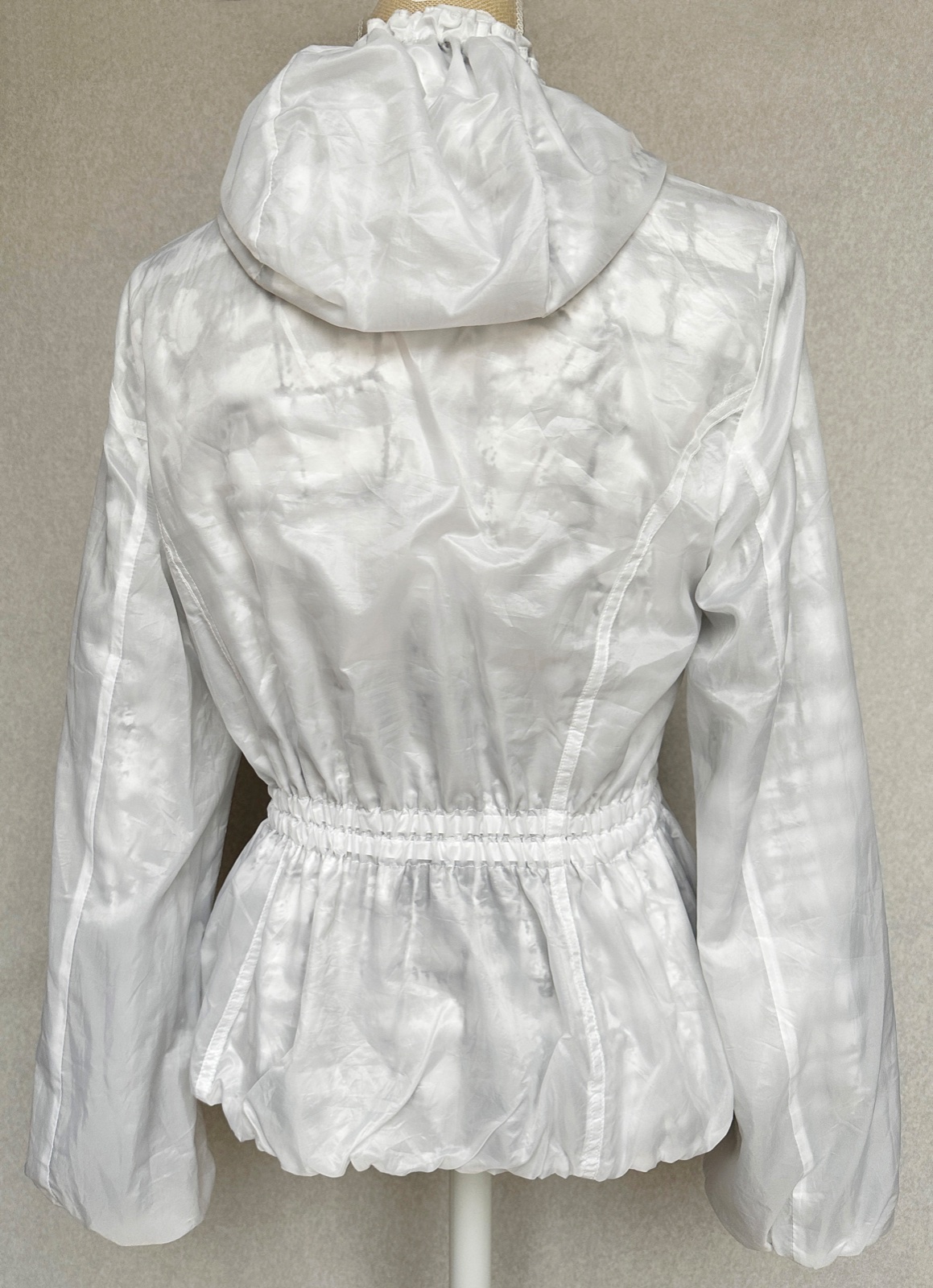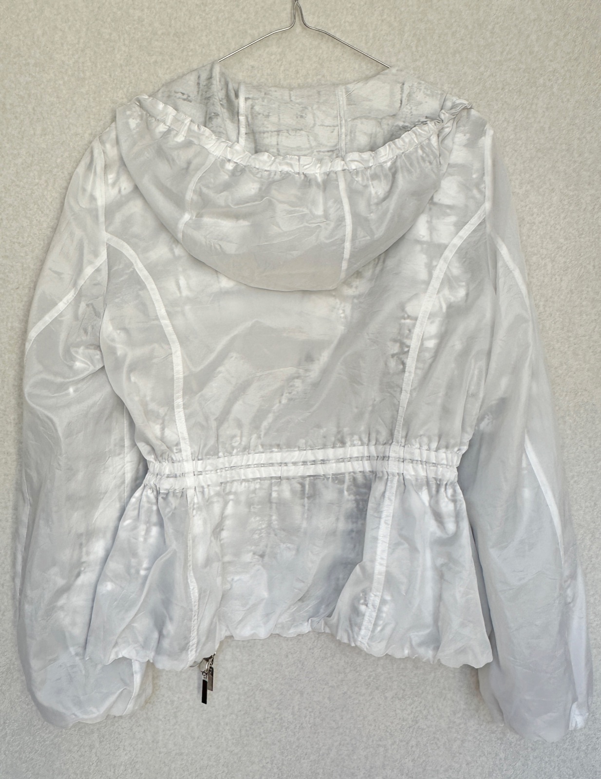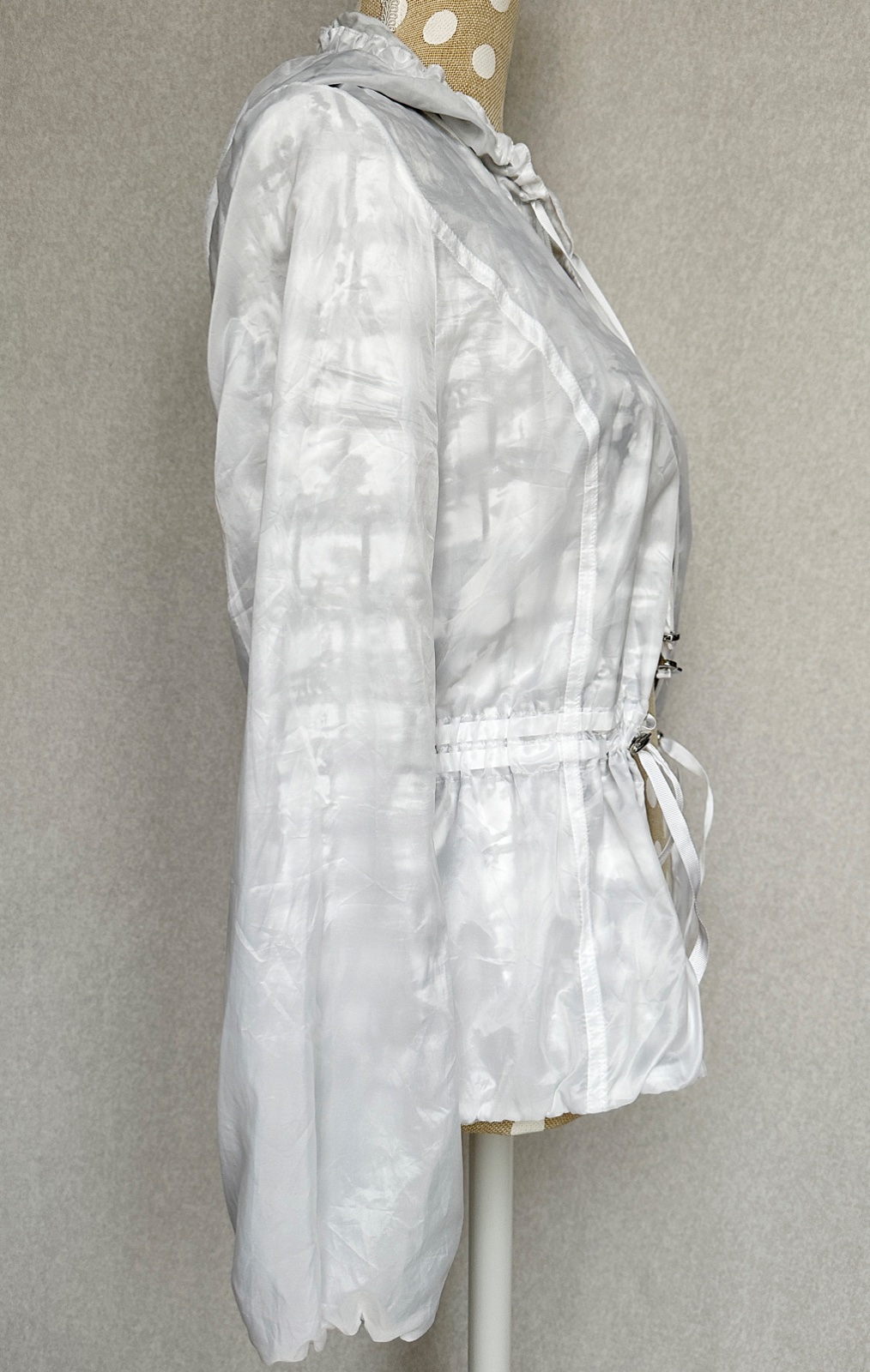Príjemná bunda z ultra hebkého materiálu zvonku aj z vnútorenej strany. Je šitá z dvoch vrstiev - spodná je jemný bavlnený úplet s jemným svetlošedým vzorom, na nej je vrstva tenšej mierne trasparentnej látky, cez ktorú jemne presvitajú vzory. Naživo bunda pôsobí veľmi zaujímavo a unikátne. Má uťahovacie šnúrky v páse a v kapucni, uško na zavesenie, spodný lem (trup, rukávy) je jemne riasený do pružnej gumky, zapína sa na obojsmerný zips. Kovové doplnky - bežce, stopery, kovové dierky sú v lesklej striebornej.