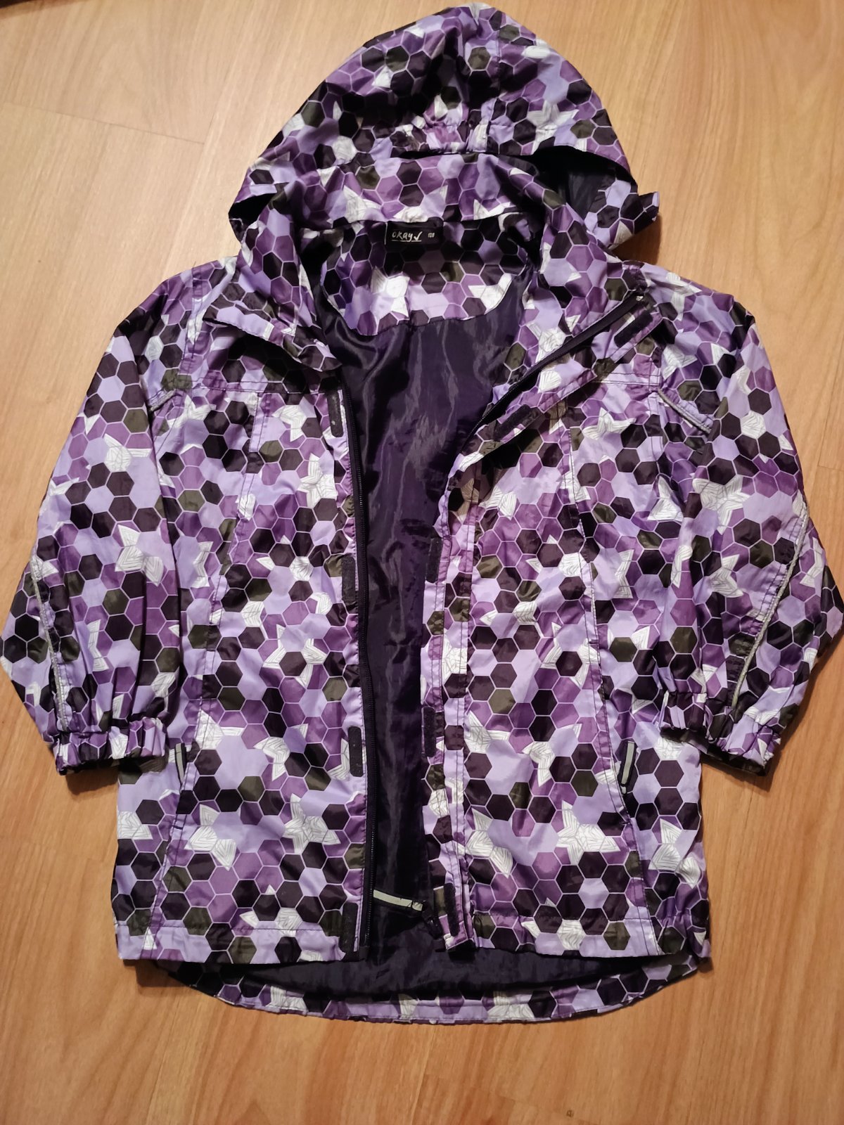 Tenká prechodná vetrovka, nosená viac sezón, aj ako 134.. šírka 44 cm, dĺžka rukáva od krku 56 cm, dĺžka vetrovky 66cm.