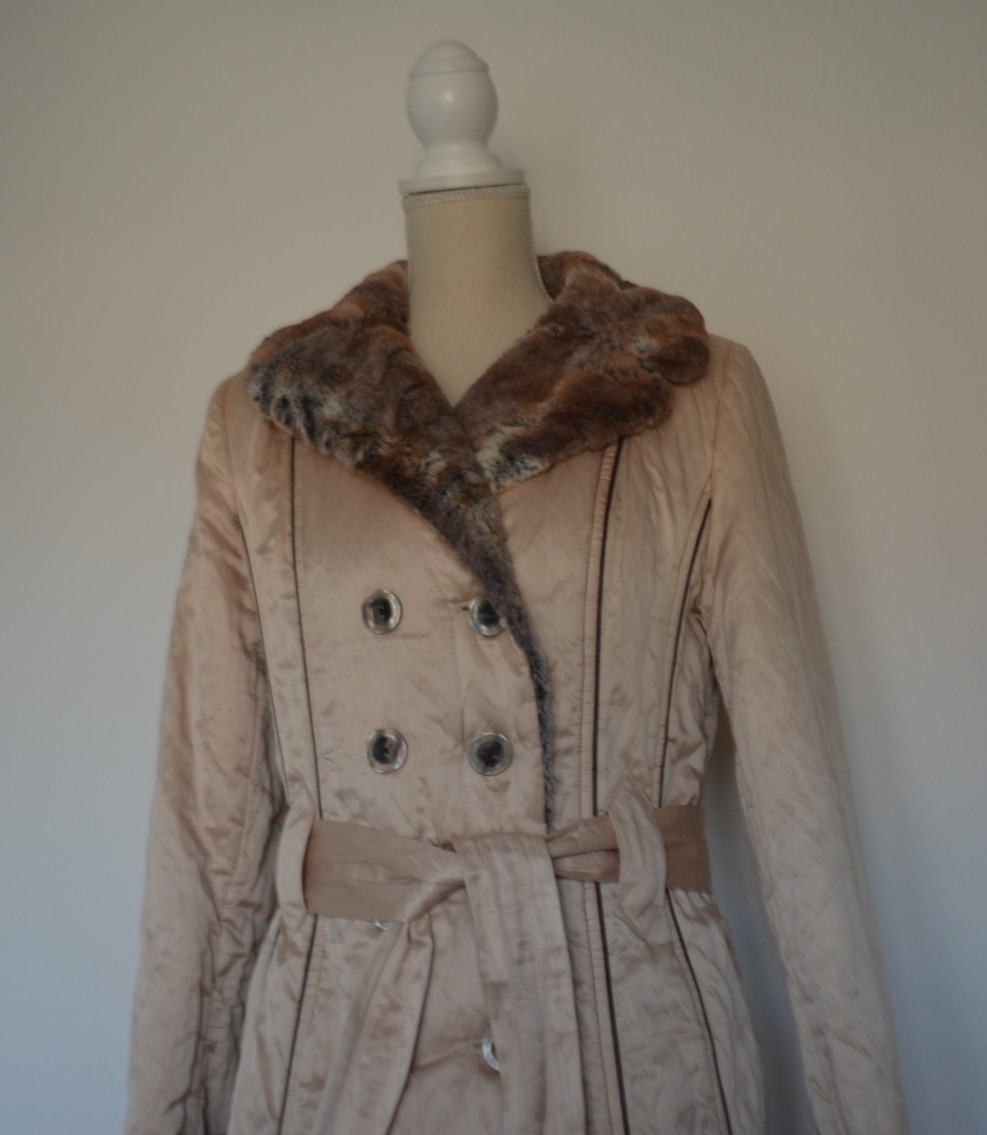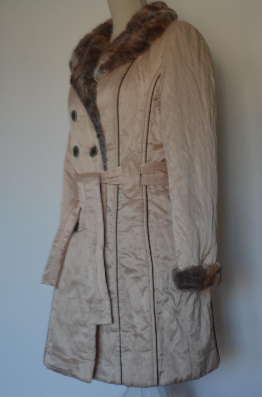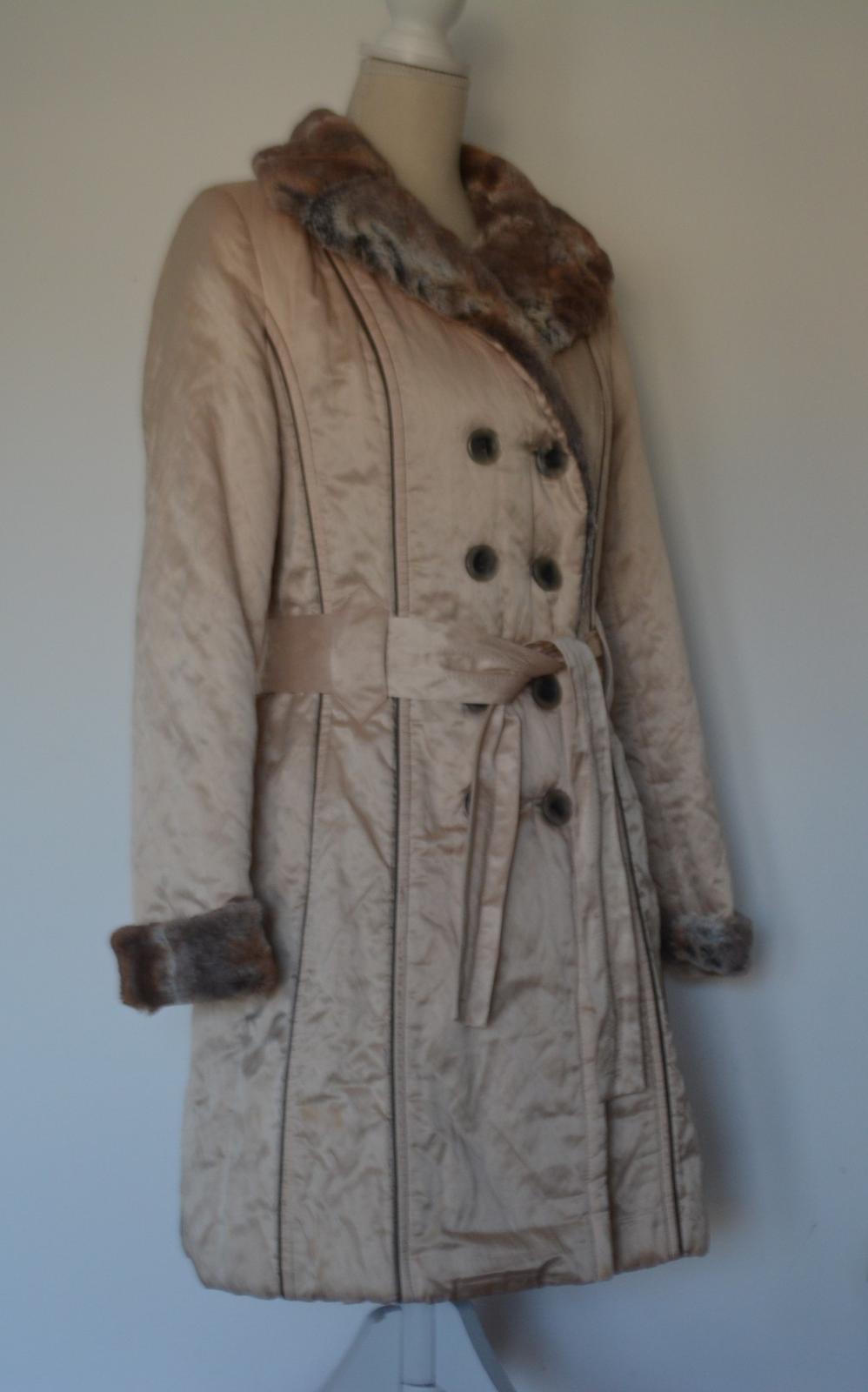 Dlhšia dámska bunda, zn. Texhal, veľ. 40/M, rozmery: dlžka 90cm, pod pazuchami 2x51cm, rukáv od krku 80, od pleca 60 a od pazuchy 45cm -rukávy sa dajú vyhrnúť alebo spustiť podľa potreby. Lemovanie goliera a spodok rukávov je z pravej kožušinky.