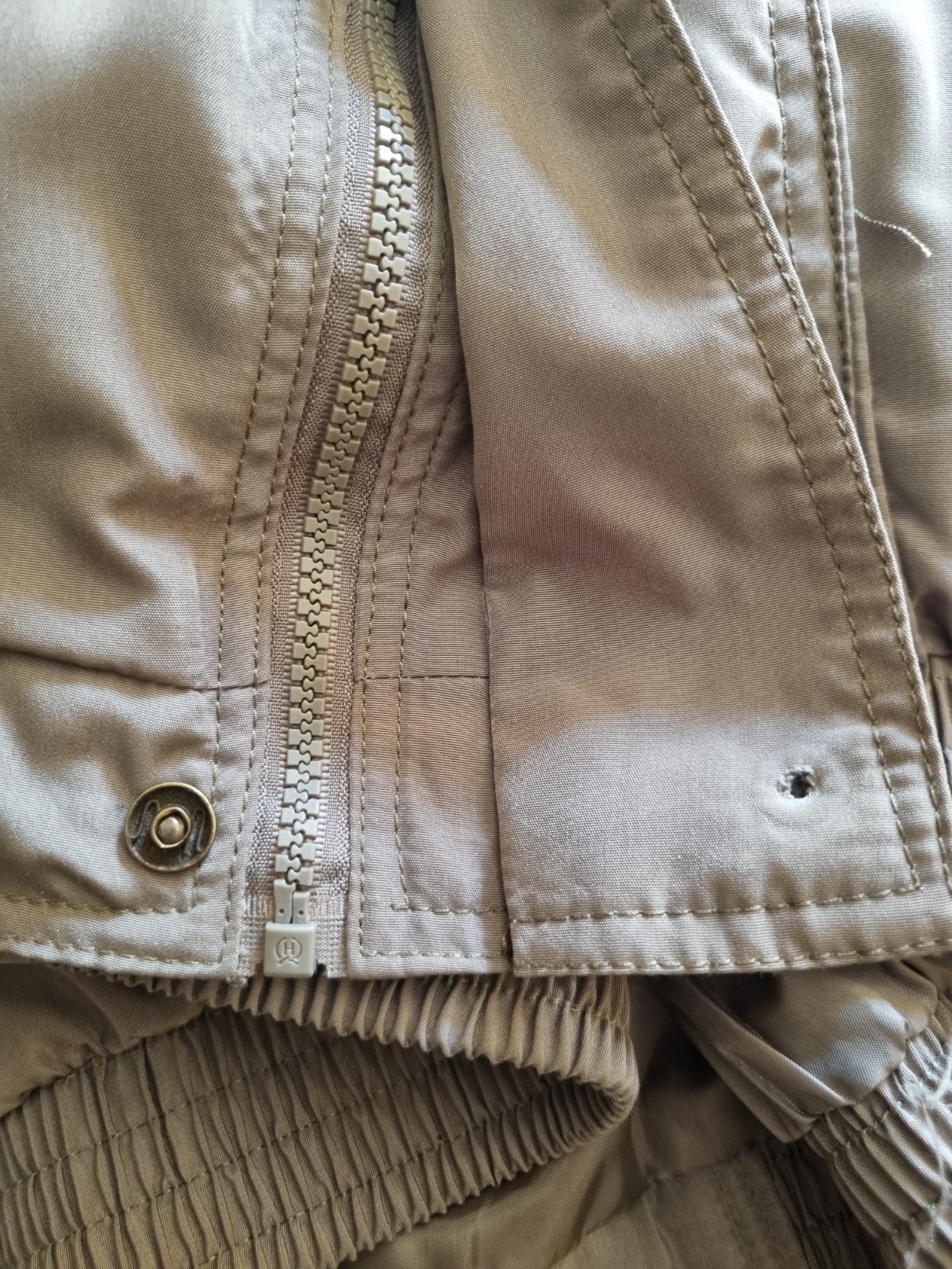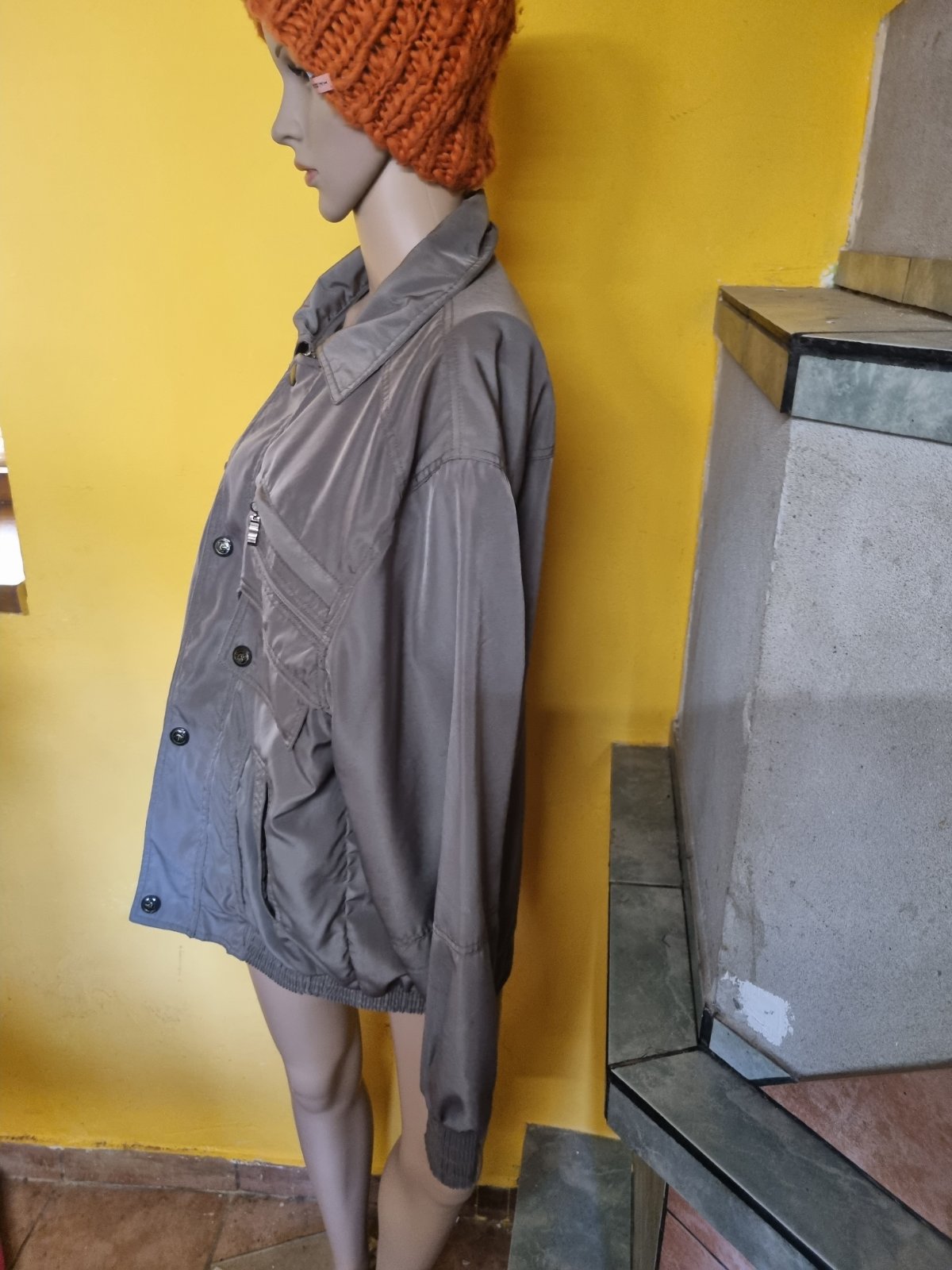 Olivovo šedá pánska bunda na prechodné obdobie. Na spodu je odtrhnutý cvok viď foto. Zapínanie je vpredu na zips a cvoky. Dĺžka je 70cm,obvod hrudníka je 120cm a obvod pása je 118cm.Dĺžka rukáva je od krku 118cm.
