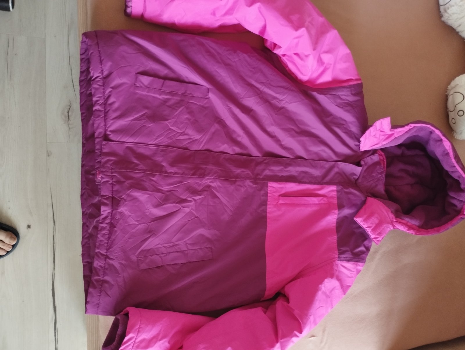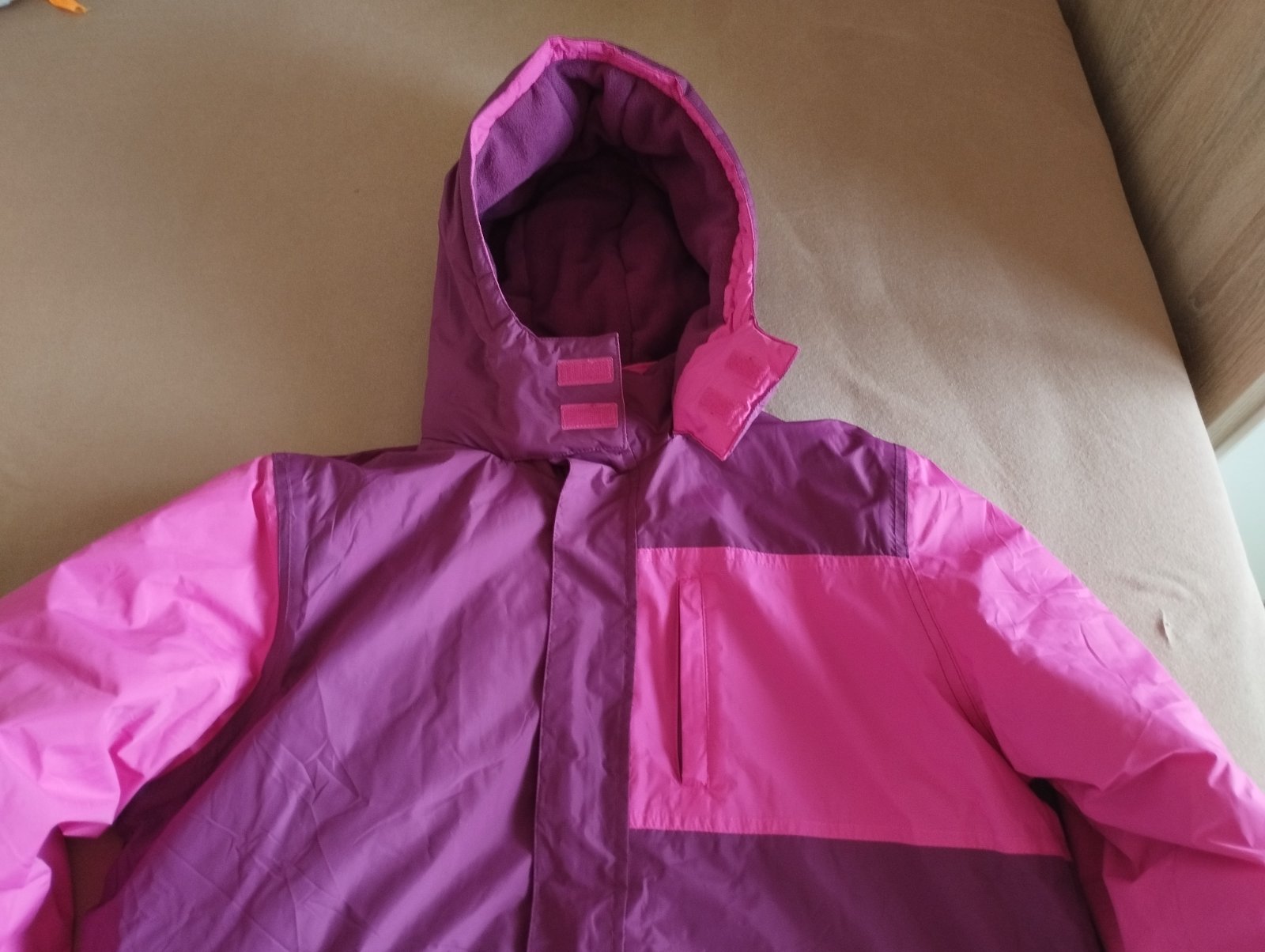 Parádna bunda na ľahšiu zimu aj prechod. Nepremokavá. Kapucňa odnímateľná, rukávy zakončené manžetou,Kupila som pre dcérku ale odmieta tuto farbu. Rukáv od krku po koniec manžety 78cm, dĺžka ruká...