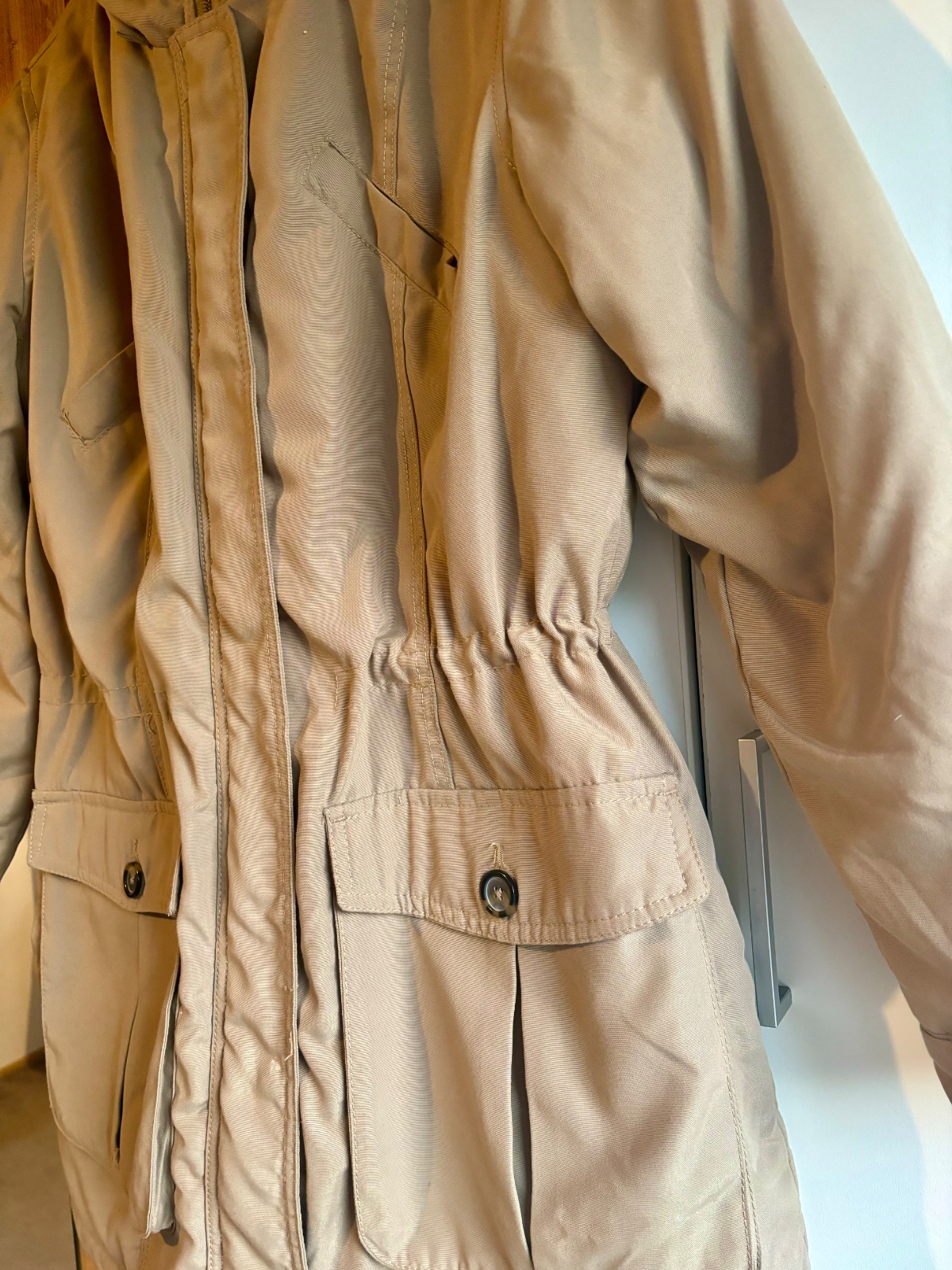 Presivana vetrovka velkost 44 ,dlha je 70cm ,ma vyvyseny golier 13cm ,,rukav od krku 73cm a cez prsia ma 55x2 ,bez poskodenia