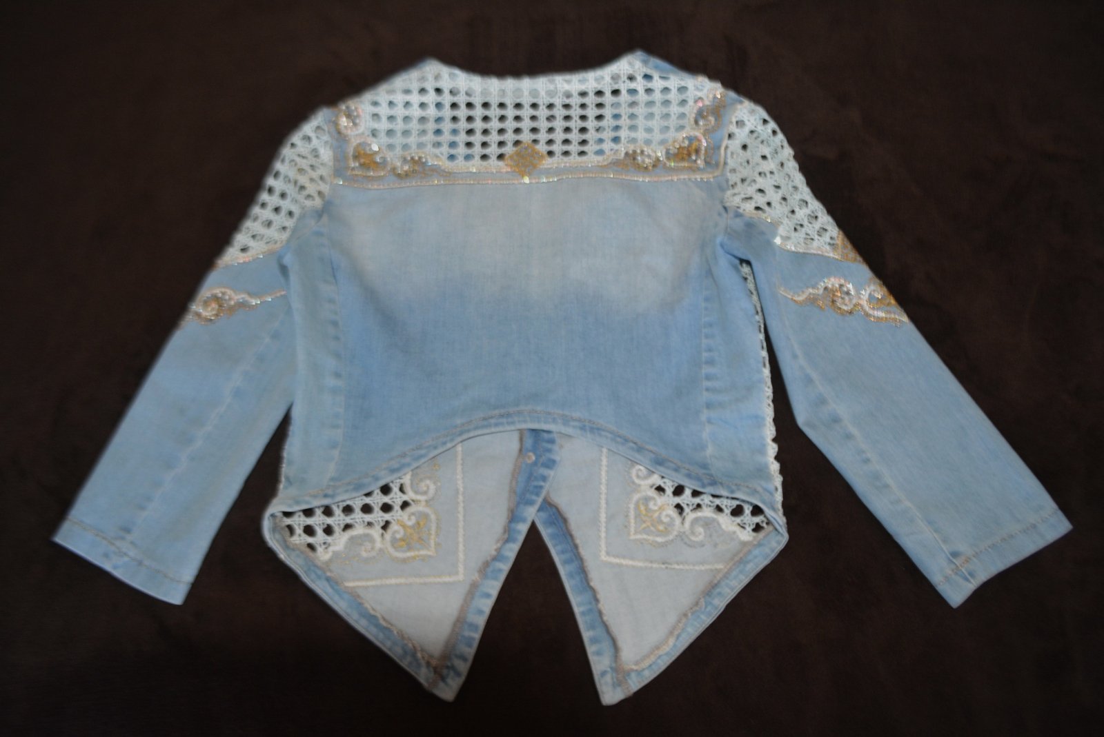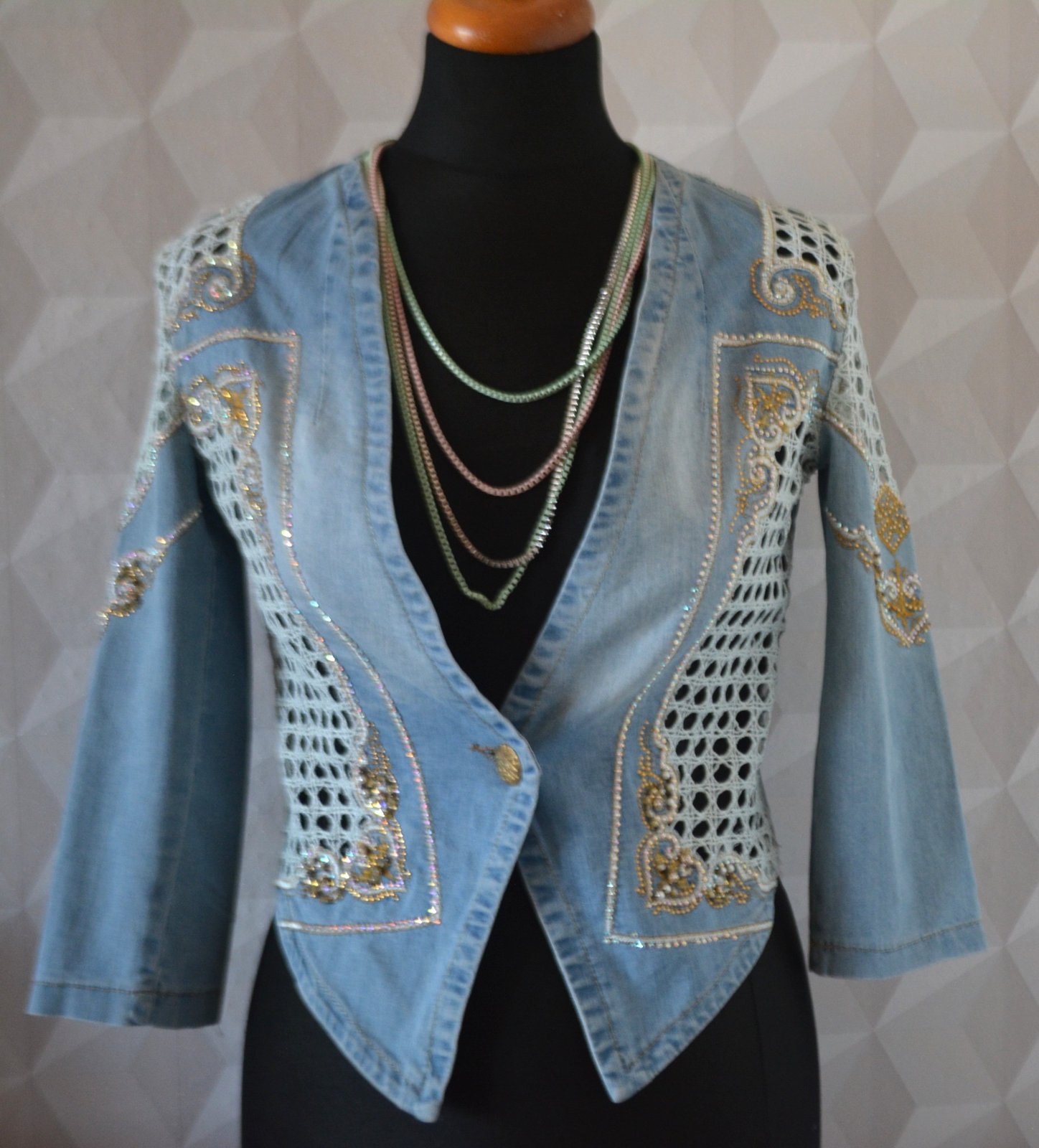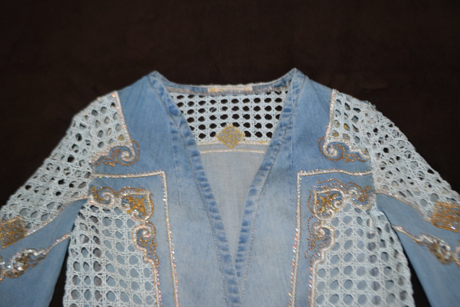 Krásne riflové sačko Raw Couture, veľ. XS, rozmery: dĺžka po špic vpredu 54cm, vzadu je kratšie - dĺžka 33cm. Pod pazuchami 2x44cm, rukáv je 3/4 dĺžky, od pleca 43 a od pazuchy 31cm.