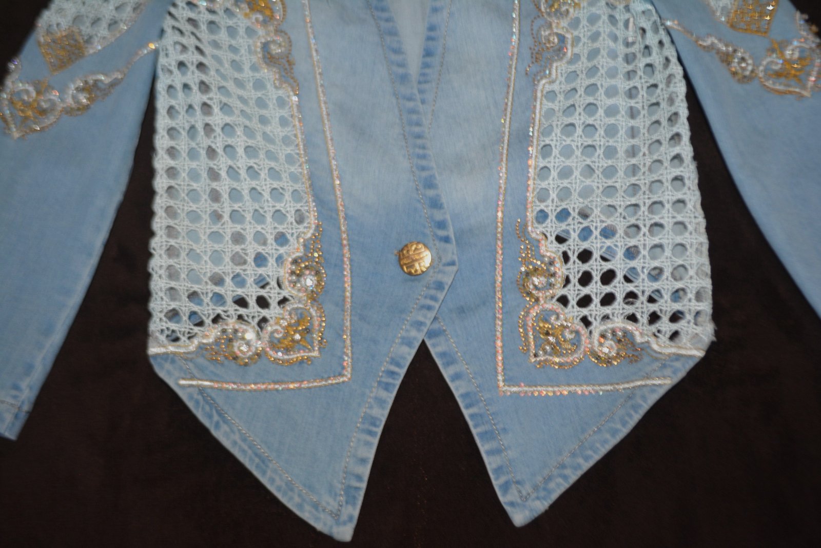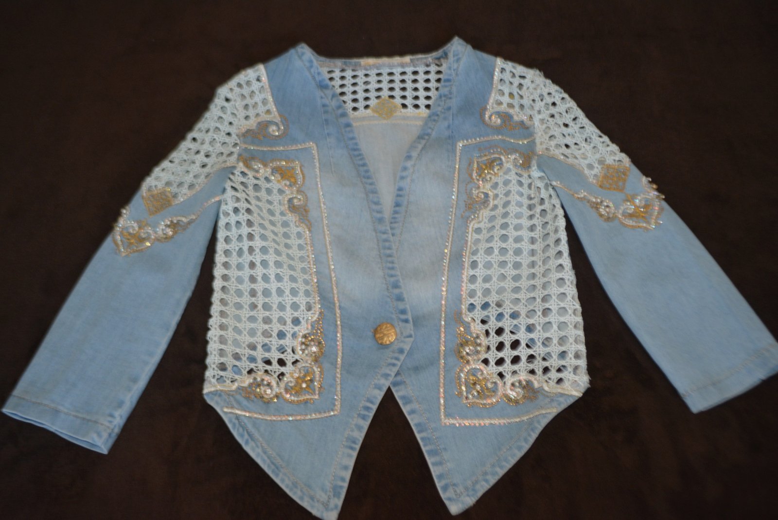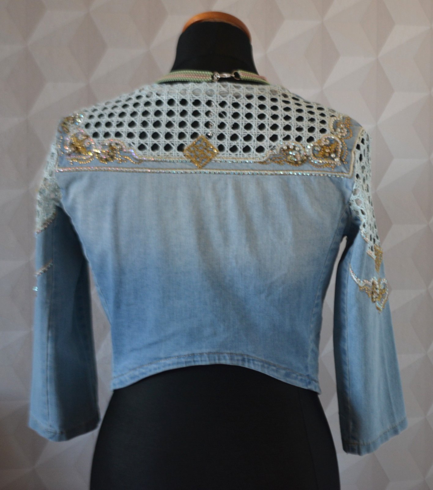Krásne riflové sačko Raw Couture, veľ. XS, rozmery: dĺžka po špic vpredu 54cm, vzadu je kratšie - dĺžka 33cm. Pod pazuchami 2x44cm, rukáv je 3/4 dĺžky, od pleca 43 a od pazuchy 31cm.