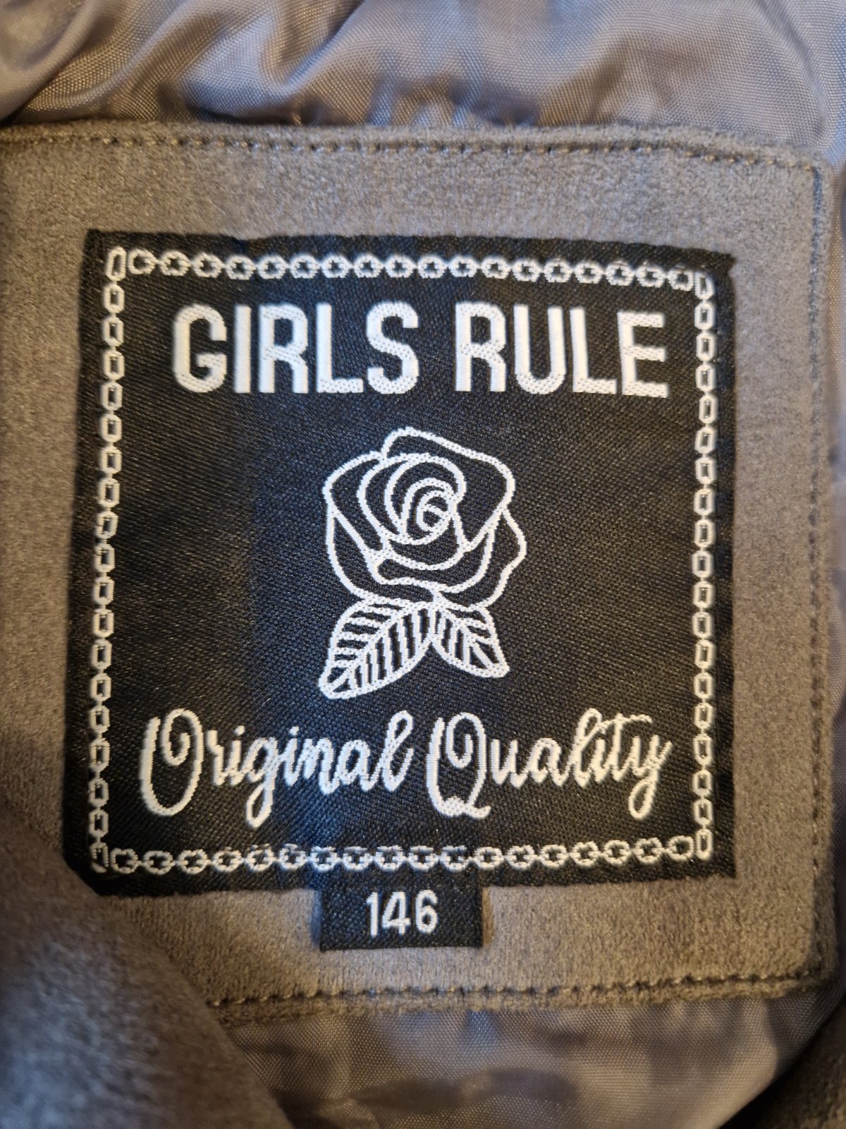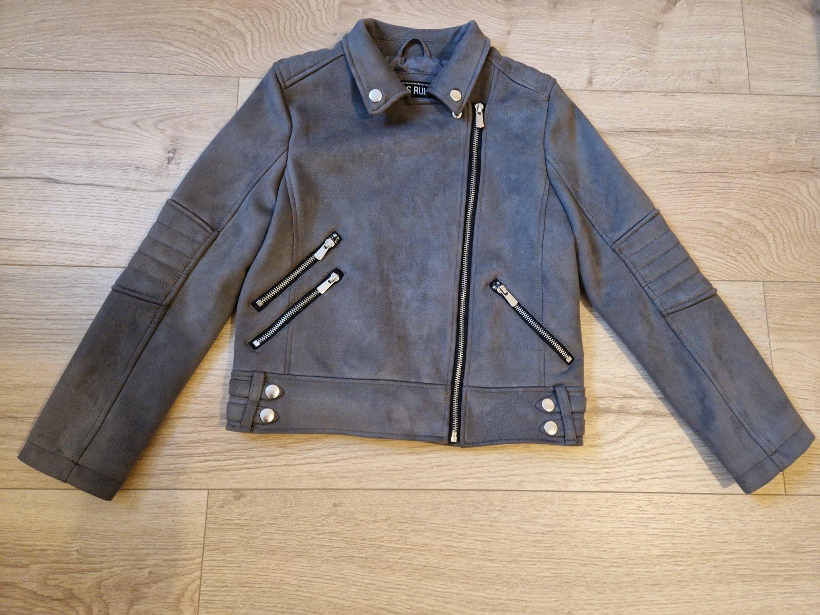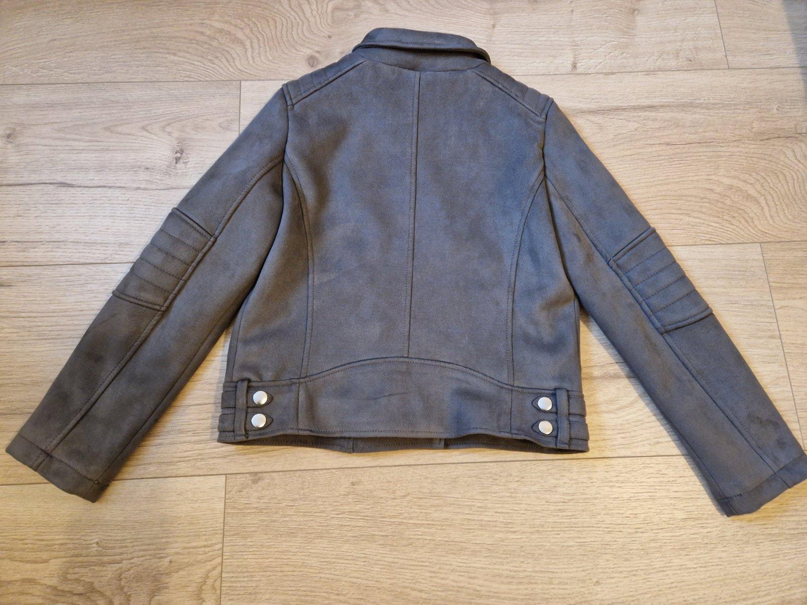 Nadherna bunda efekt rezanej koze, prijemna, makka, moderna. Podsivka tiez siva, zipsy, cvoky. C&A, 146. Dlzka 47cm, rukav 51cm, sedielko 9cm.