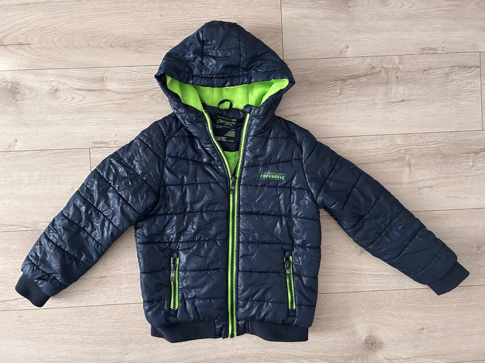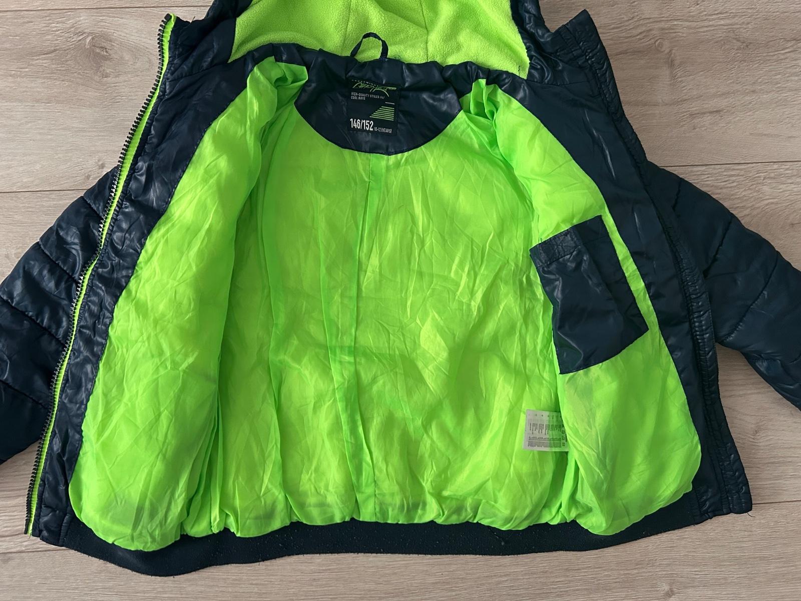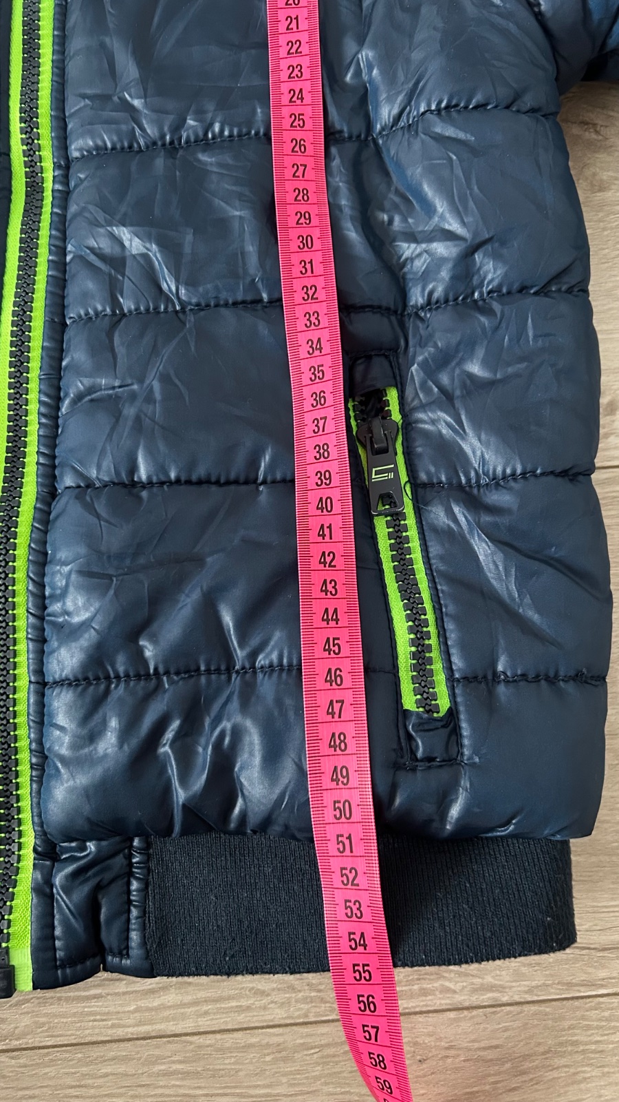 Tmavomodrá bunda s neónovozeleným zipsom a podšívkou.