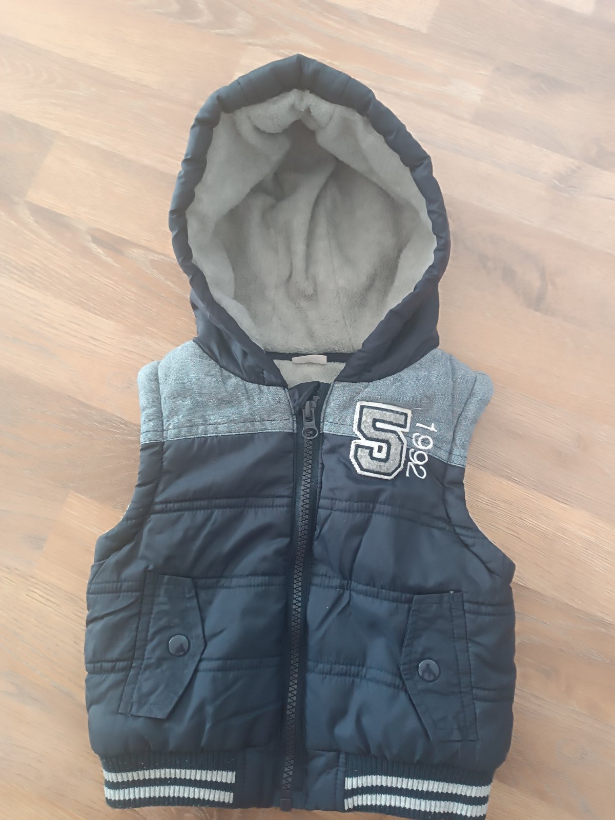 Zateplená vestička s kapucňou, na zips. Veľkosť 12-18 mesiacov.