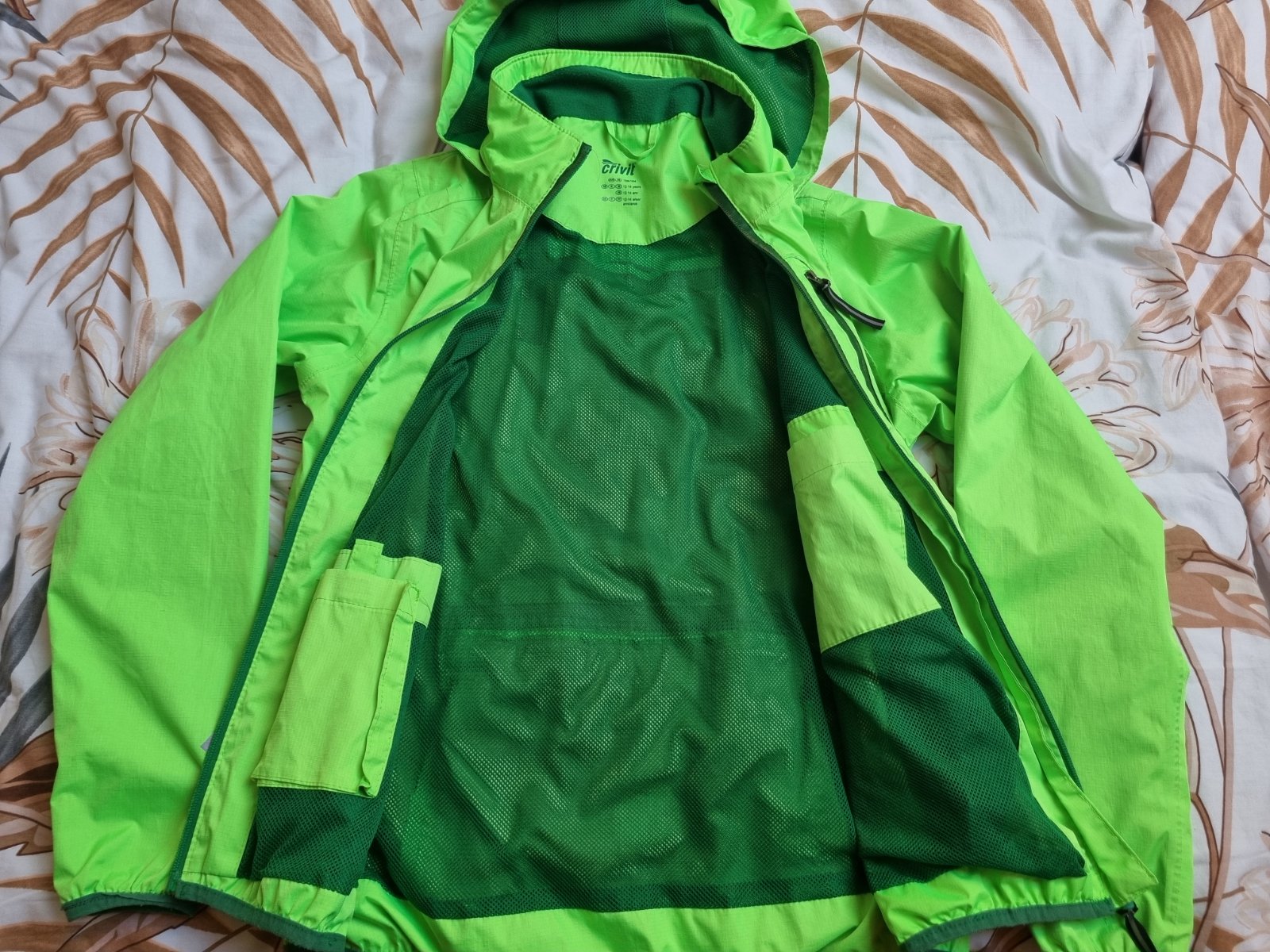 Detská bunda na športovanie svetlozelenej farby zn. CRIVIT, veľkosť 158/164 (12-14 rokov) so zapínaním na zips. Bunda má kapucňu, 3 vonkajšie vrecká na zips a 2 vnútorné vrecká na suchý zips.