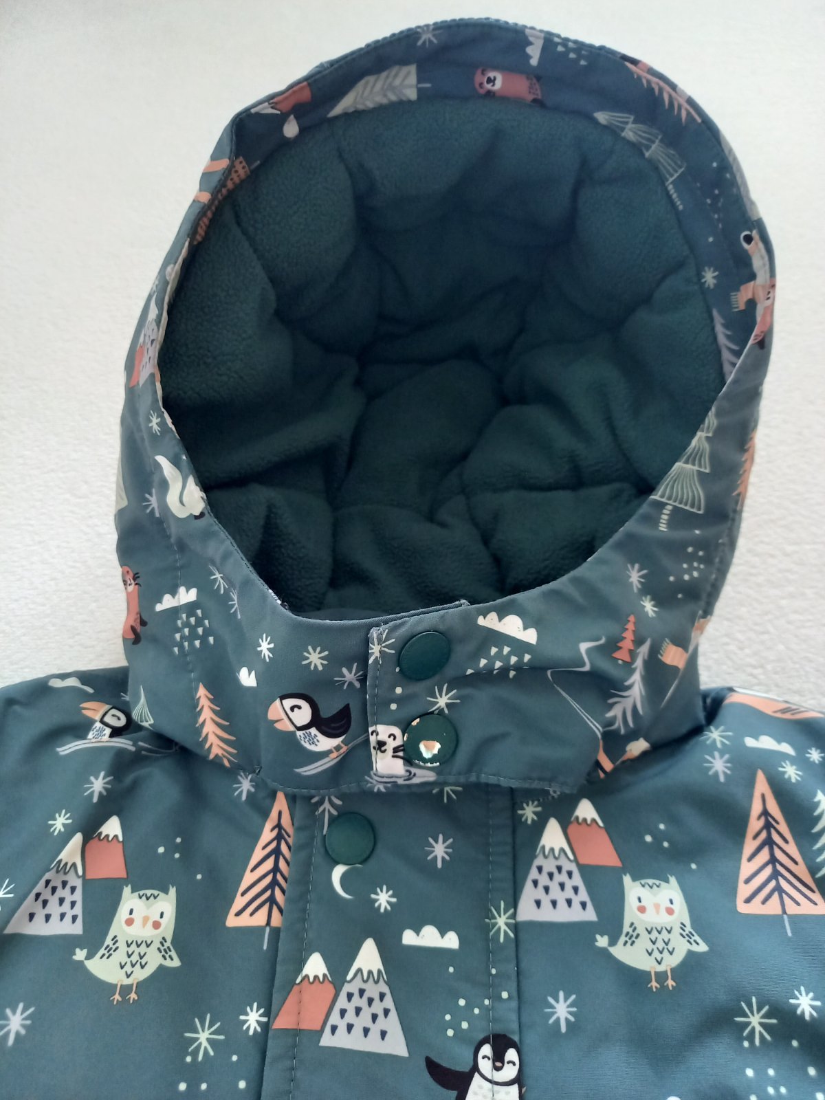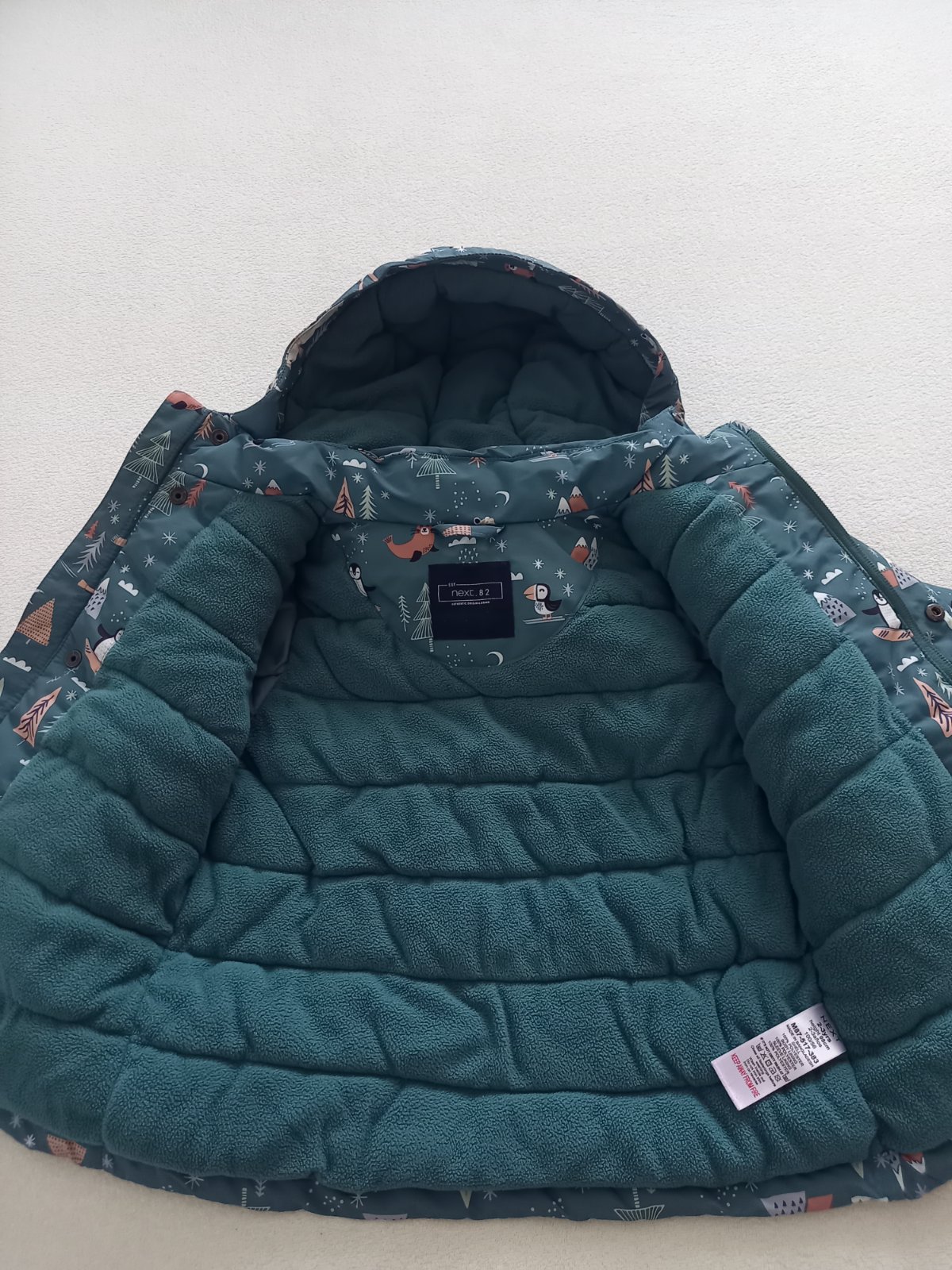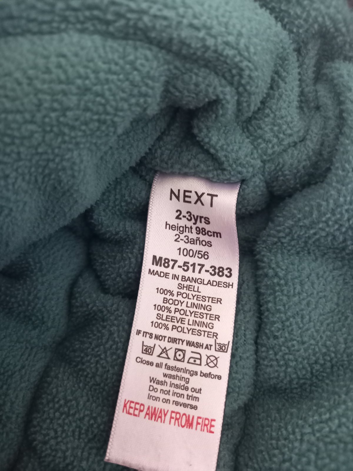 velkost udaná ako 110,sedí alen len na 98 podla mna..... nosená len nami,malý ju velmi rád nosil,takže bola aj častejšie praná.,..vidno to na farbe už trošku a ošuchaných bombíkoch..je nezateplen...