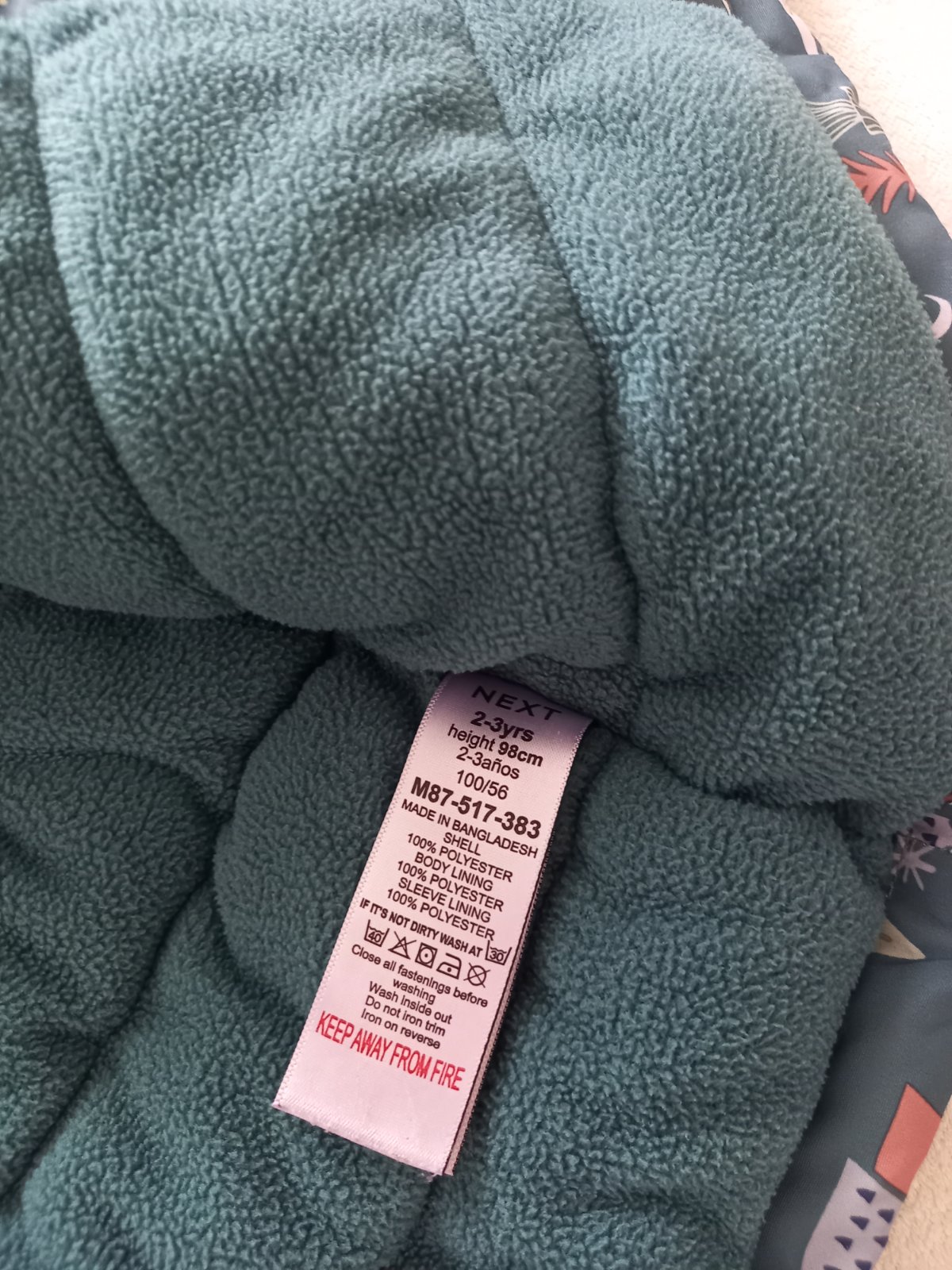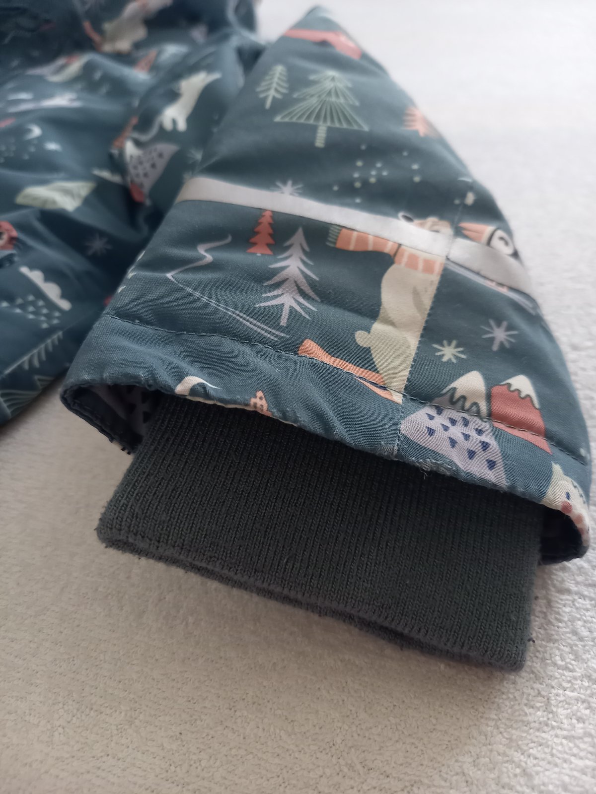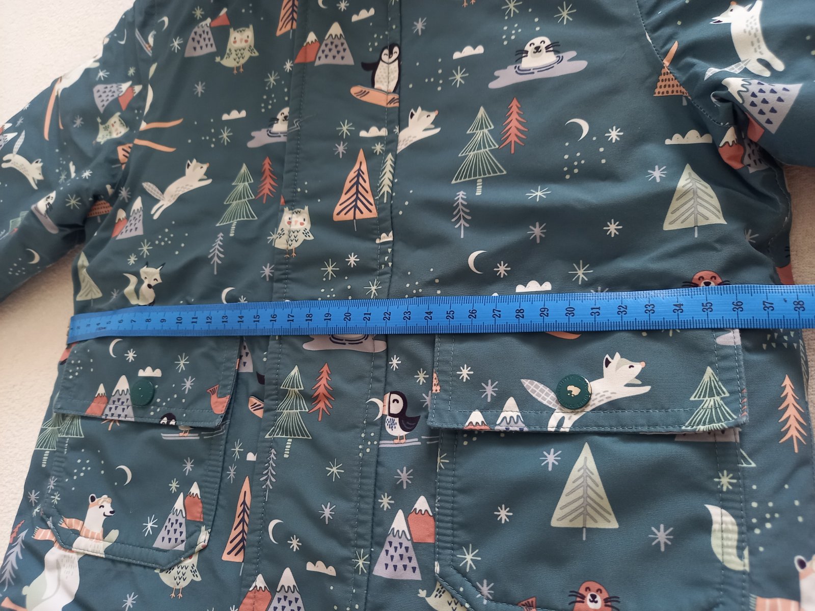 velkost udaná ako 110,sedí alen len na 98 podla mna..... nosená len nami,malý ju velmi rád nosil,takže bola aj častejšie praná.,..vidno to na farbe už trošku a ošuchaných bombíkoch..je nezateplen...