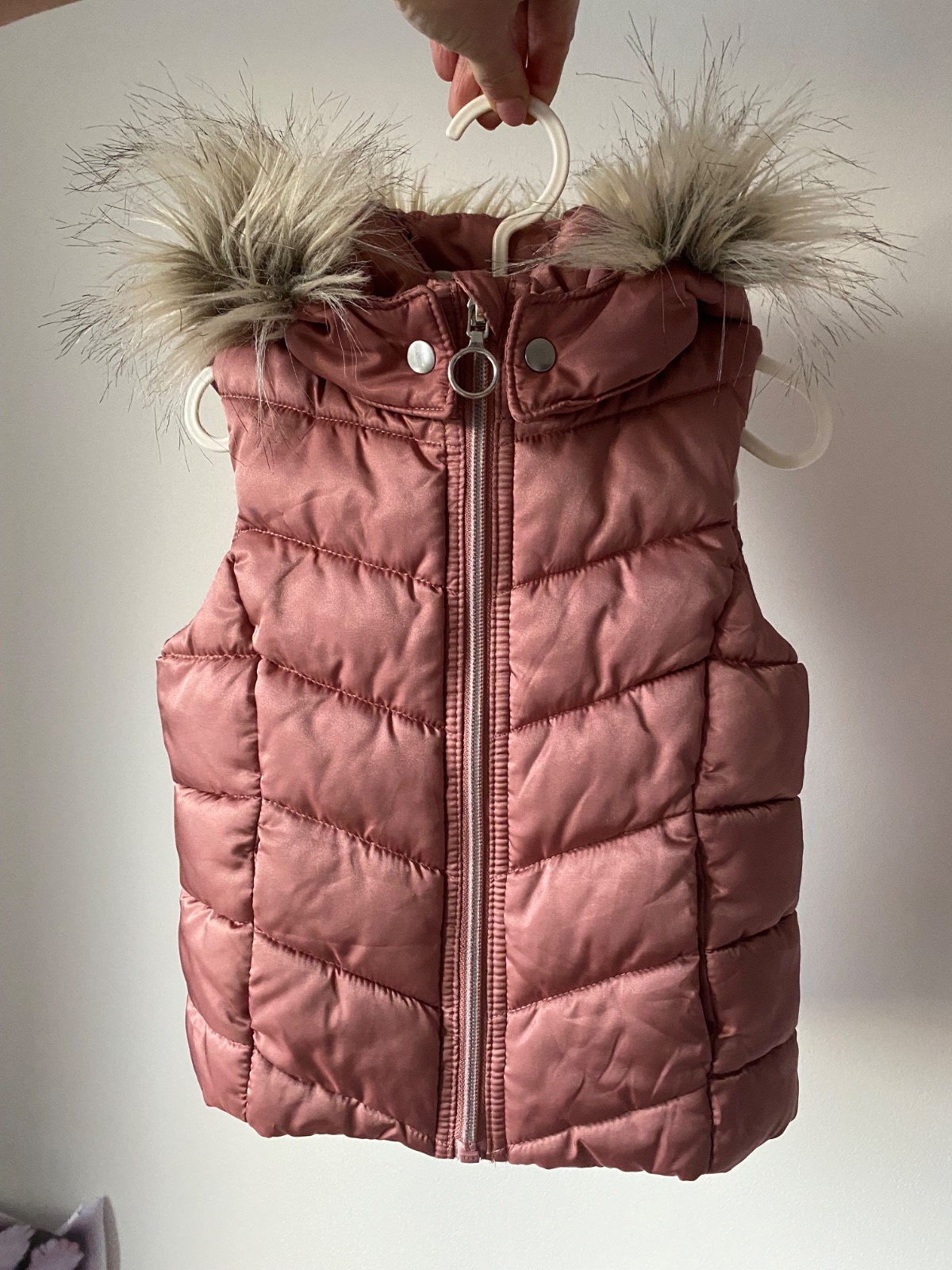 Kraaasna Vesta v TOP stave , v.98-104 , má vrecka, kapucňa sa dá odopnuť , kožušinka nie . Zadná časť vesty je dlhšia ako predná.Farba je taka staroružová .Cena plus poštovne