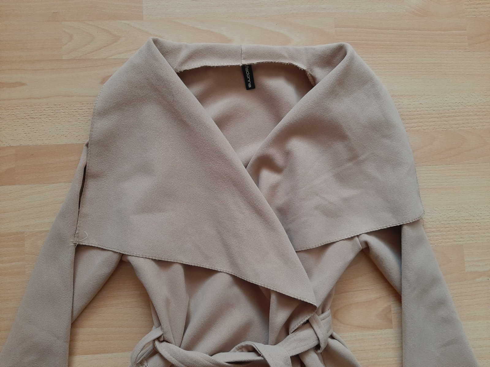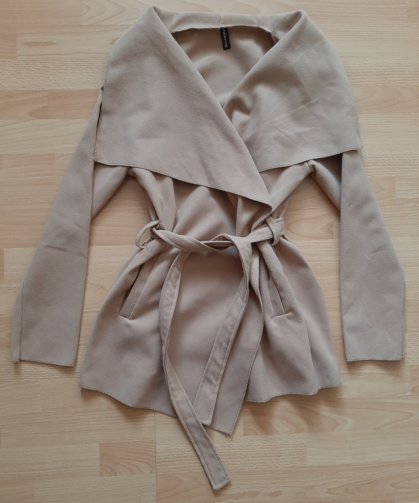 Pár krát oblečený, ako nový. Je nezateplený, nepodšitý. Farba ako na prvých foto. Celková dĺžka 77cm, dĺžka rukávu od ramena 63,5cm. Cena: 15€