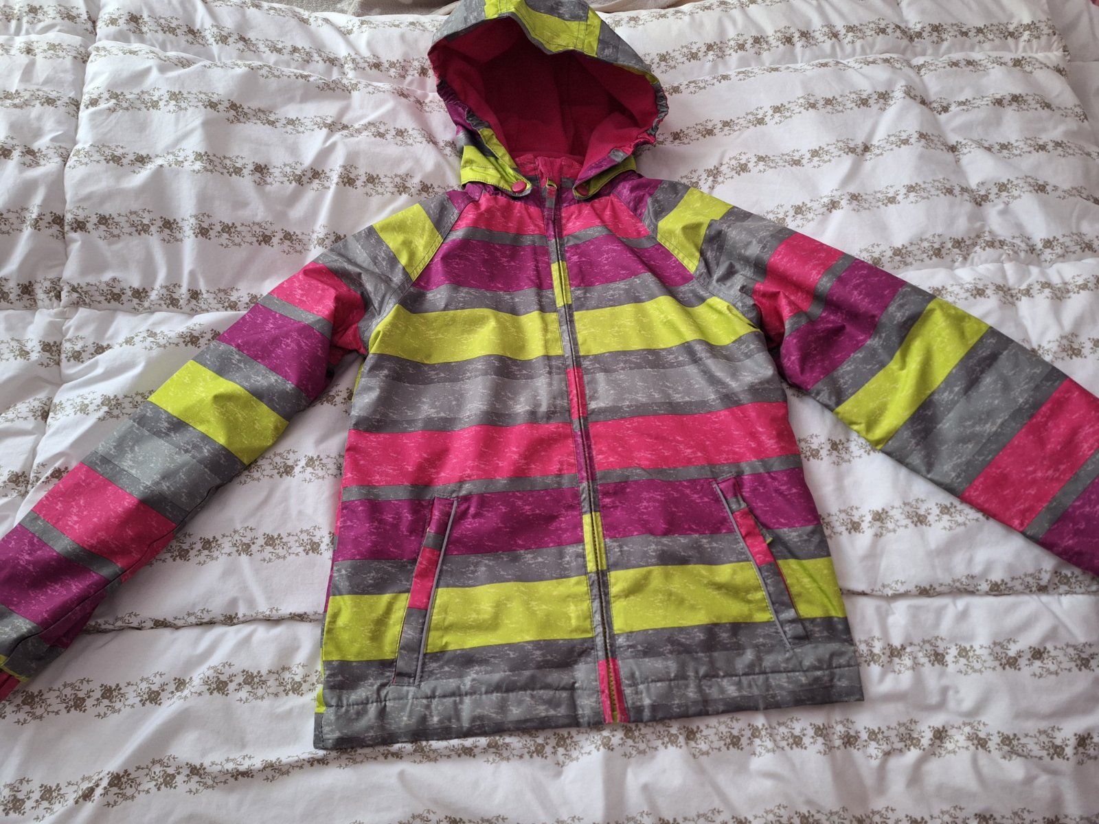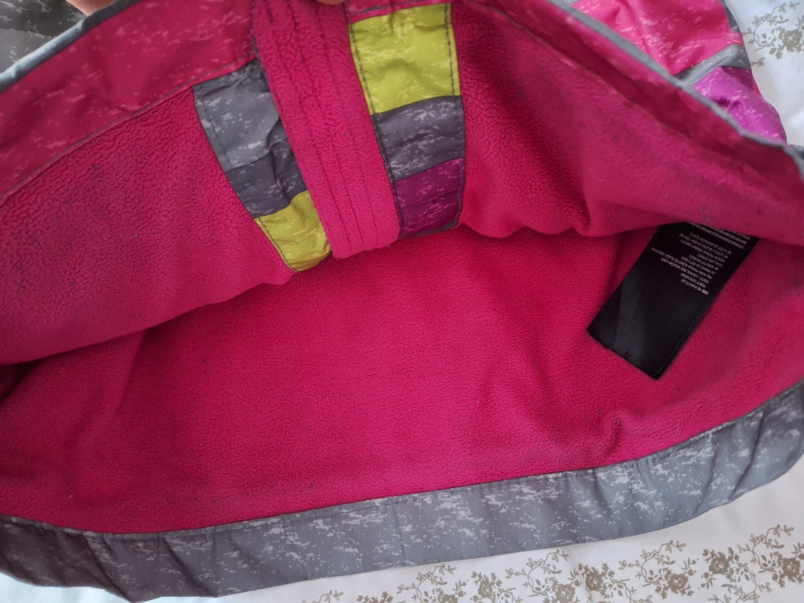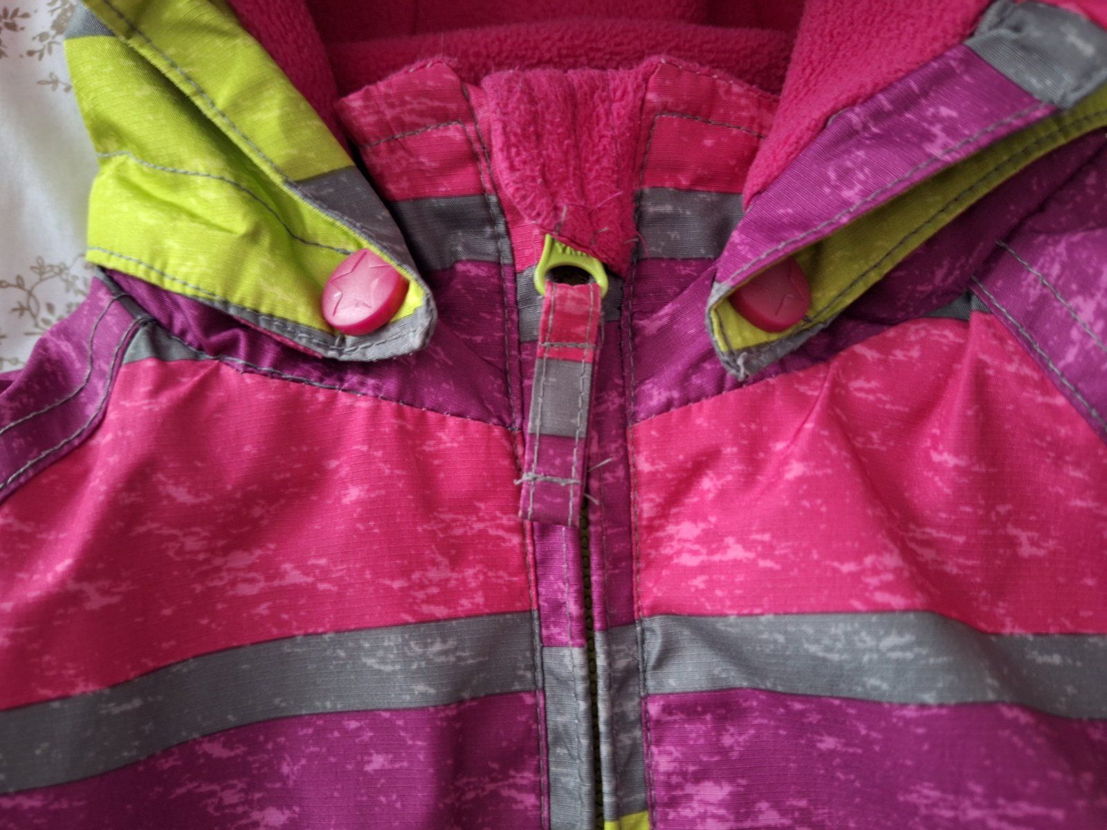 Pekný používaný stav, dcerka ju nosila aj ako zimnú bundicka, nie je hrubá, je kvalitna a dobre sa jej v nej hybalo. Len spodky lemov na rukavoch su mierne osuchane, ale vrchná časť je pekná, neosuchana. Zateplena flisom