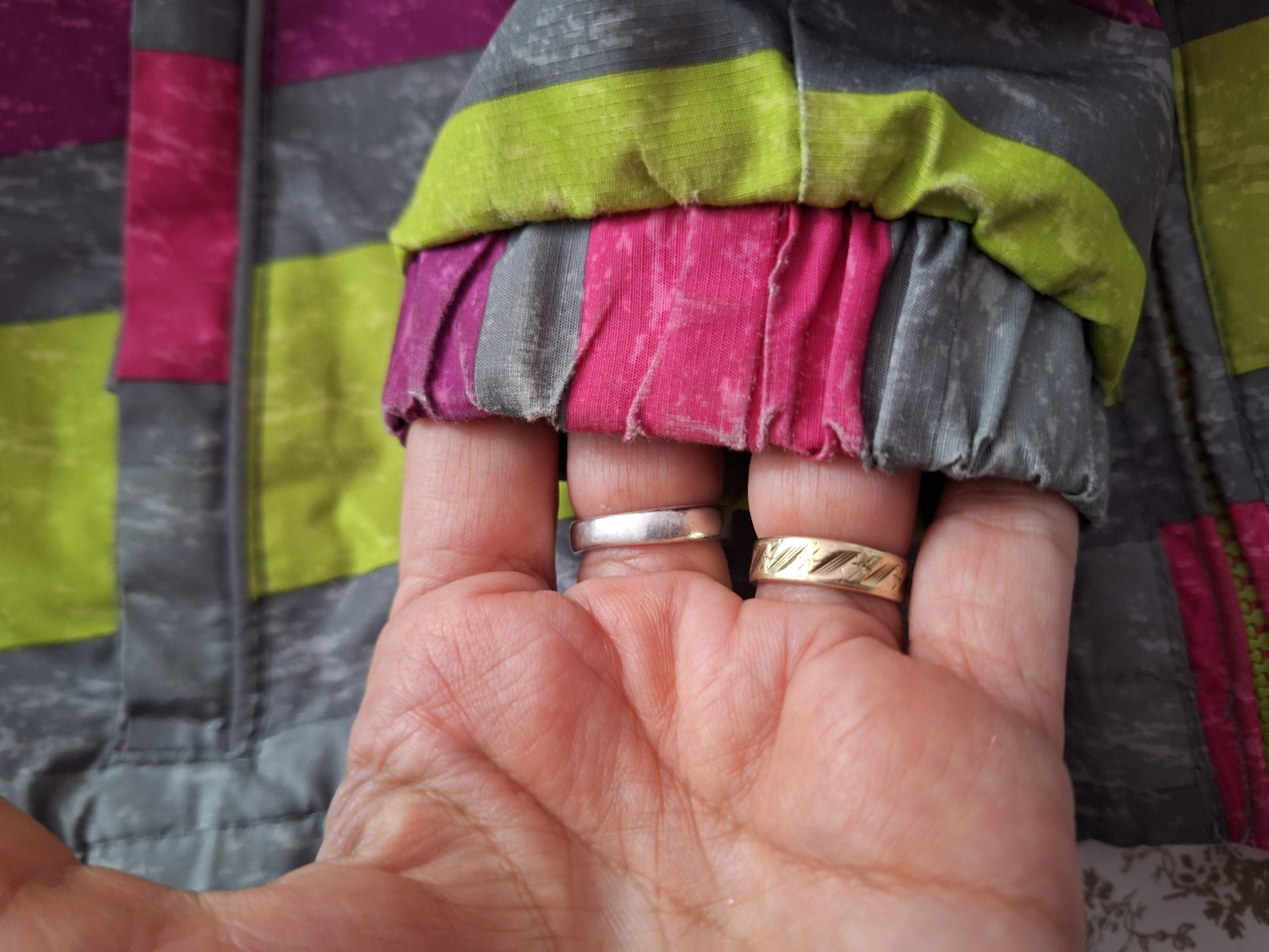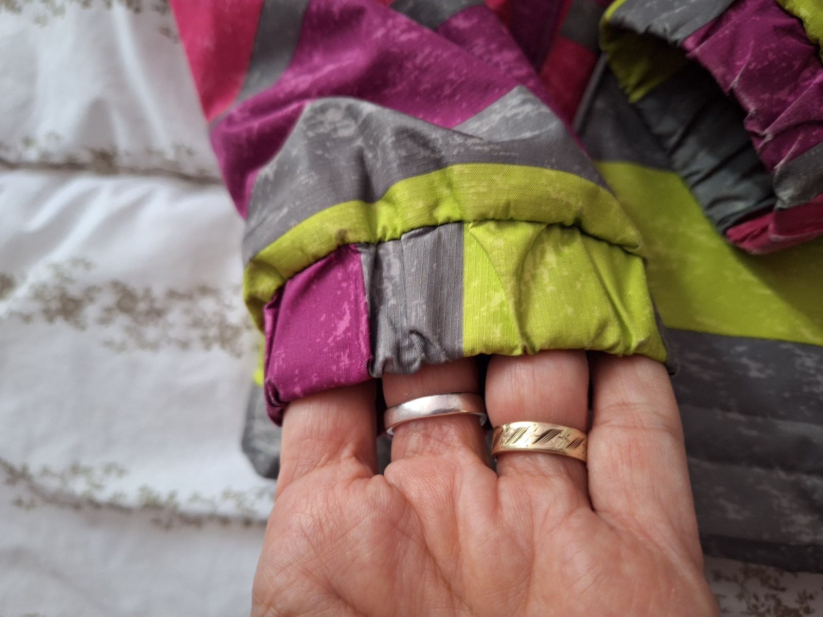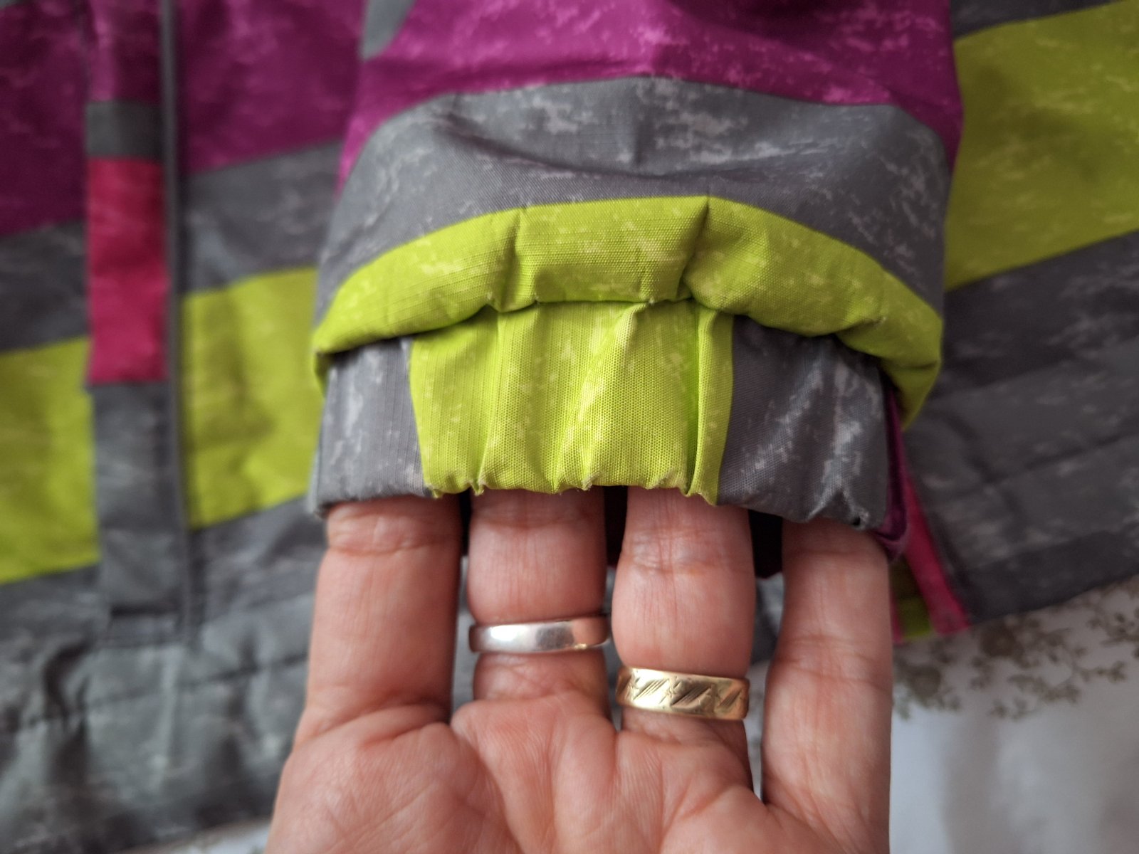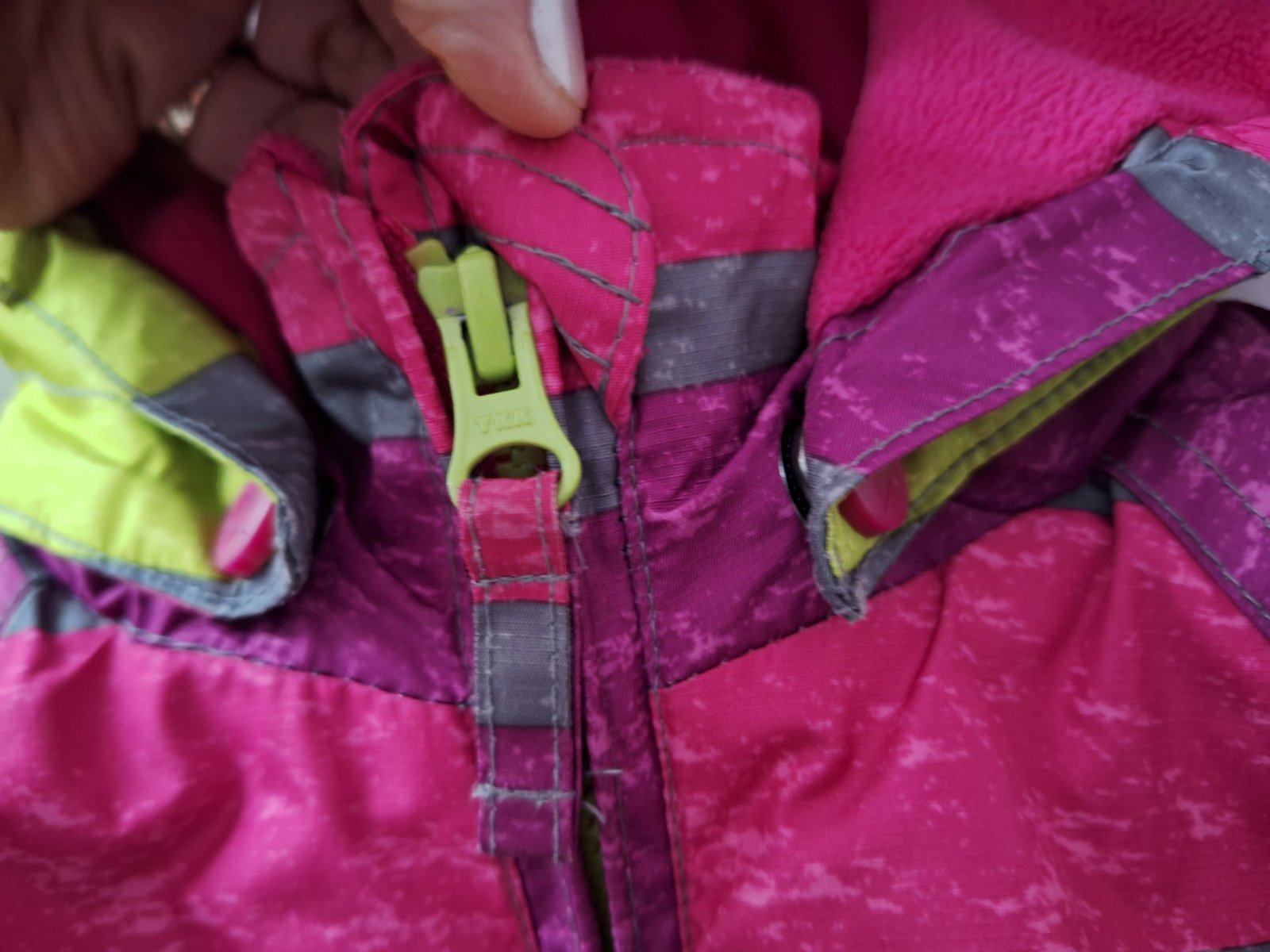 Pekný používaný stav, dcerka ju nosila aj ako zimnú bundicka, nie je hrubá, je kvalitna a dobre sa jej v nej hybalo. Len spodky lemov na rukavoch su mierne osuchane, ale vrchná časť je pekná, neosuchana. Zateplena flisom