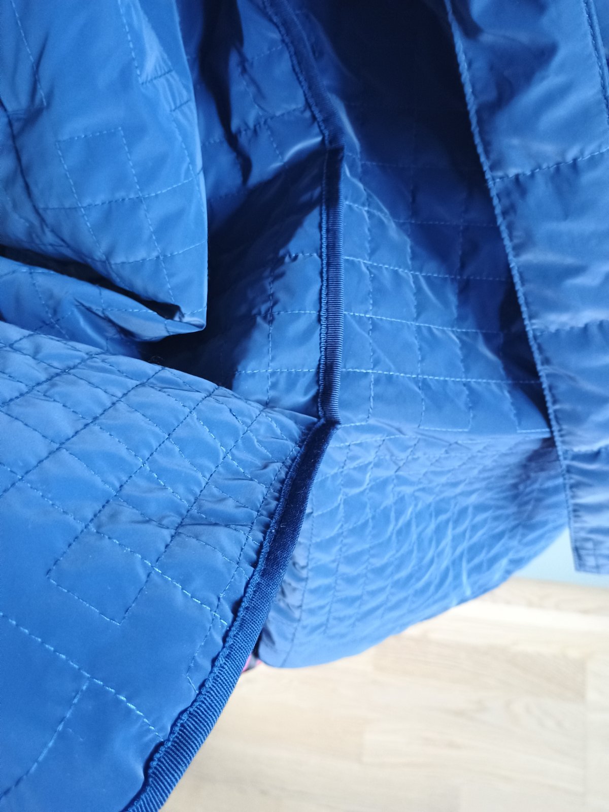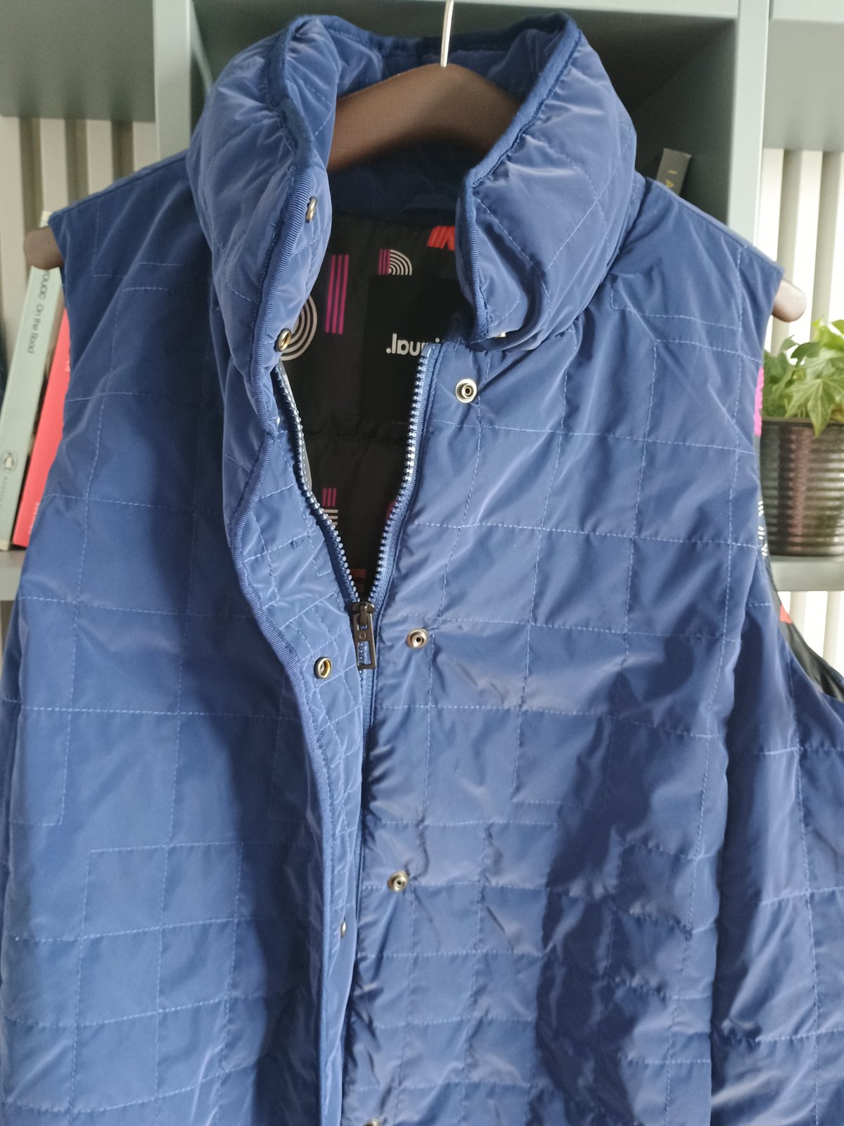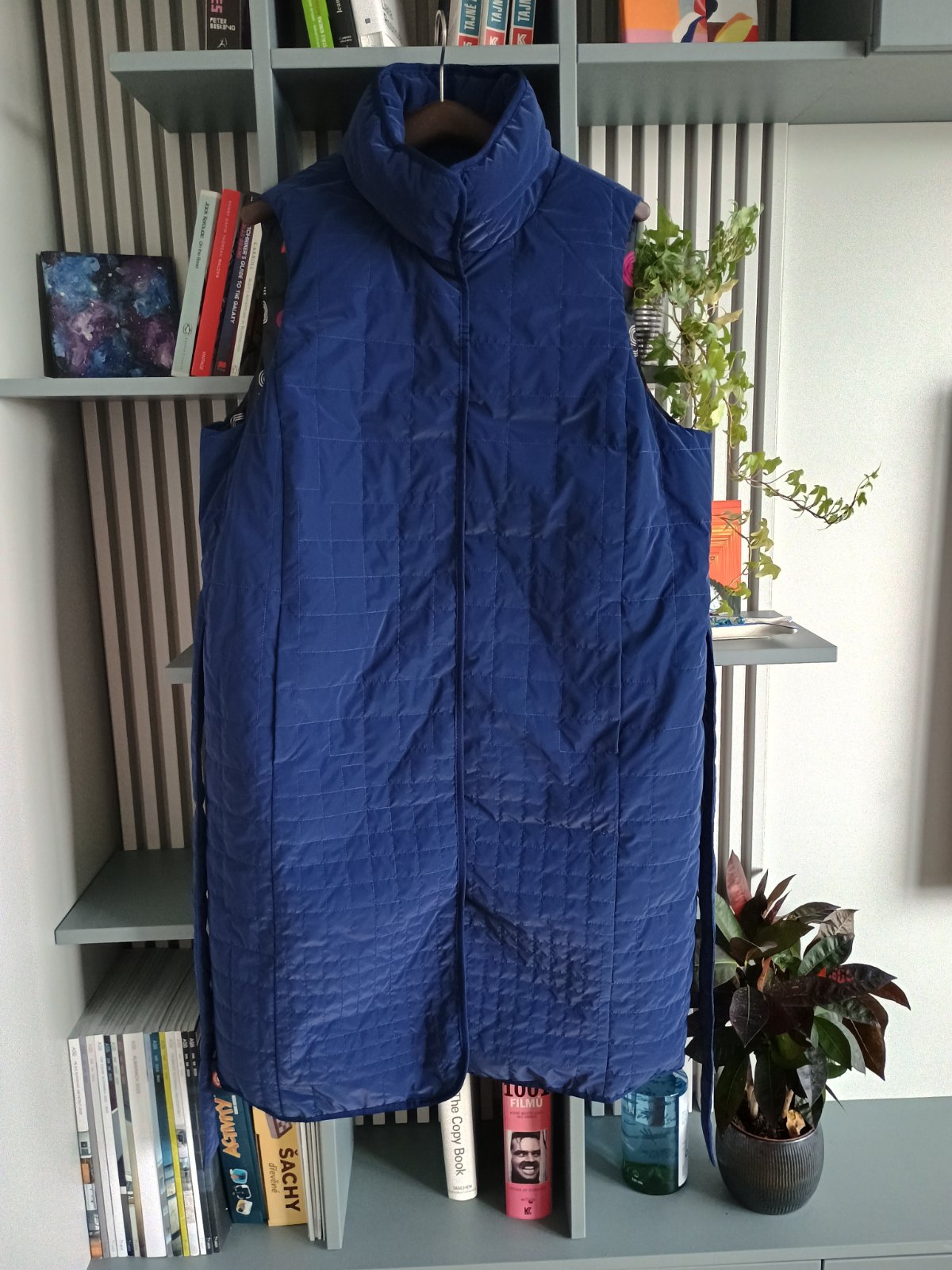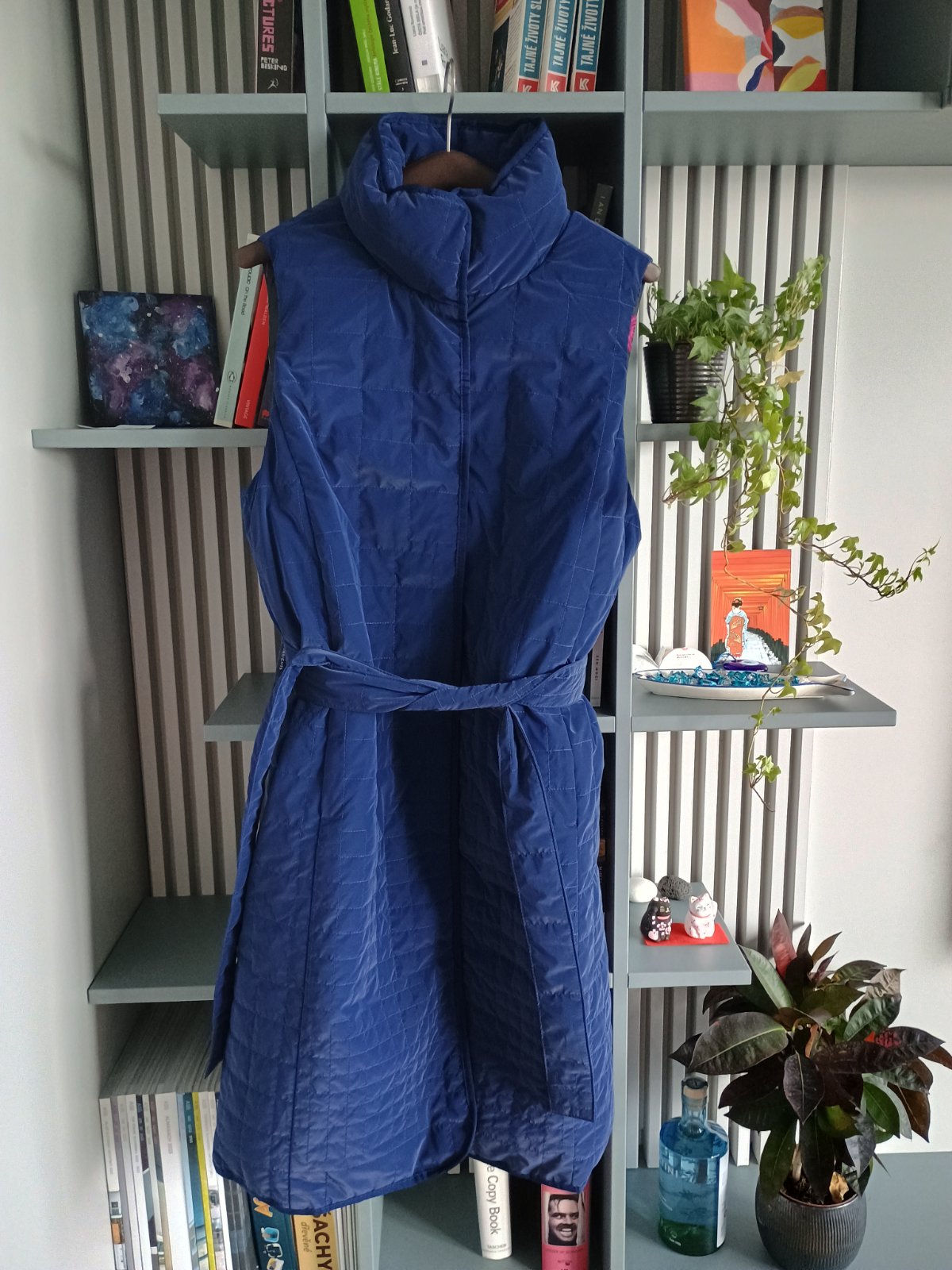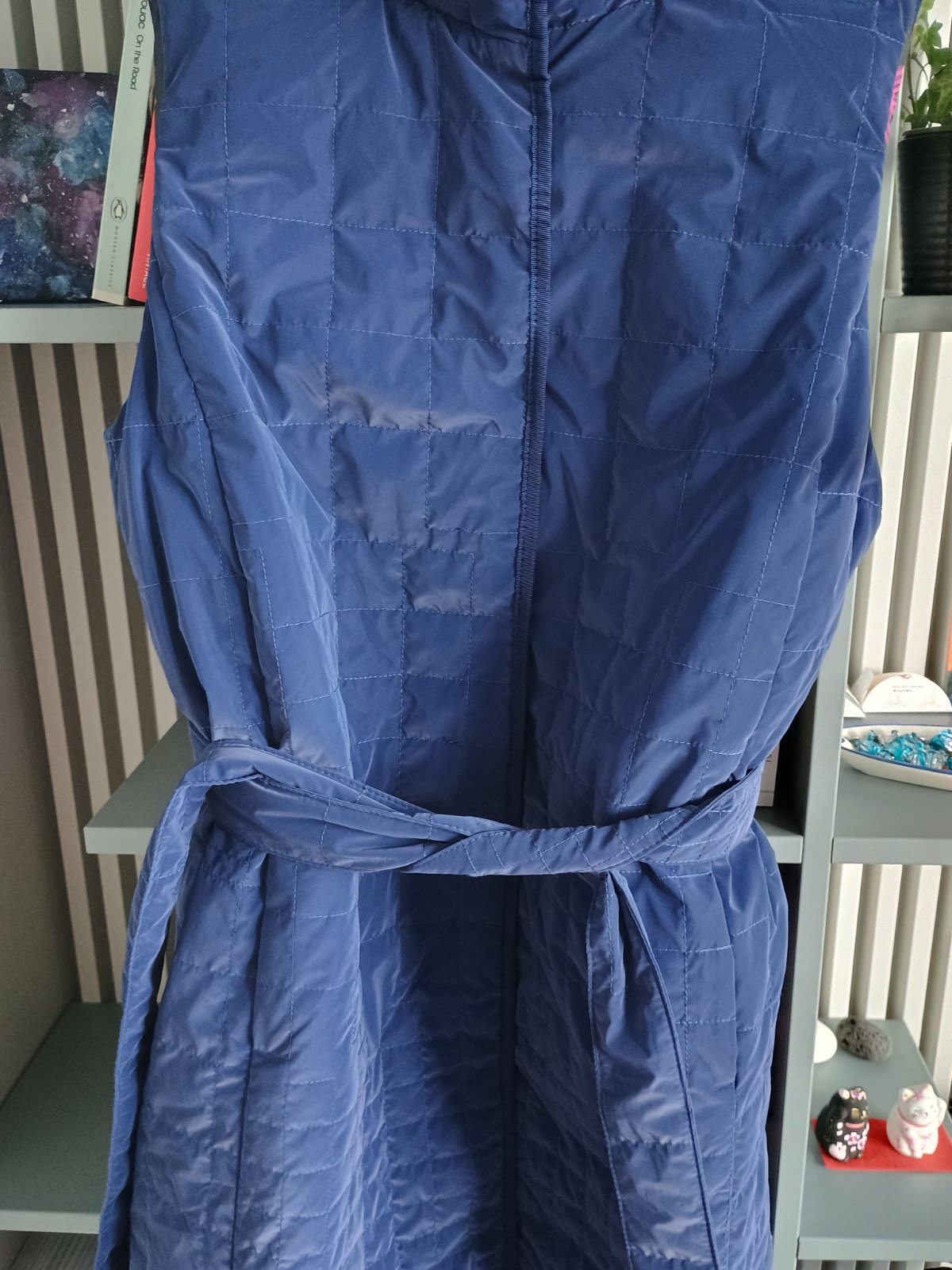 Krásna modrá vesta na chladnejšie jesenné dni, kupovaná tu, no mne je veľká, takže ju musím posunúť ďalej. Je z úžasného prešívaného materiálu, ktorý sa dá ľahko očistiť a hodí sa aj na premenlivé a trochu daždivé počasie. Zapínanie na zips aj gombíky, veľ. XL. Nosený iba raz, vesta je bezchybná. Zaväzovanie na opasok z rovnakého materiálu ako vesta. Rozmery: šírka cez prsia 60 cm (spodný otvor na ruky), celková dĺžka 100 cm.