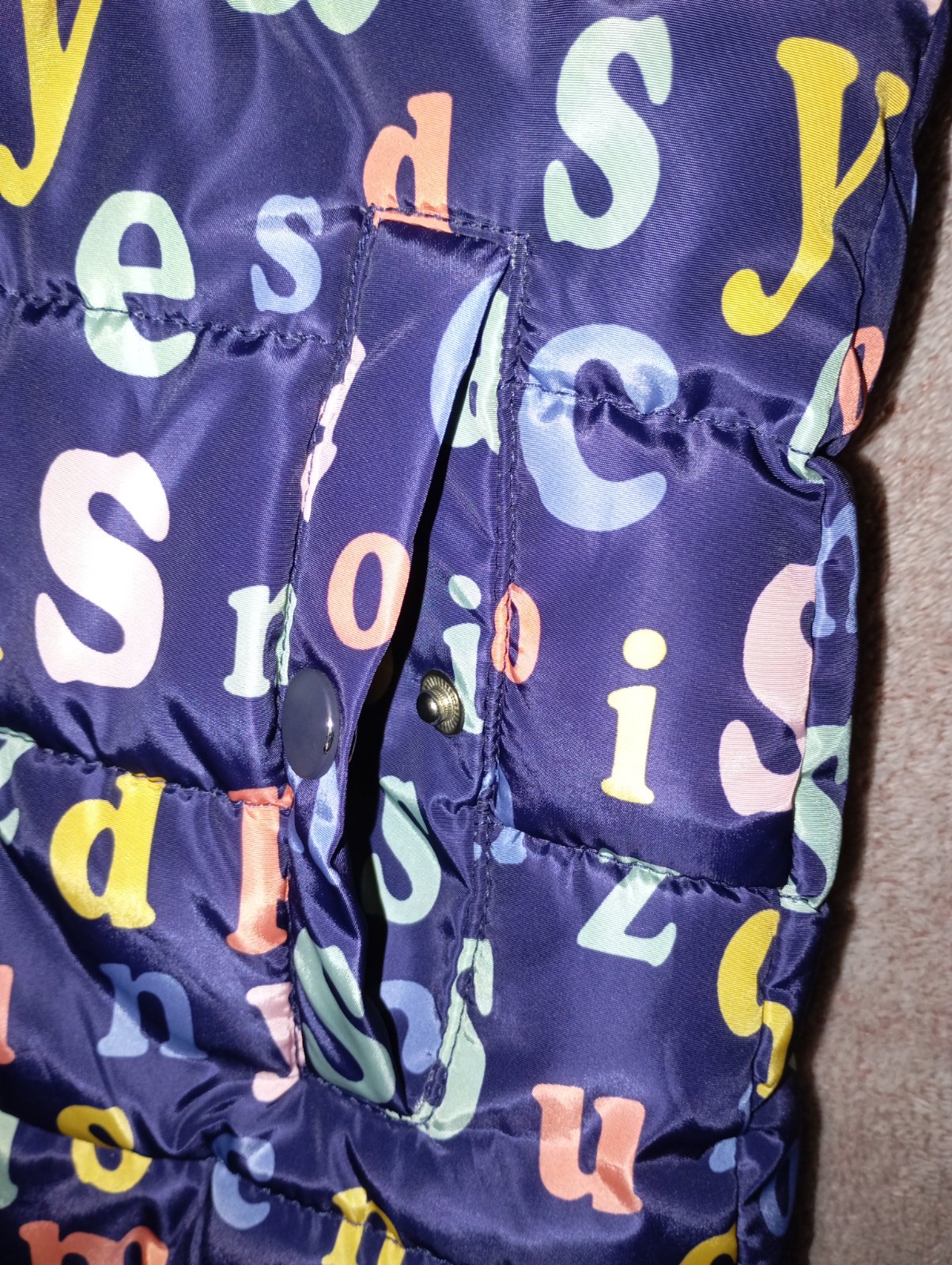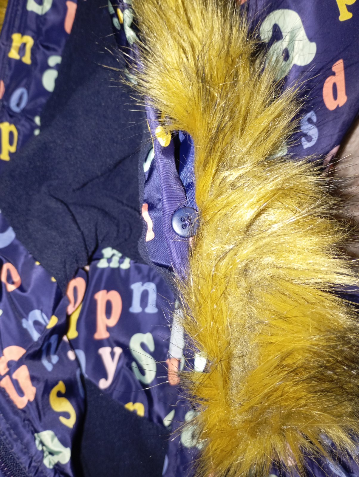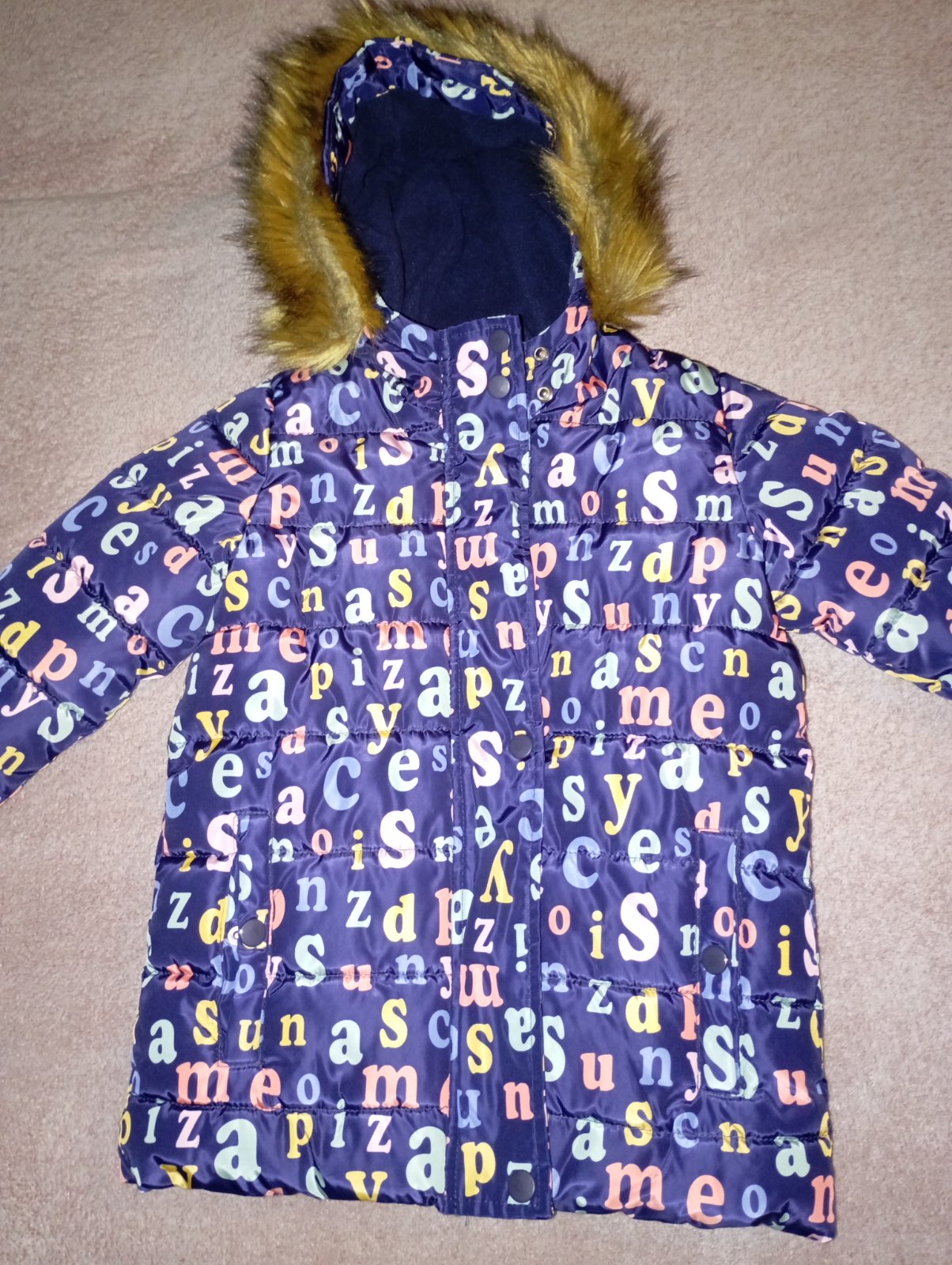 Predám zimnú bundu pre dievčatá vo veľmi dobrom stave, bez poškodenia. Má krásny vzor abecedy, teplá podšívka z flisu, kapucňa je napevno, kožušinka je odnímateľná .