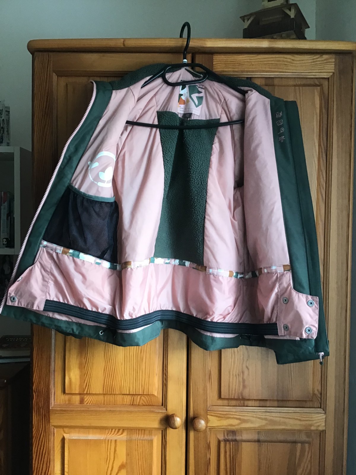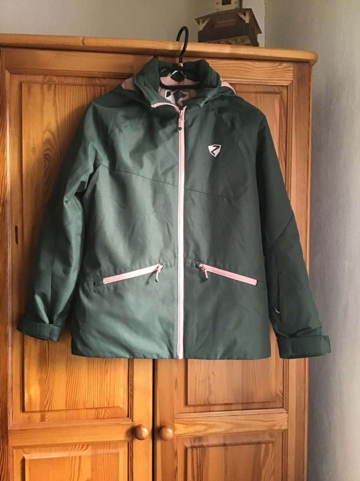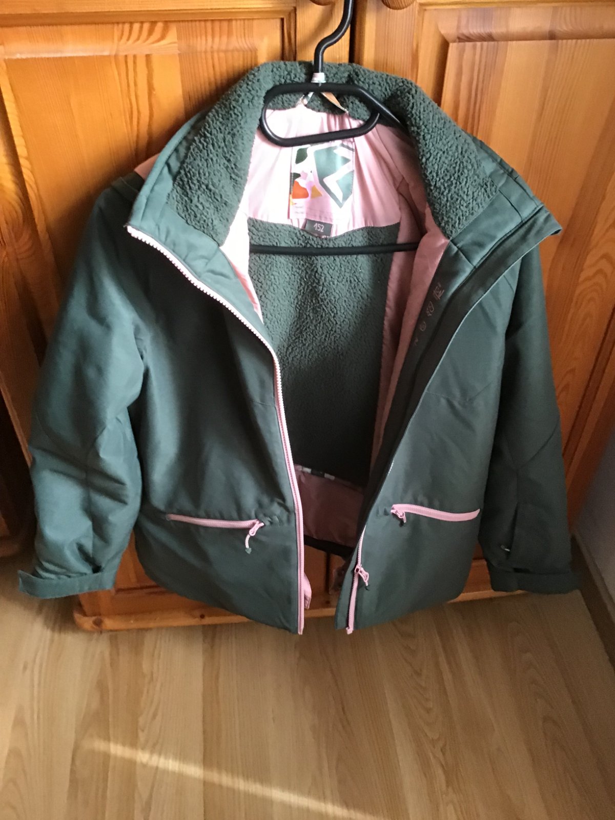 Kvalitna, zimna vetrovka, bez poskodeni, bez znamok nosenia, top stav. Farebne je zelena trosku jasnesia - neslo mi zachytit, ako na foto, pekna farebna kombinacia zelenej a jemnej ruzovej.