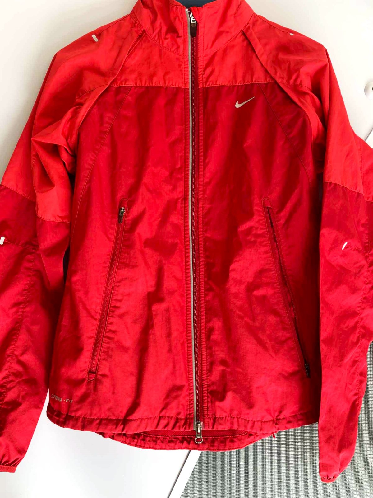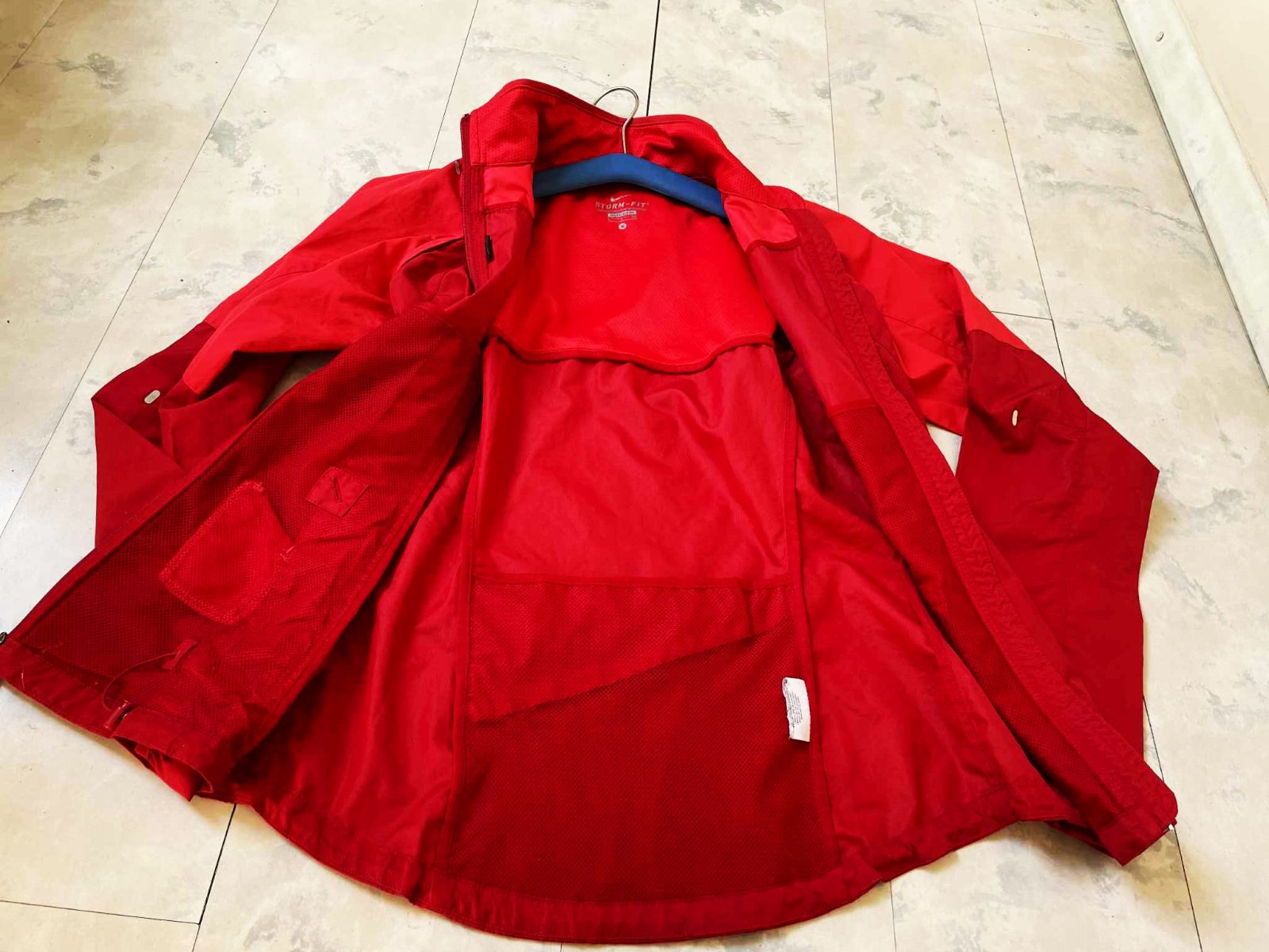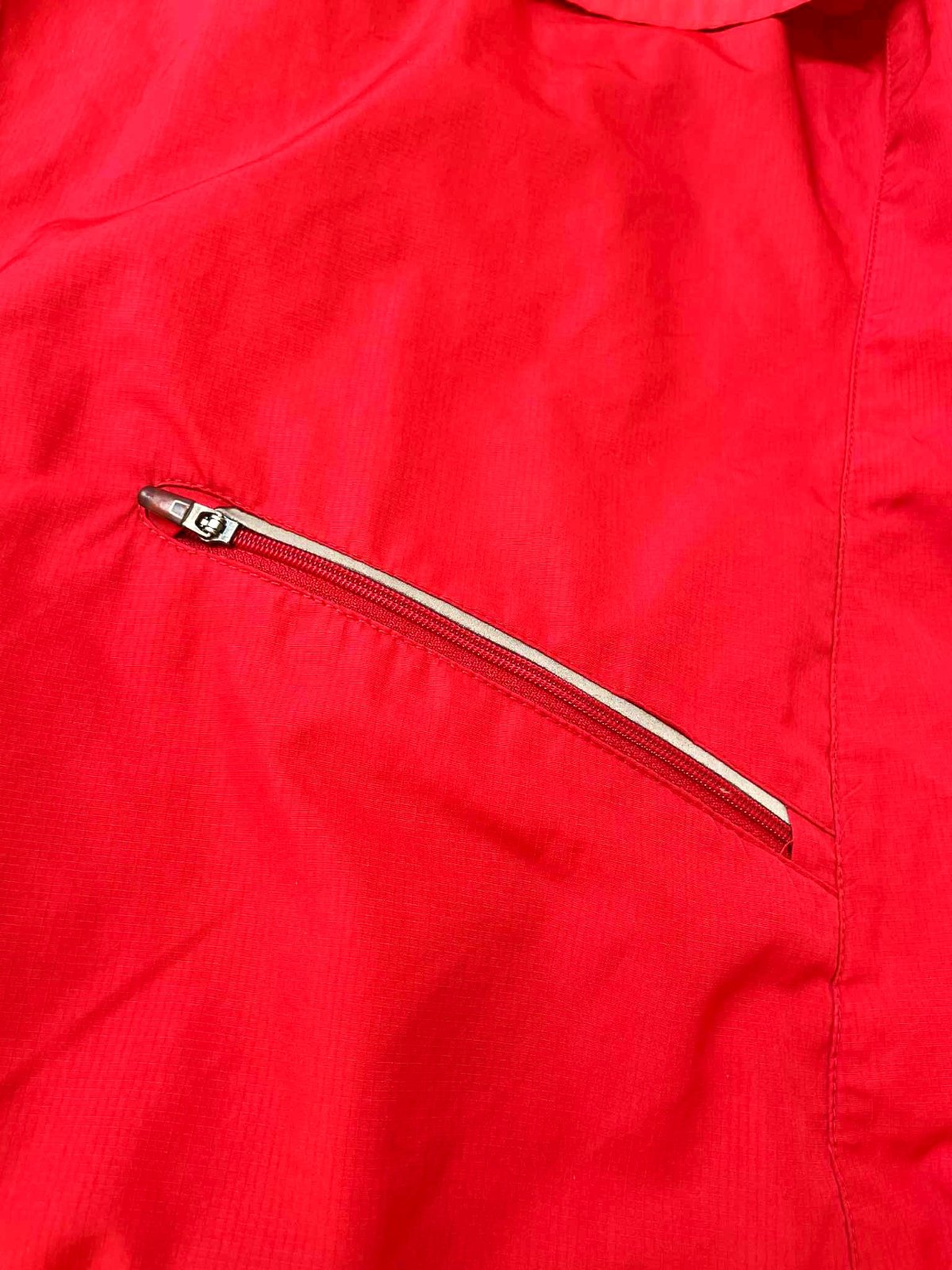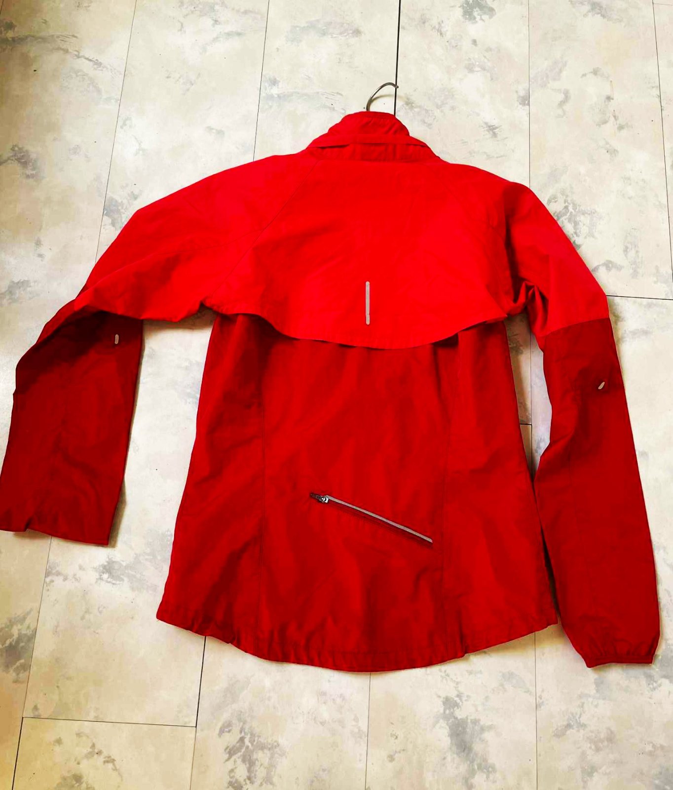 kvalitná tenká značková bunda vhodná na športy ale hlavne na turistiku,je ľahká,skladná,nepremokavá,s reflexnými prvkami,v top stave,sýta červená farba,veľa vreciek,rukávy sa dajú odzipsovať - čo je veľmi praktické,obojstranné zipsy,šírka meraná pod pazuchou = 47 x 2 cm,spodný obvod = 49 x 2 cm,dlžka celkom = 62 cm, dlžka od pazuchy dole = 40 cm,rukáv - raglánový,meraný od stojačika a ukončený gumičkou = 76/77 cm