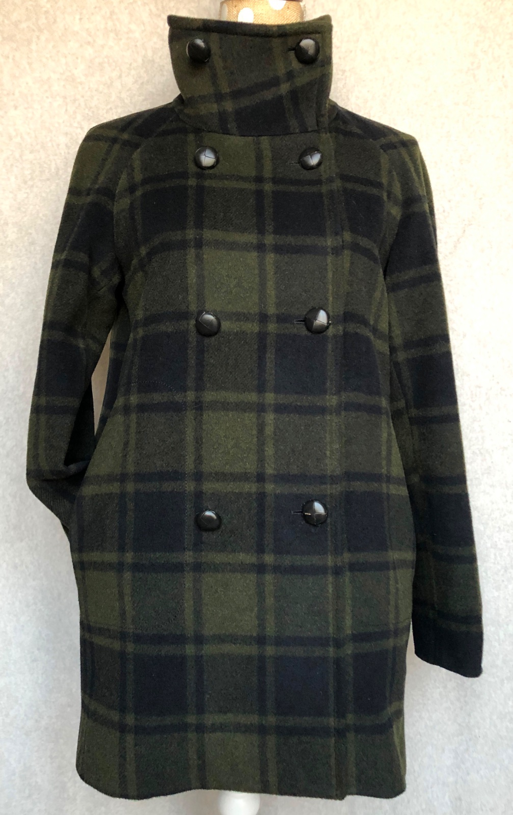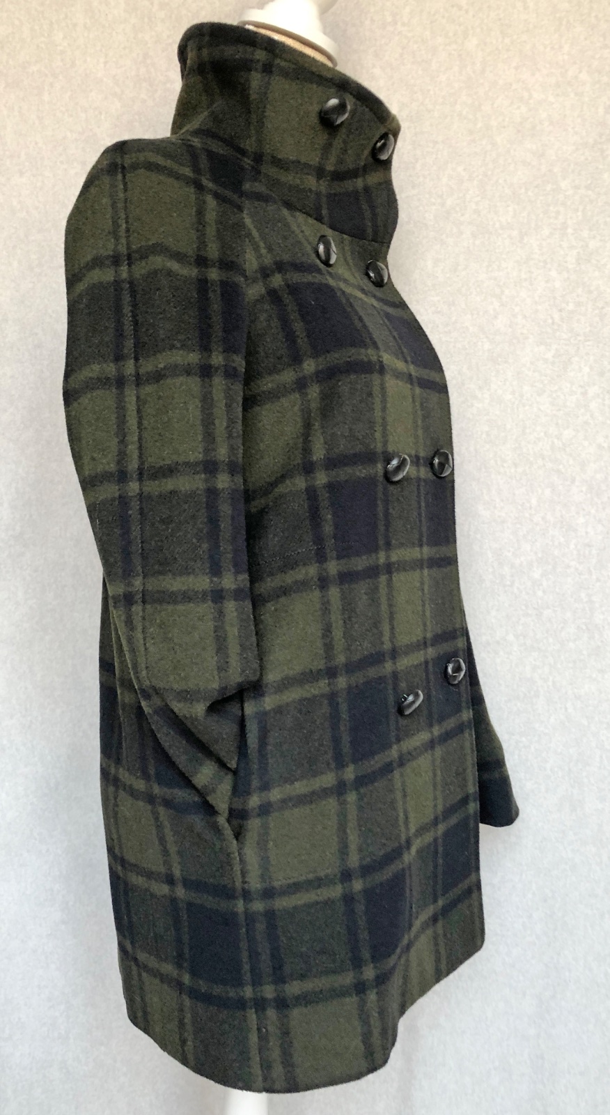 Nadčasový športovo- elegantný kabát na dvojradové zapínanie s koženými gombíkmi. Minimálne použitie, v super stave, bez poškodení.