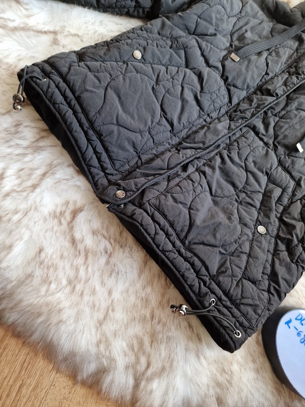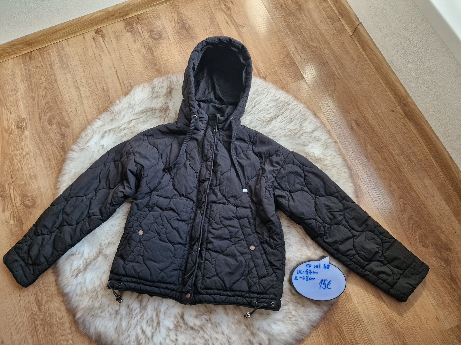 prechodná čierna bunda zn. F&F, veľ. 38 s kapucou na pevno, opasok výborný stav dĺžka 64 cm rukáv 64 cm šírka pod pažami 2x 51,5 cm pás max 2x 47 cm
