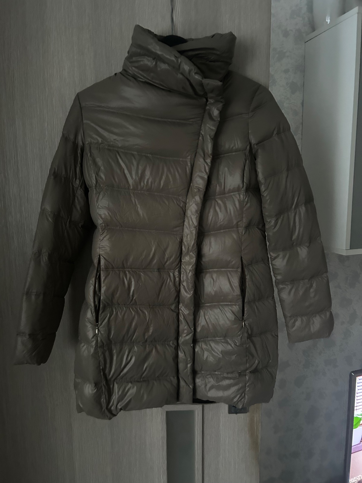 Málo nosená dlhá bunda po kolená. Perová, veľmi teplá. Kapuca je odnímateľná na cvoky. Original, bloček nemám, možno by som našla papierovú tašku. Kludne vhodná aj ako darček. Je top stav