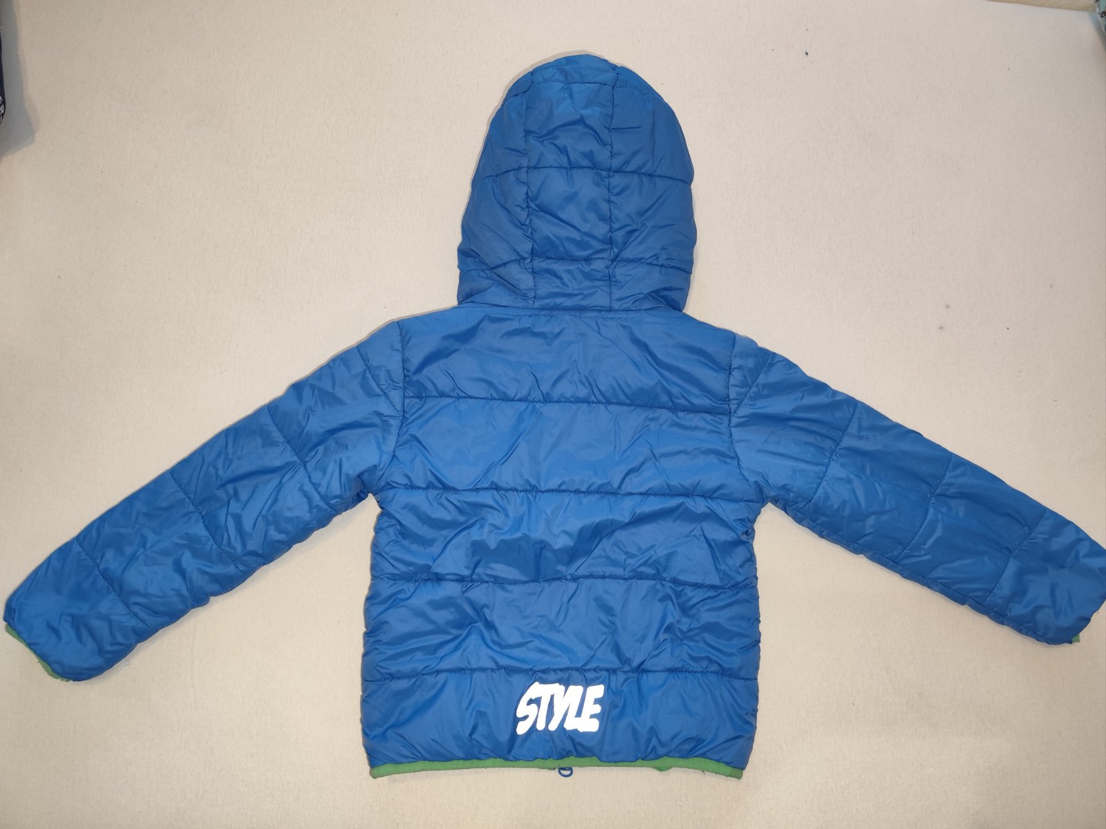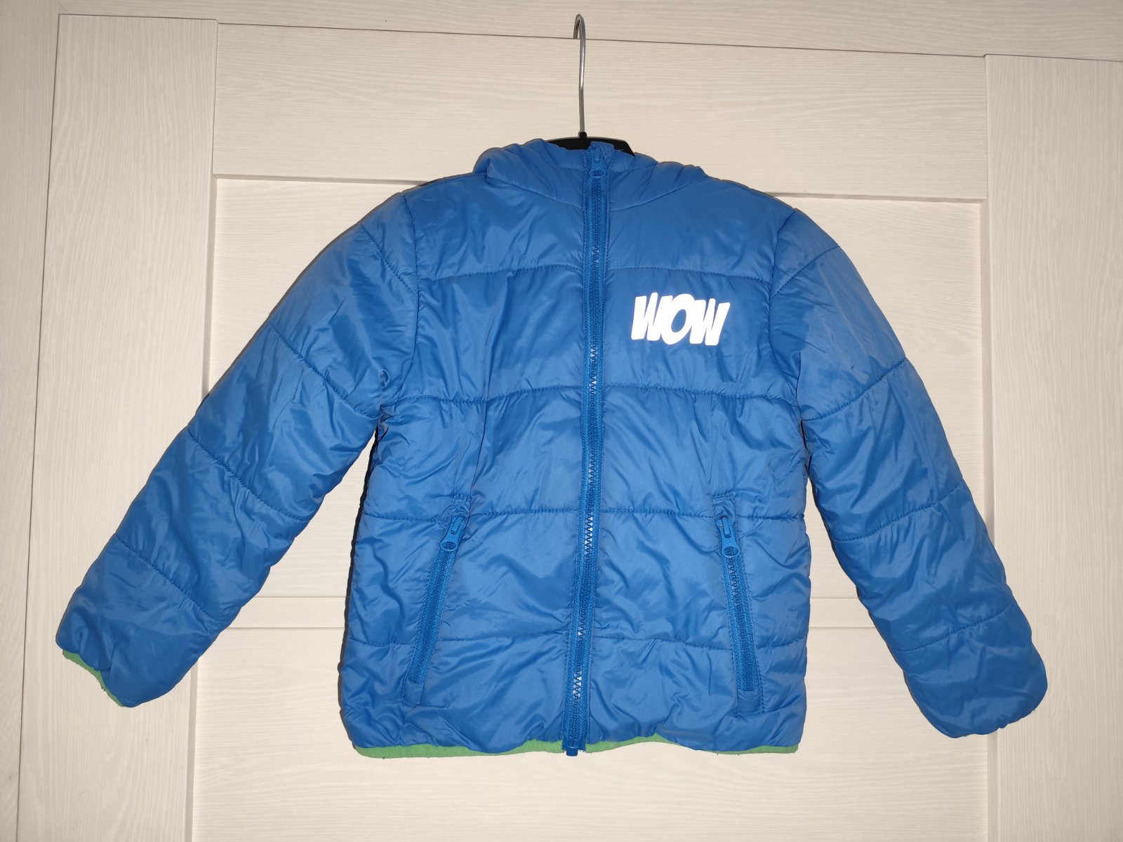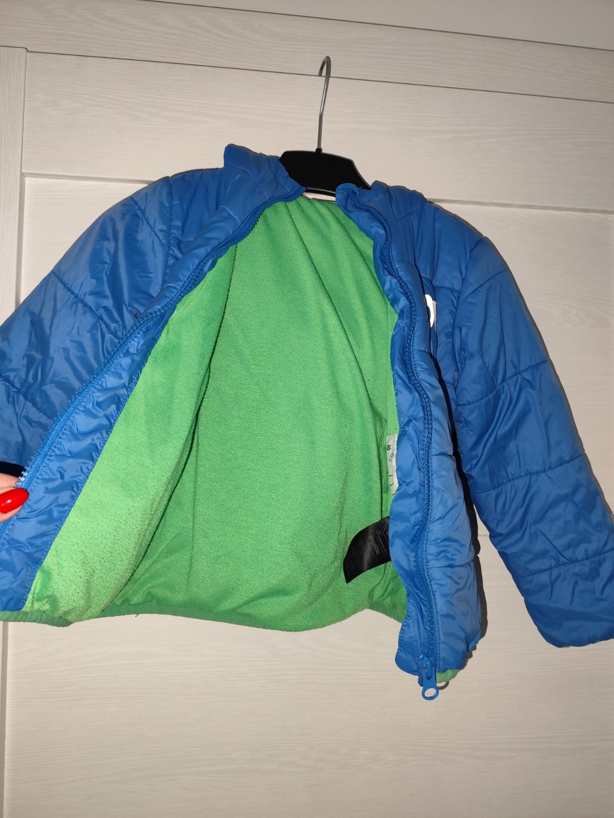 Pekná modrá teplá páperová bunda značky Lupilu, veľkosť na štítku 110, vhodná pre chlapca vo veľmi dobrom stave za 4,50€.