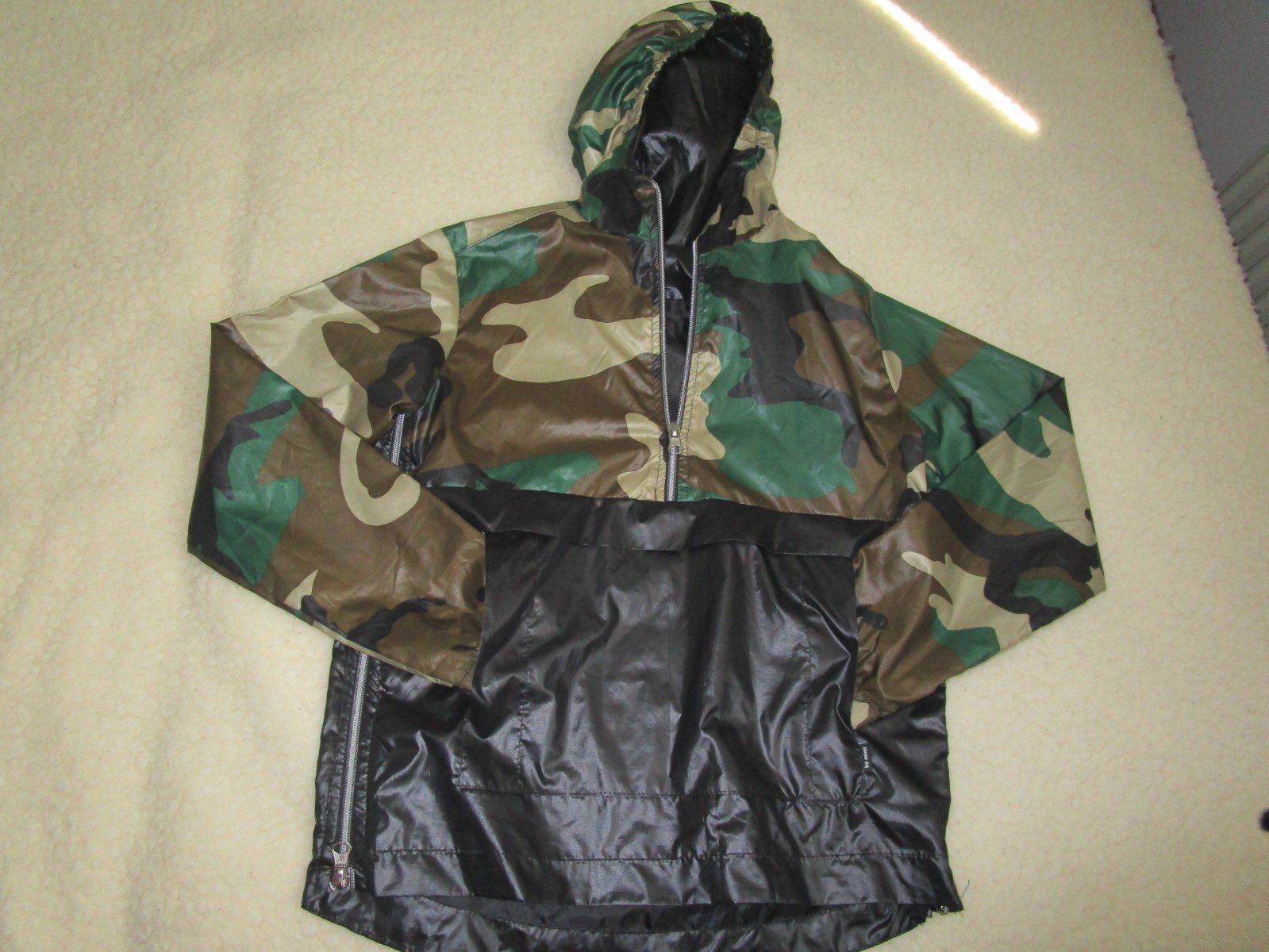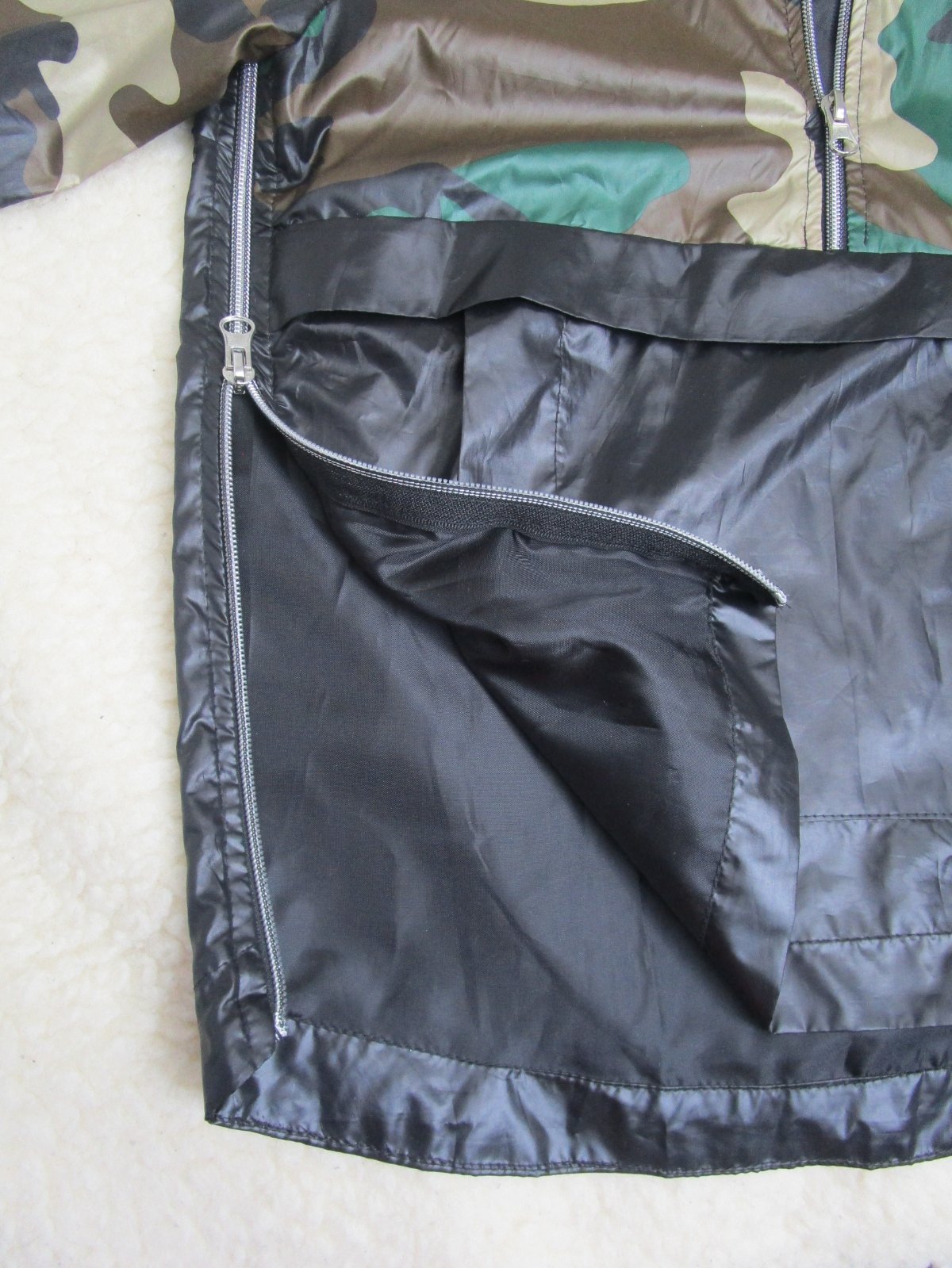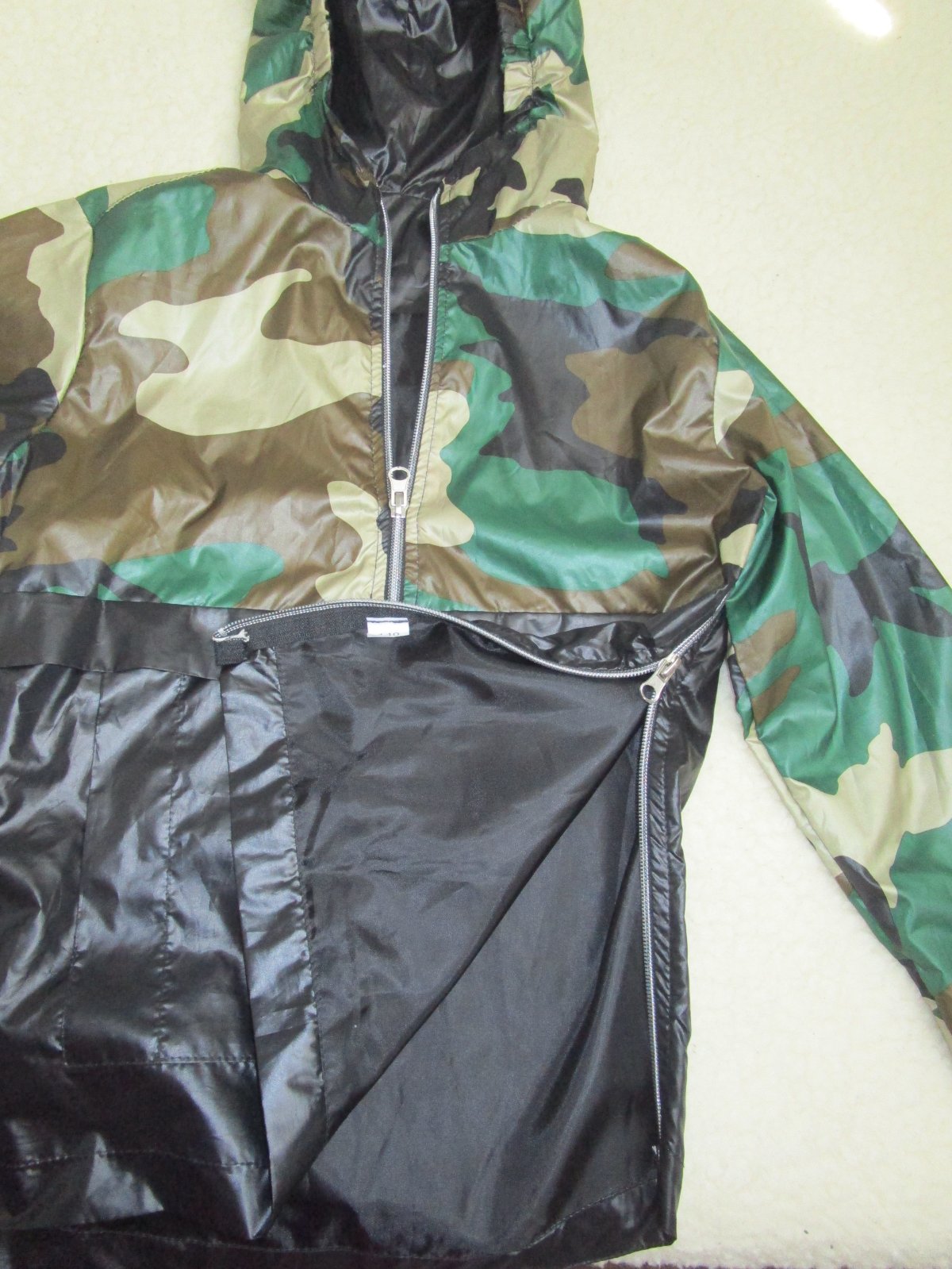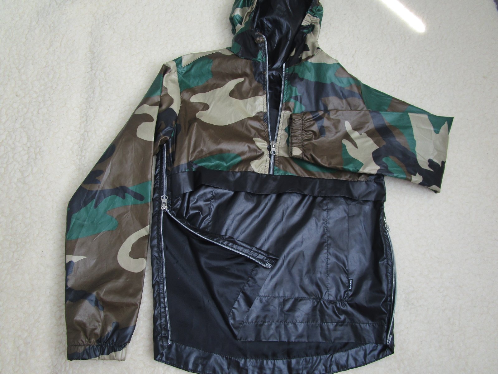 Šusťakovina, s kapucňou, na bokoch s funkčnými zipsami, tenká podšívka, s vreckami