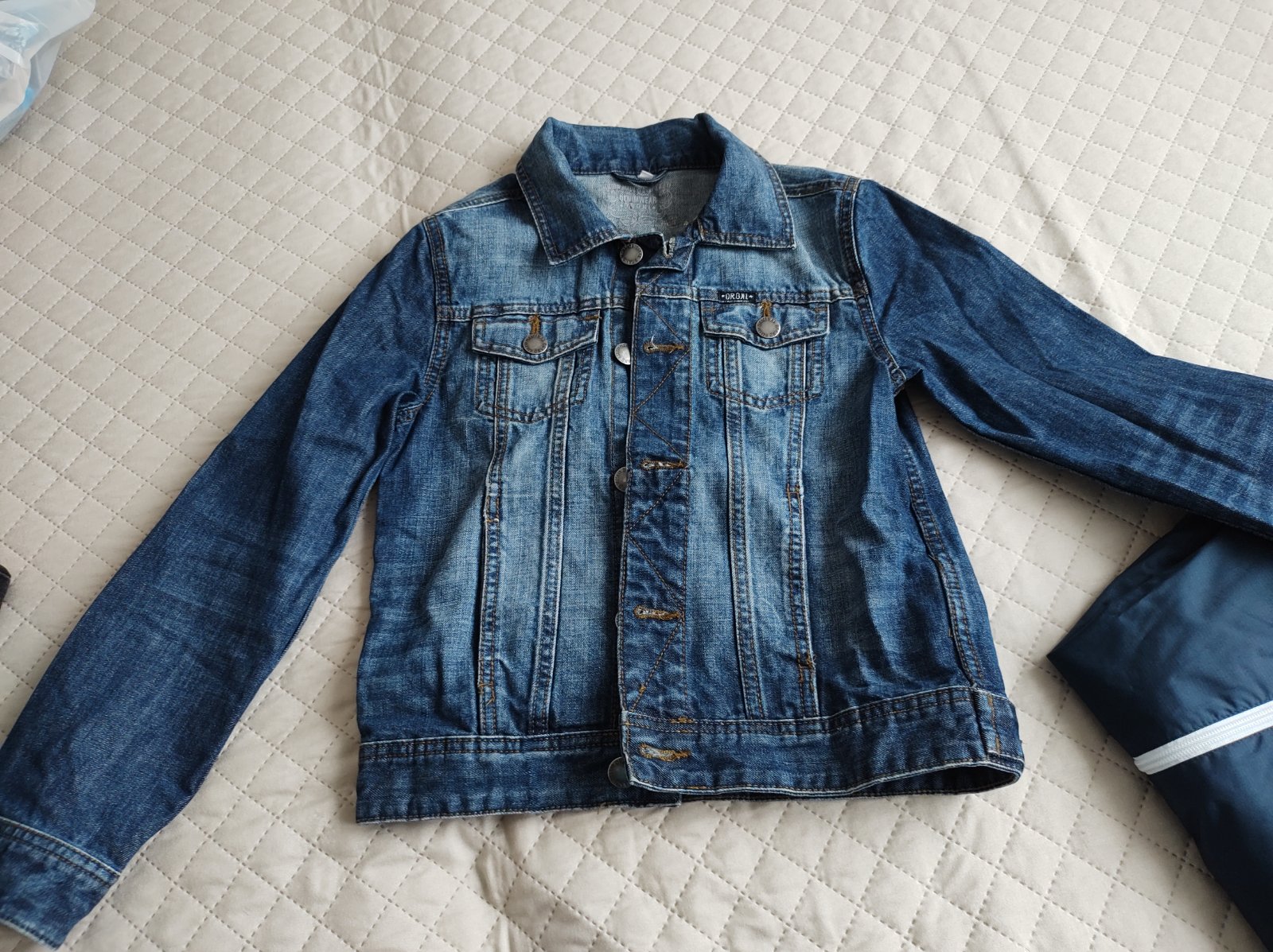 Predám asi 2x oblečenú riflovú bundu bez akýchkoľvek známok nosenia, je úplne ako nová, nenosená. Odporúčam. Veľkosť uvedená 140, ale je väčšia. Dĺžka rukáva od ramena 54, od krku 62, celková dĺžka 51, šírka cez prsia 39