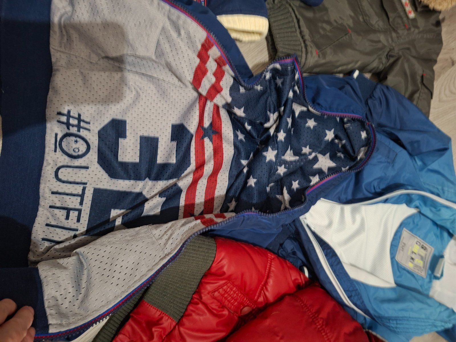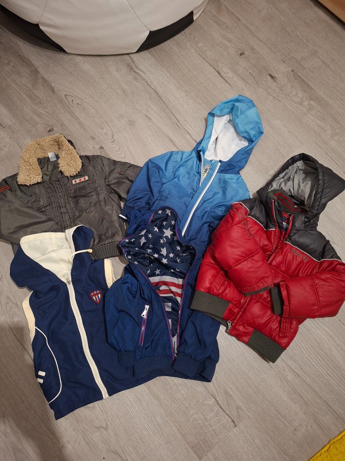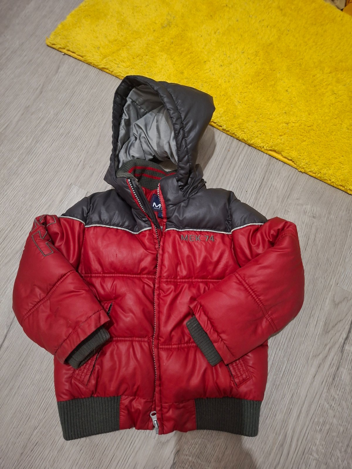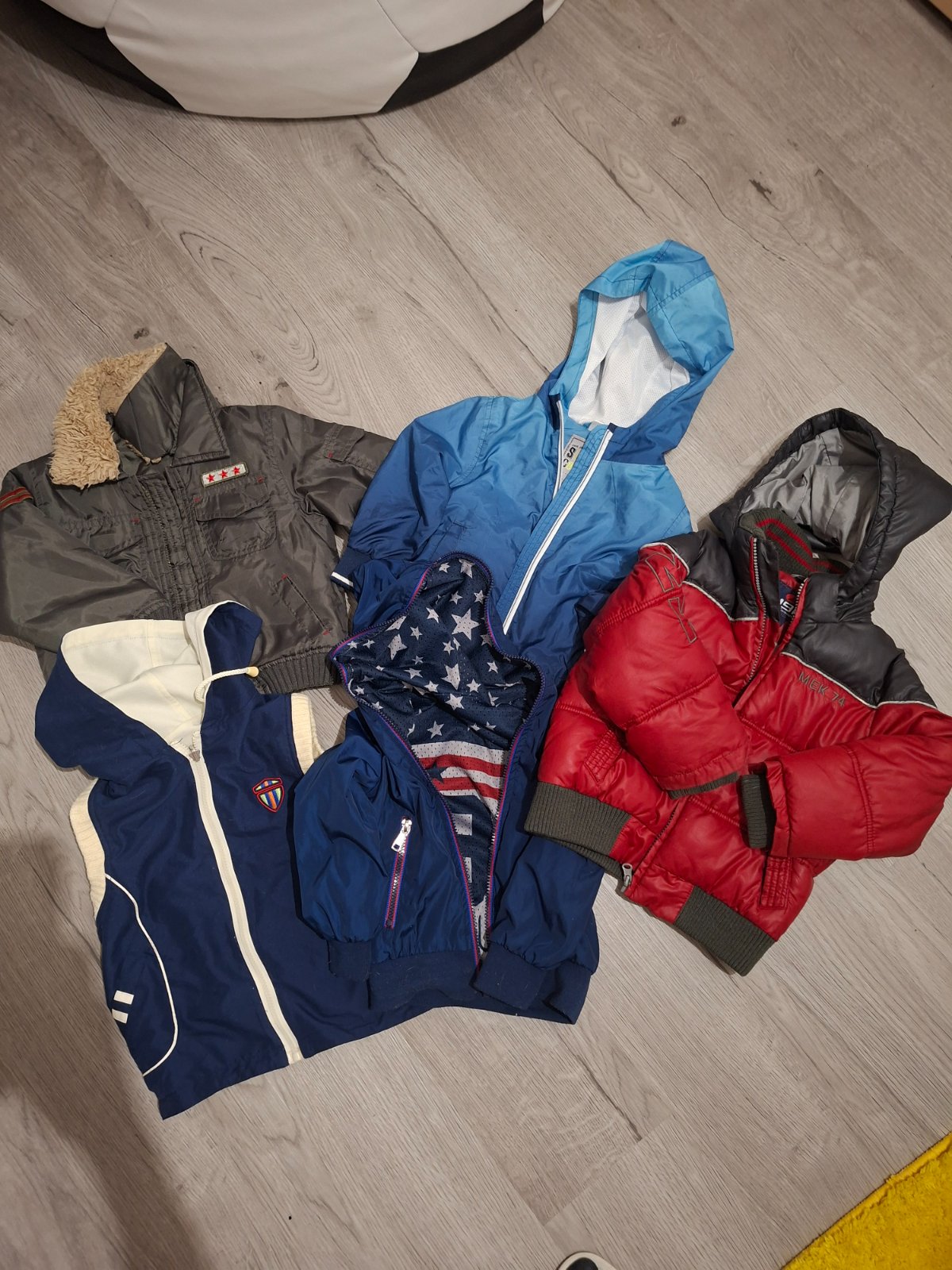 Bundy velkost 98. Červená je trosku väčšia. Pribalim vestu zdarma. Ak vas zaujimaju presnejšie rozmery tak doposlem. Cena jednej bundy je 3eura. Ak zoberiete viac tak dam zľavu.