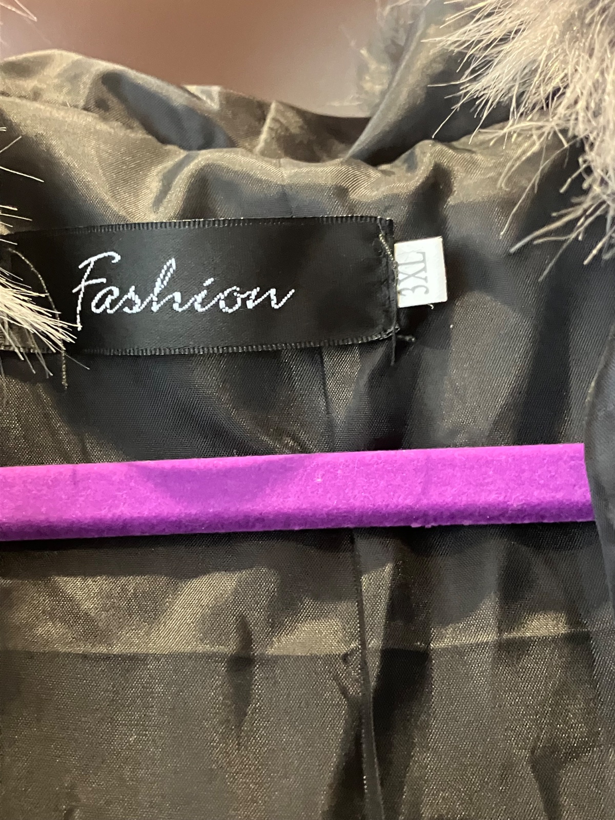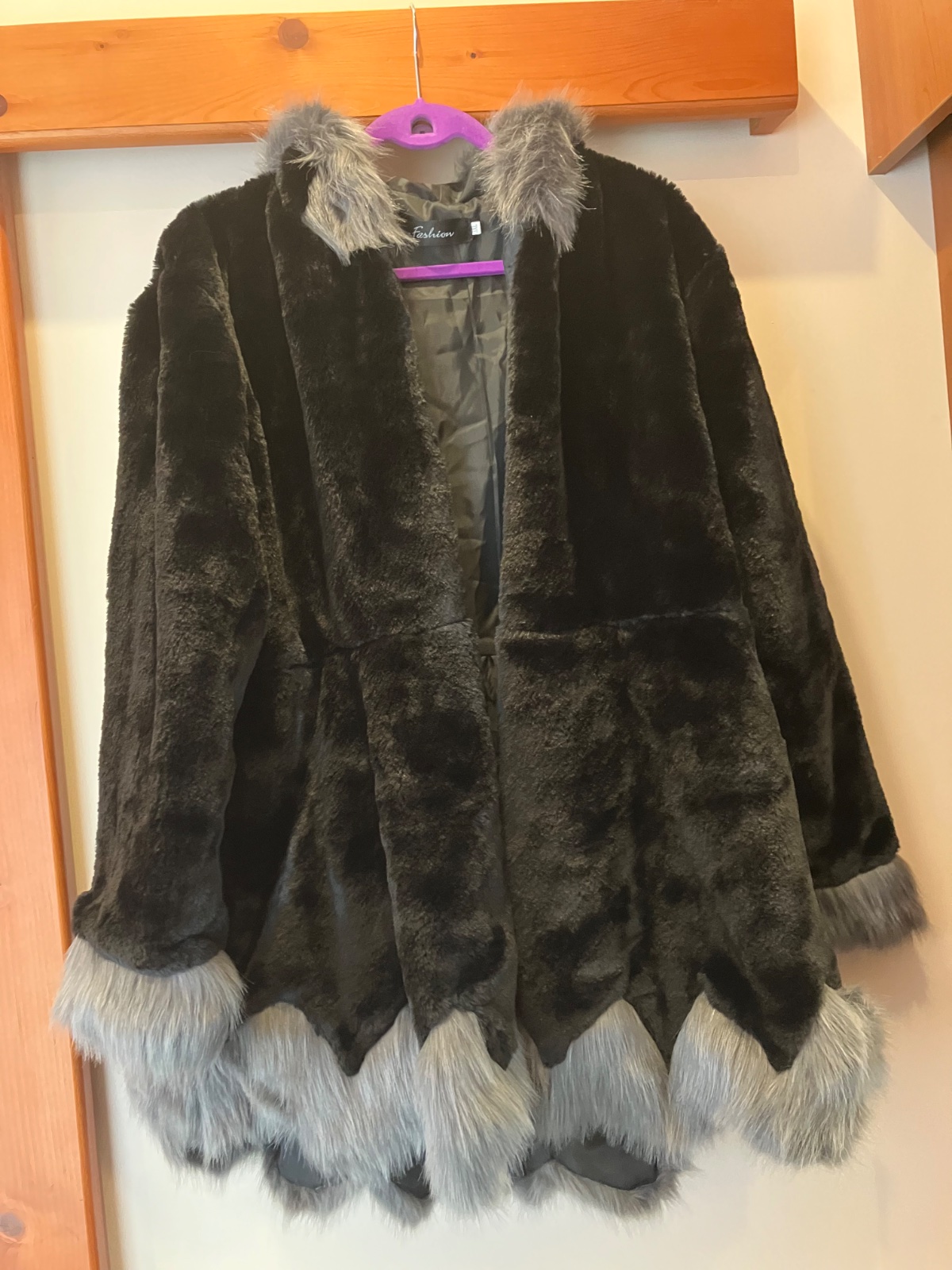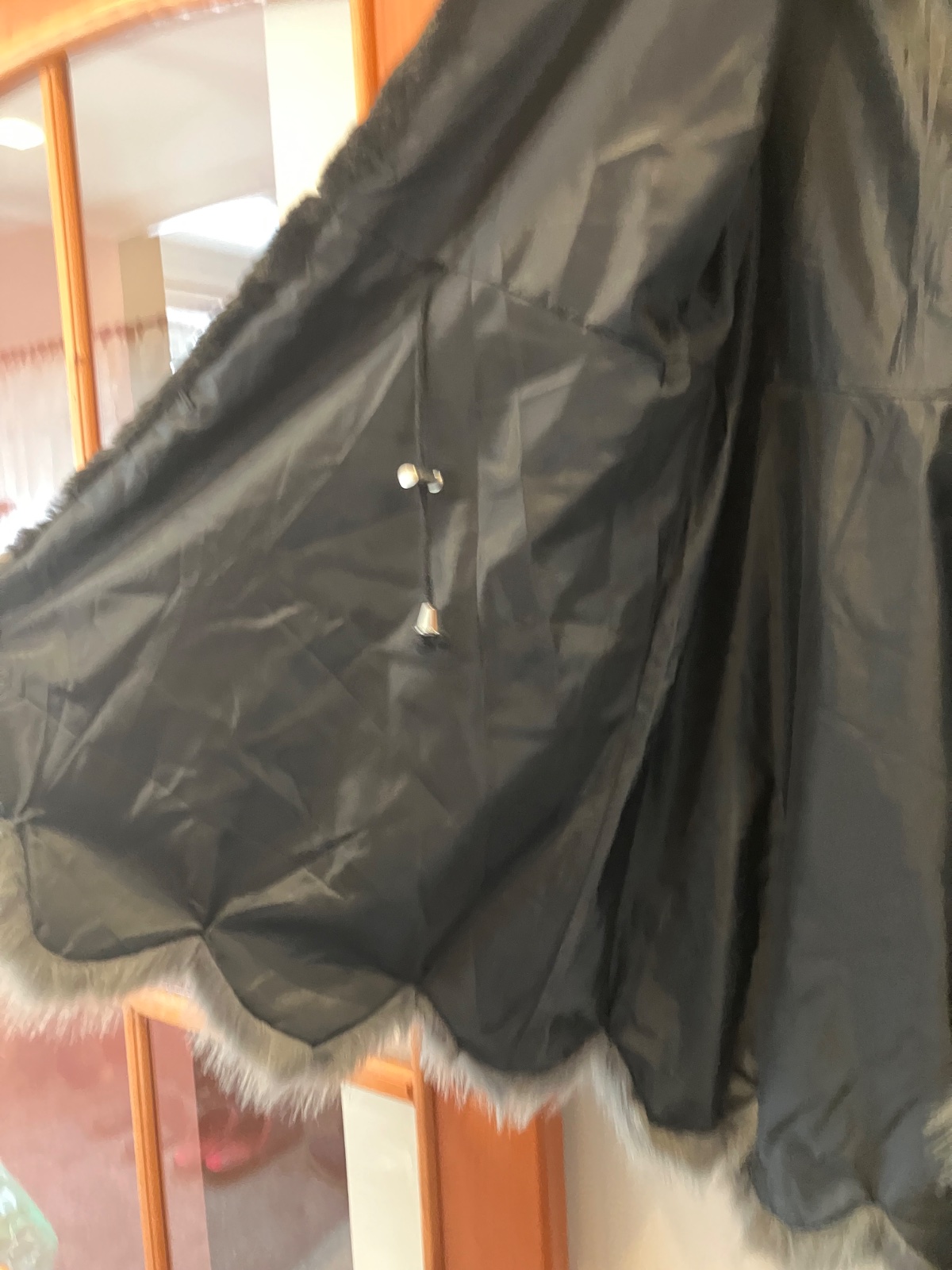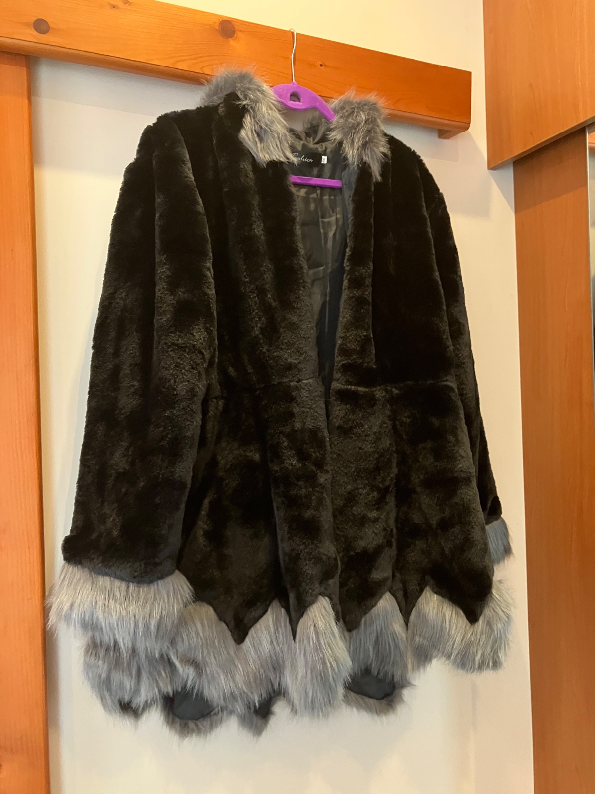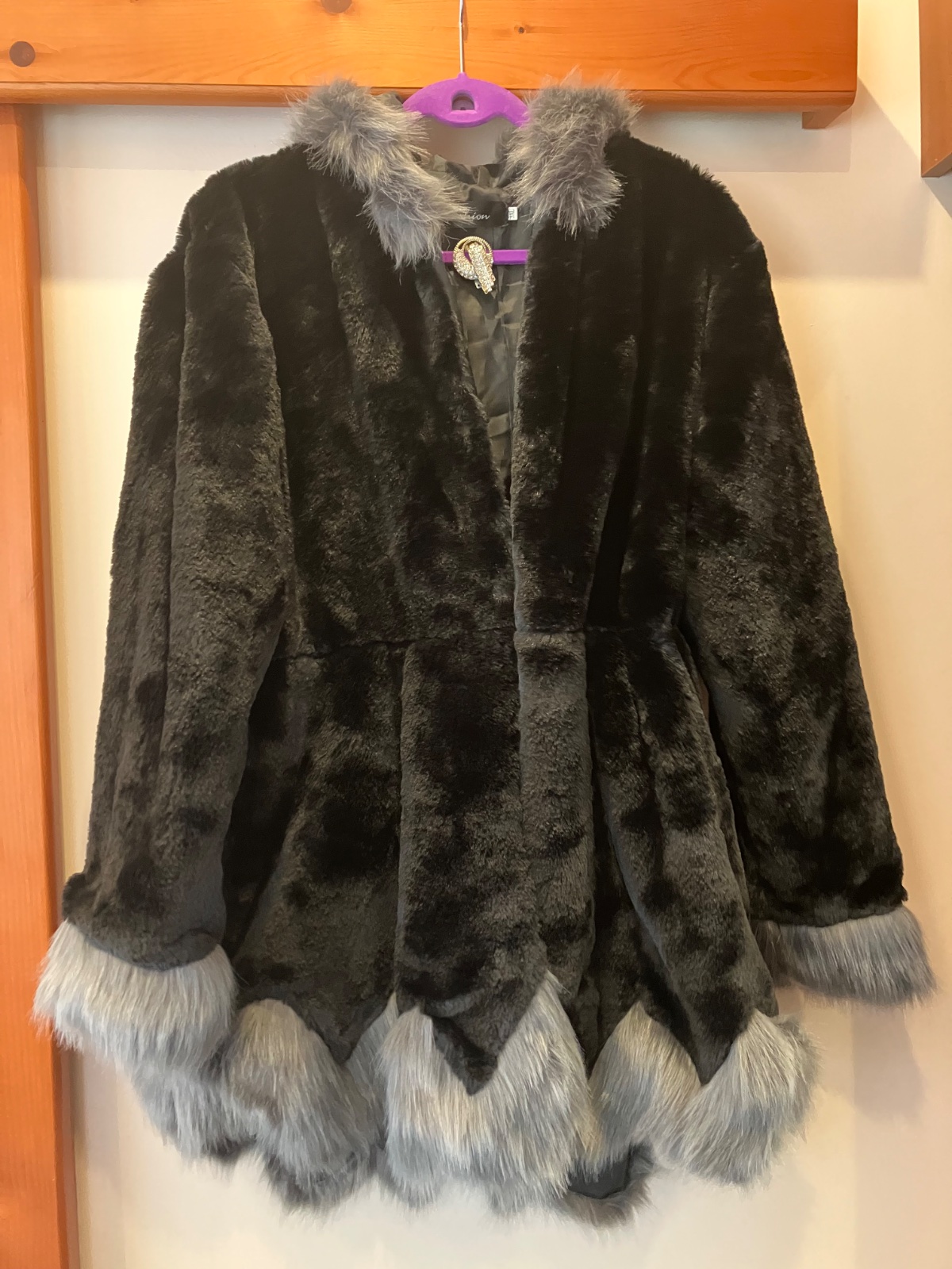 Čierny kabát v štýle ponča s kapucňou, ktorý by nosila každá pravá mafia wife na zimnú prechádzku po Petrohrade. Luxusný vzhľad umelej kožušiny, lemovaný bohatou sivou “líščou” kožušinkou. Strih do A, v páse sa dá stiahnuť na zvýraznenie siluety.