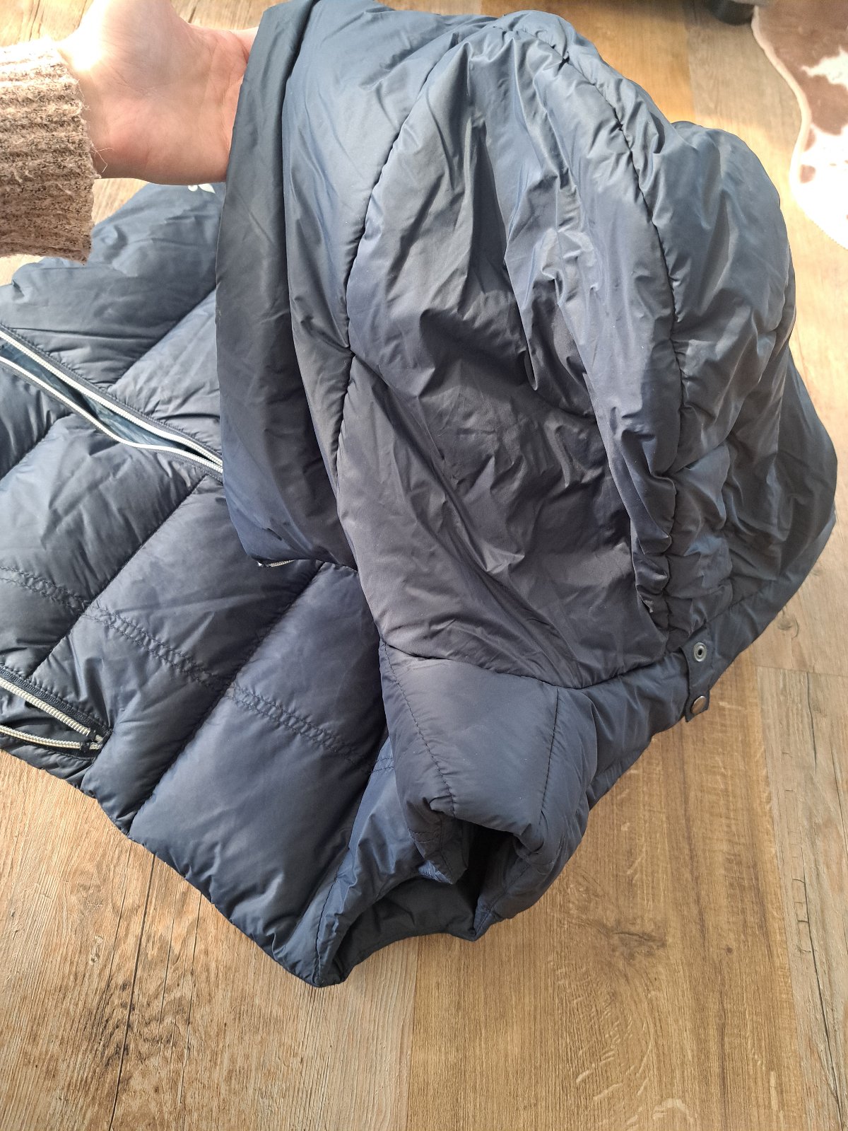 Tepla,perova,zips vporiadku,len chyba na jednom bezci ten uchyt.Na funkcnosti to nevadi.Celkova dlzka 57cm,sirka 41cm,otvor na ruky 21cm,dole elasticky patent 38cm.Kapucna sa da odopnut,na vreckach...