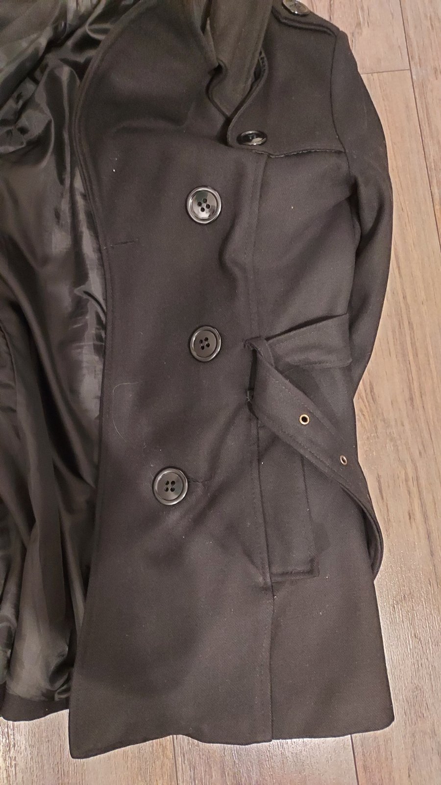 Dámsky čierny kabát veľkosti S, vhodný na prechodné obdobie.