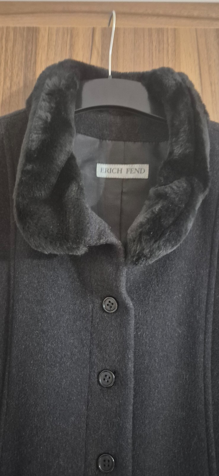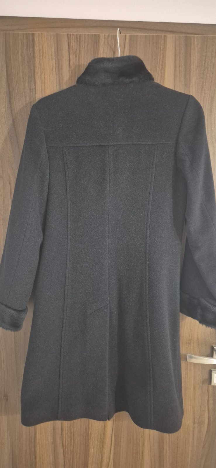Elegantný podšity flaušový kabát vo veľmi dobrom stave. Veľkosť 40. Bez poškodenia. Okolo krku a na rukávoch umelá kožušina. Dĺžka cca po kolená.