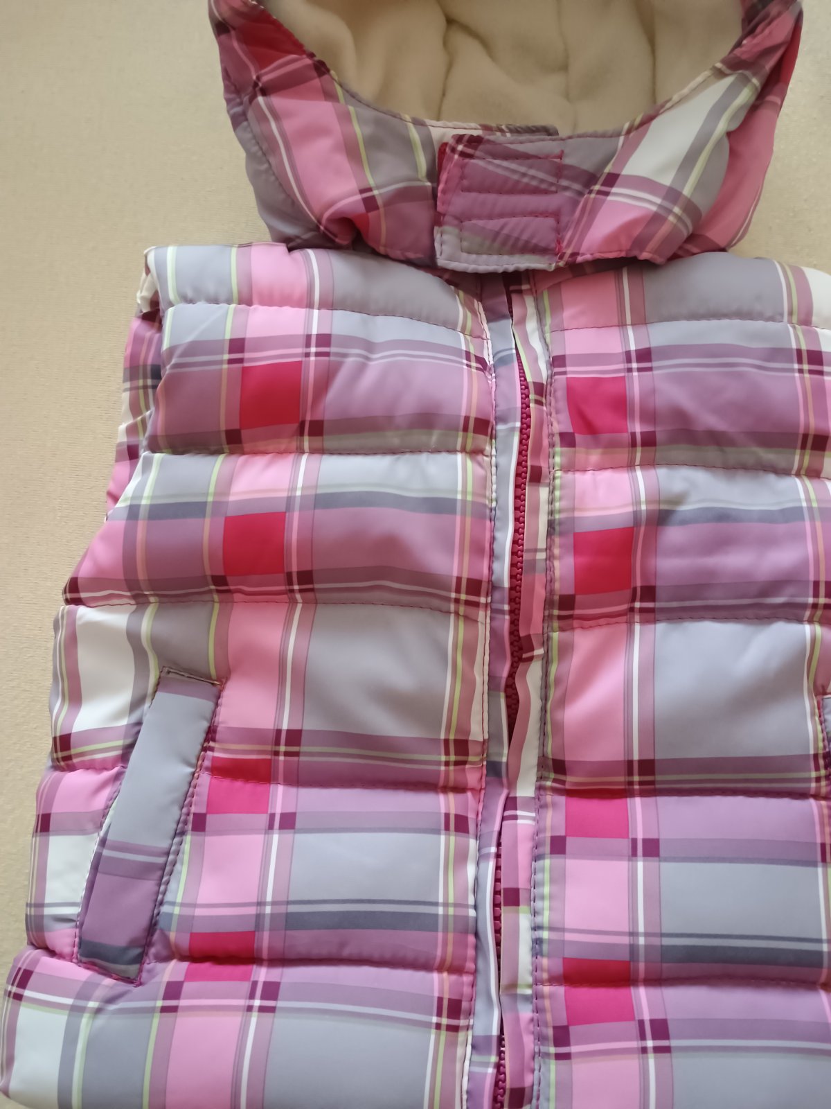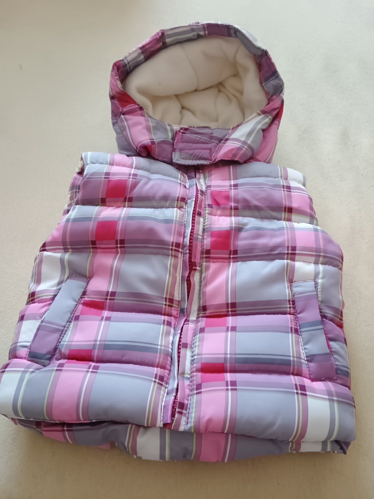 Predam vestu na zips zateplenu s 2-mi postrannymi vreckami. Golier otepleny hrejivym fleecom. Velkost 74 Rozmery: Dlzka chrbat od krku cca 30cm Sirka ramienka cca 22cm Sirka pod prsiami cca 32cm
