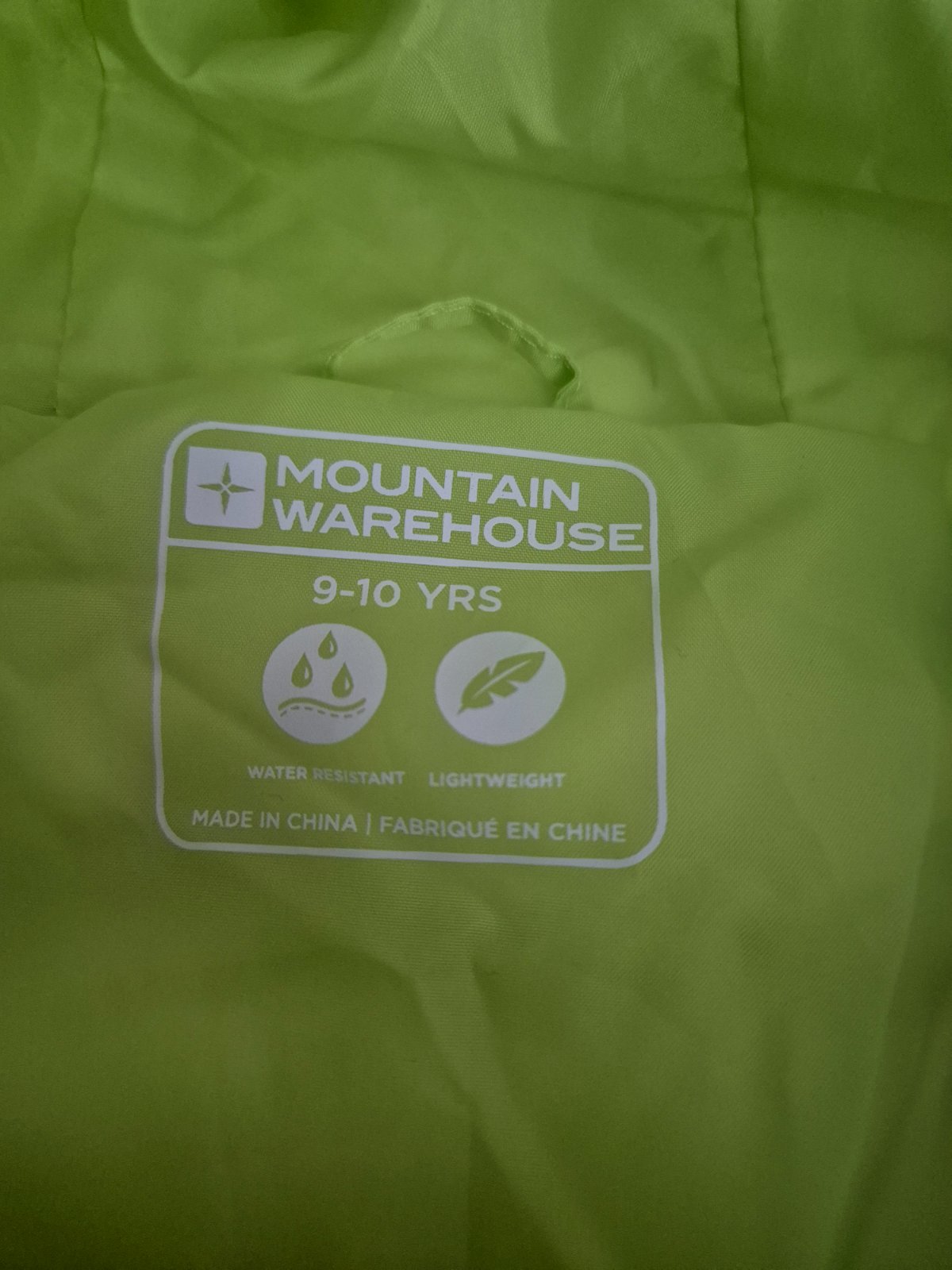 Prechodna vetrovka Mountain Warehouse pre vek 9-10 rokov. S kapucňou. Po boku vrecka na zips. Bez poškodeni, bez žmolkov. Bežné známky nosenia.