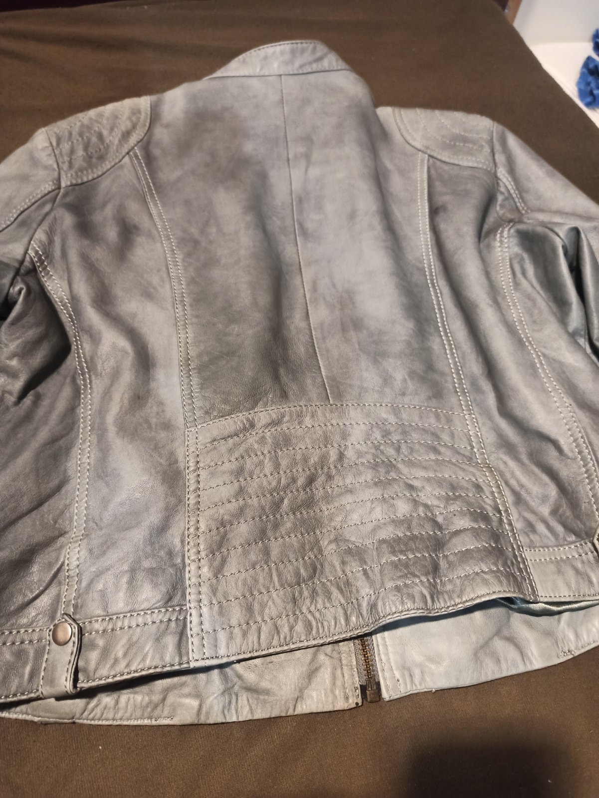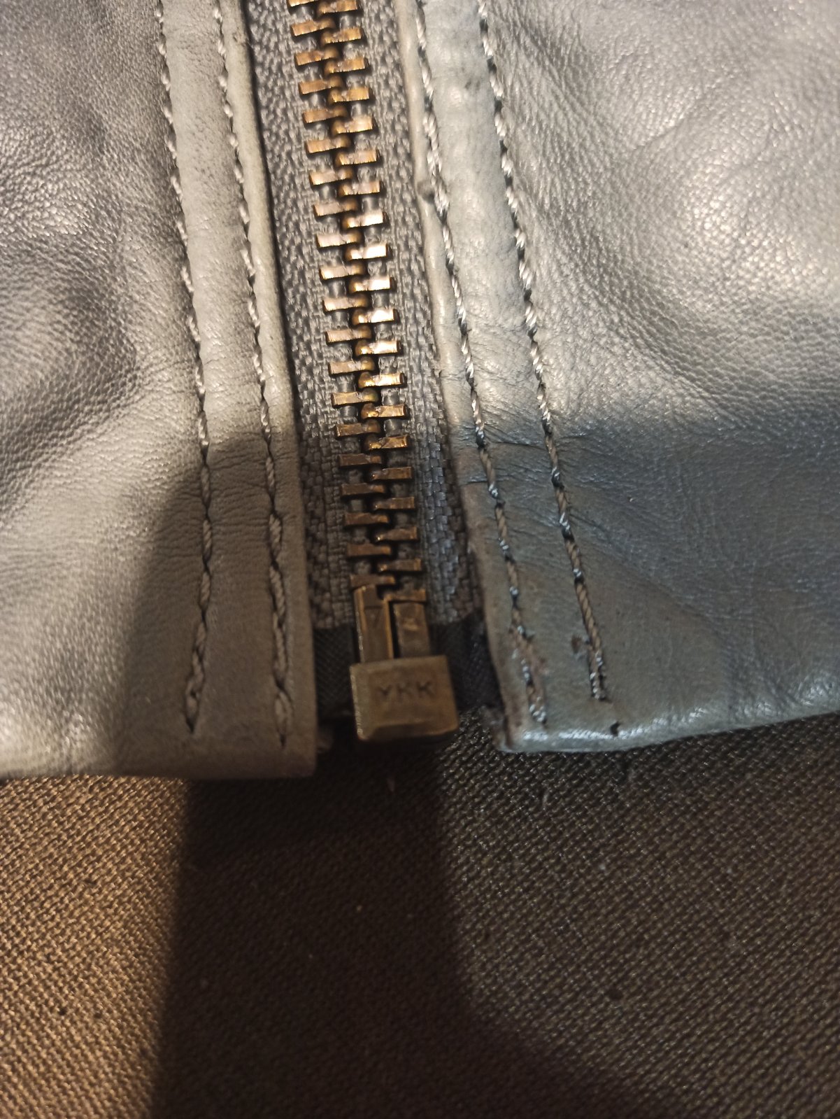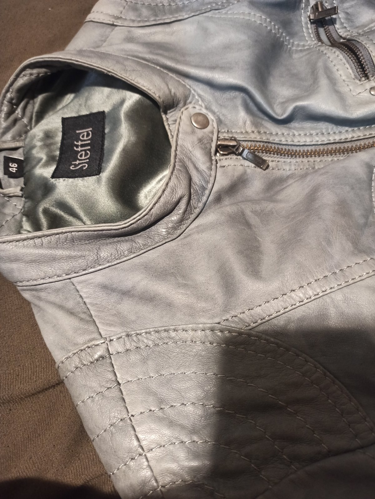 Zvláštna sivá, 46, nosena, bez poskodeni, zips je funkčný aj na vreckach, dĺžka 55 CM, šírka 52*2cm, pútko na zavesie je z jednej časti uvolnene