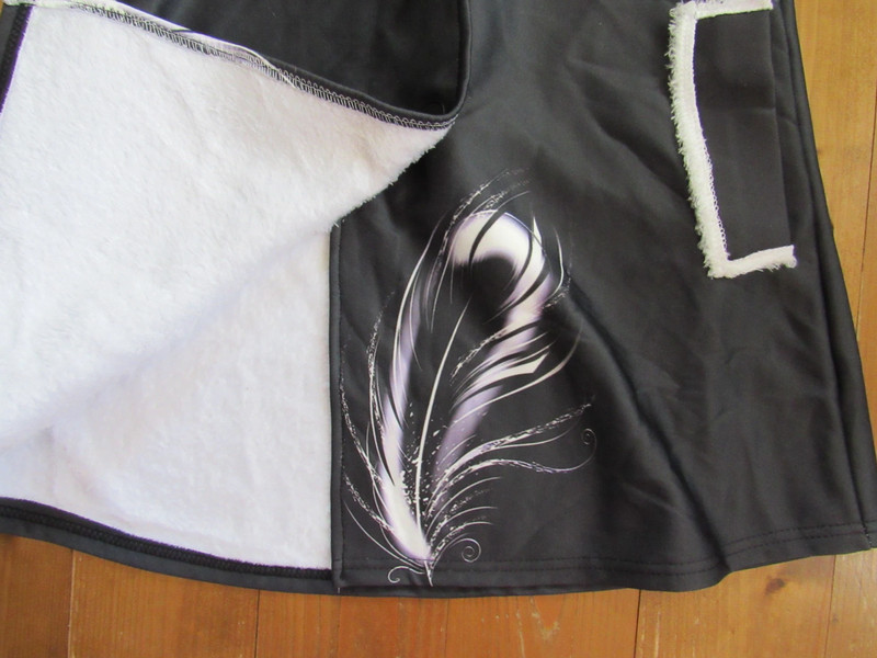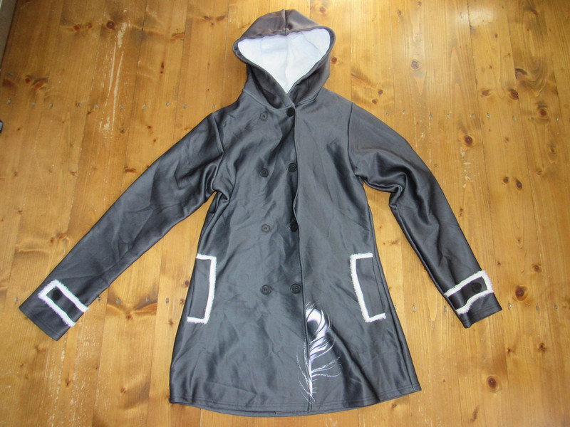 milý kabátik, vo vnútri má jemnú huňku aj v kapucni, je tenší, potlač pierka