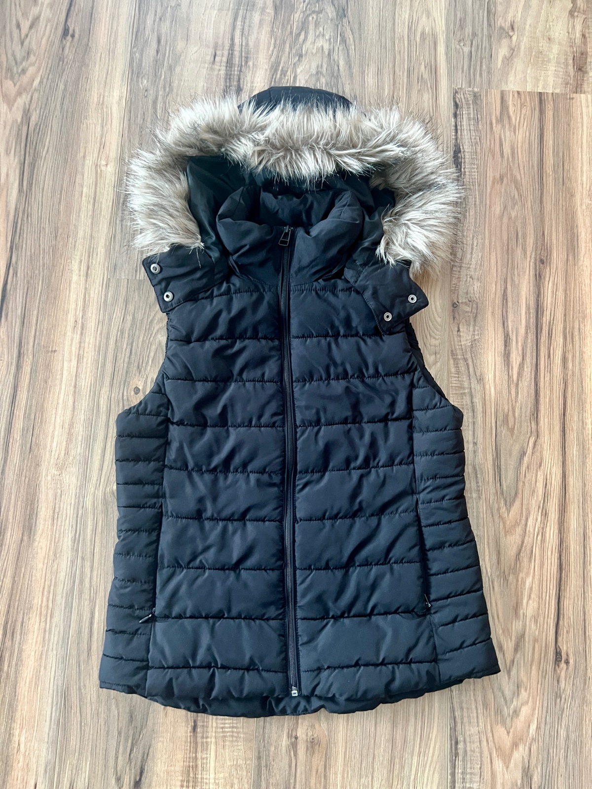 Čierna teplá vesta s odnímateľnou kapucňou, teplá, zapína sa na zips a má dve funkčné vrecká, ktoré sa tiež zapínajú na zips. Značka H&M. Veľkosť 38.