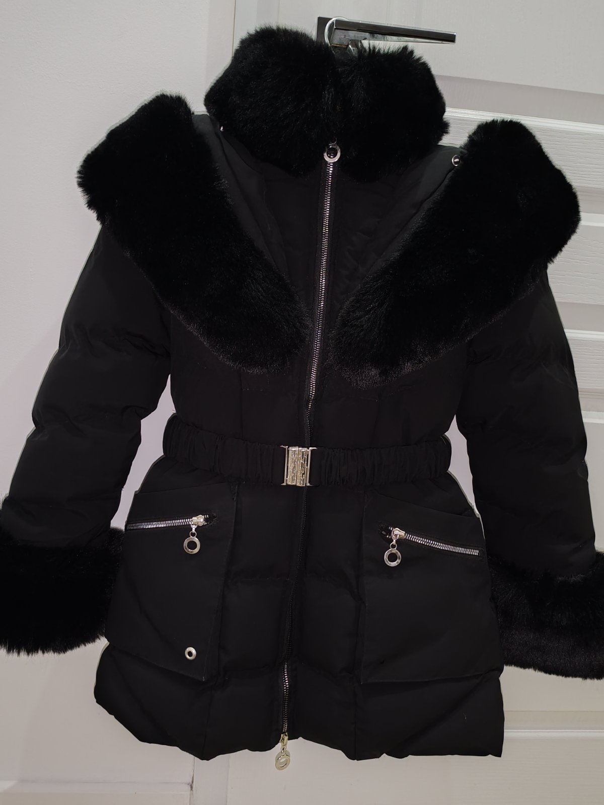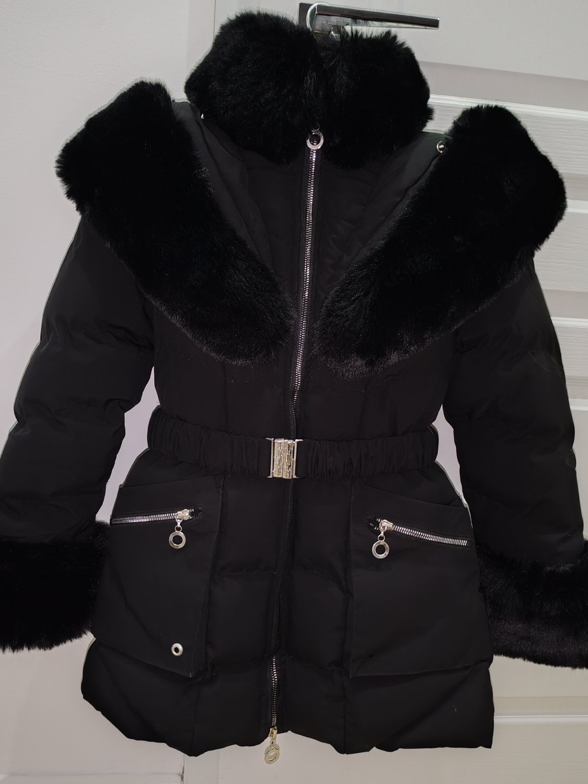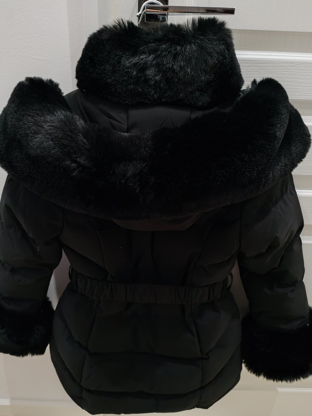 Predám krásny kabát veľkosti 140, 10r. Kabát je zvnútra zateplený kožušínkou. Kožušina je taktiež na koncoch rukávov na golieri a po kraji kapucne.