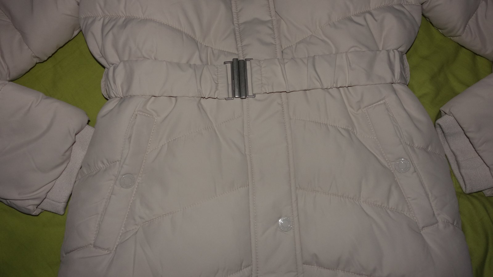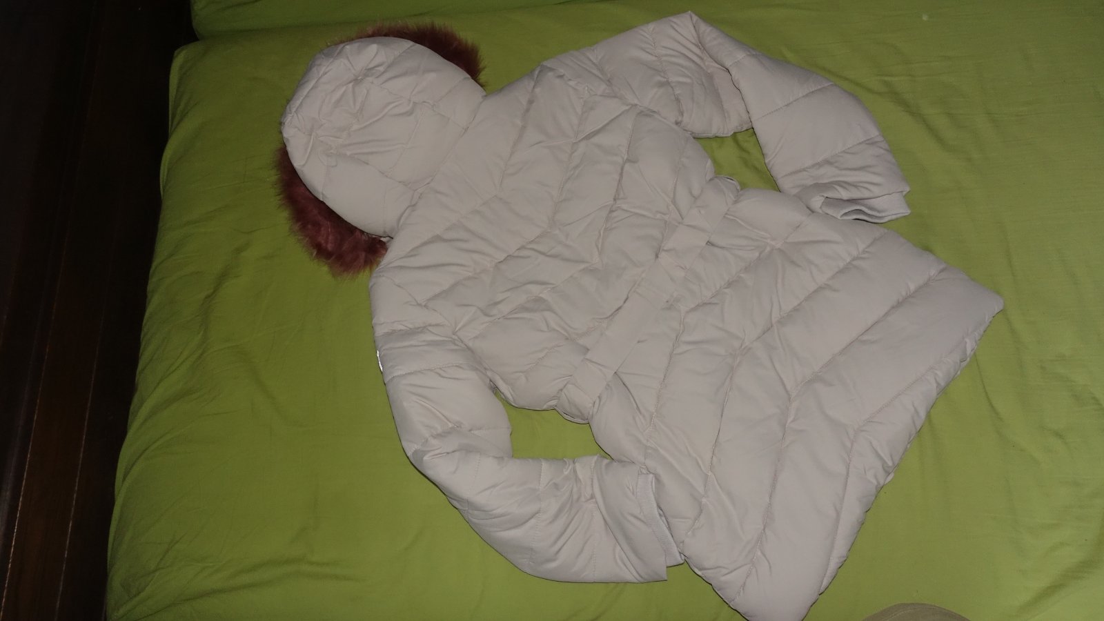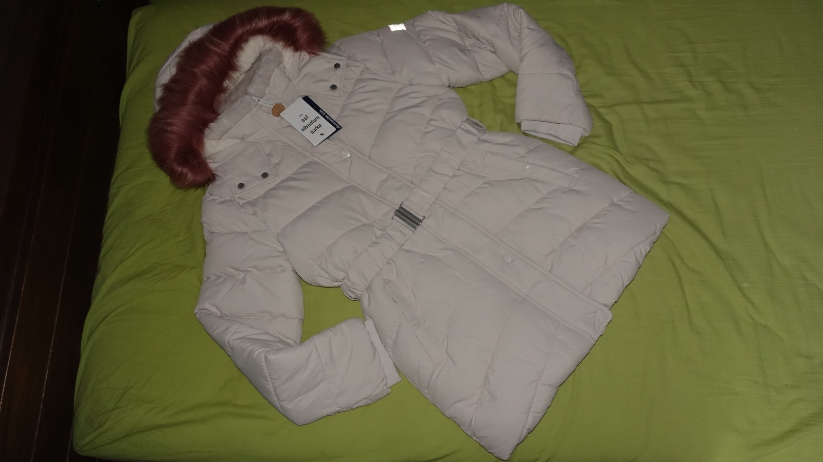 Krasna zimna bunda- nova, s visackami. Je vodeodolna, kozusinka z kapucne sa da odopnut, podsita je barancekom.