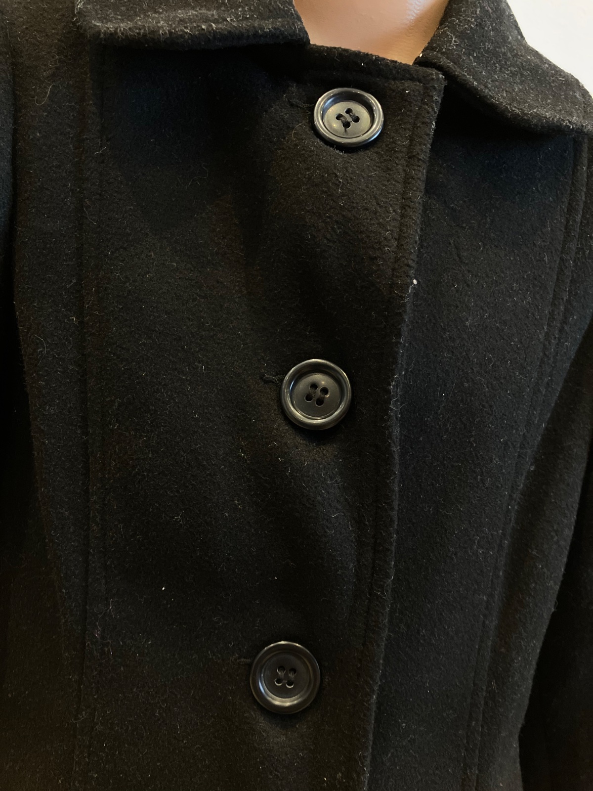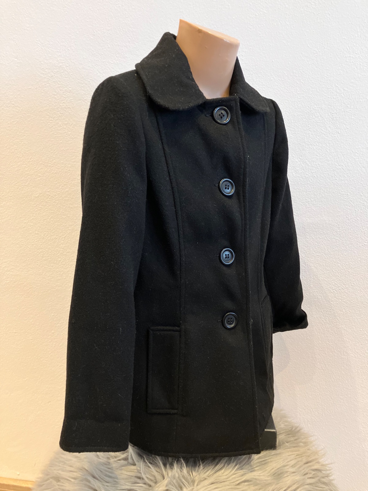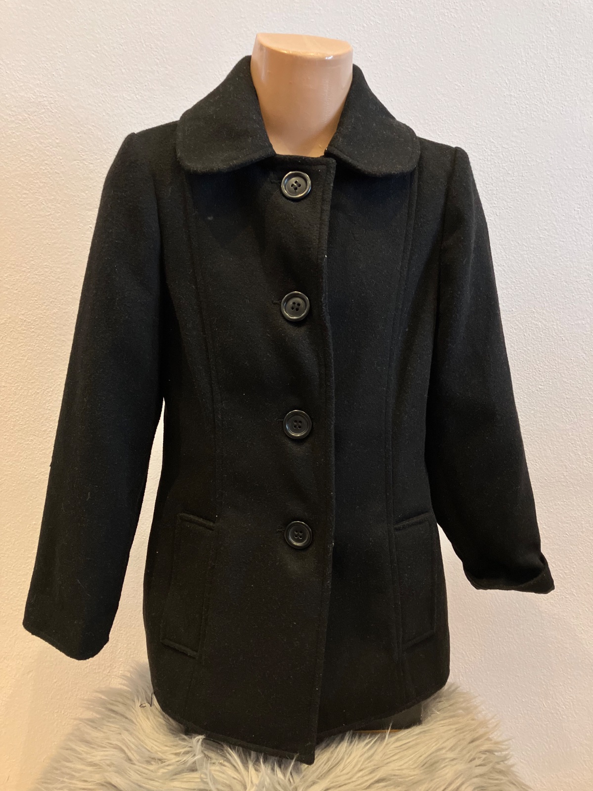Dievčenský čierny kabát, hrubší, elegantný, zapínanie na gombíky, dve bočné vrecká, materiál 100%polyester. Nie je elastický.