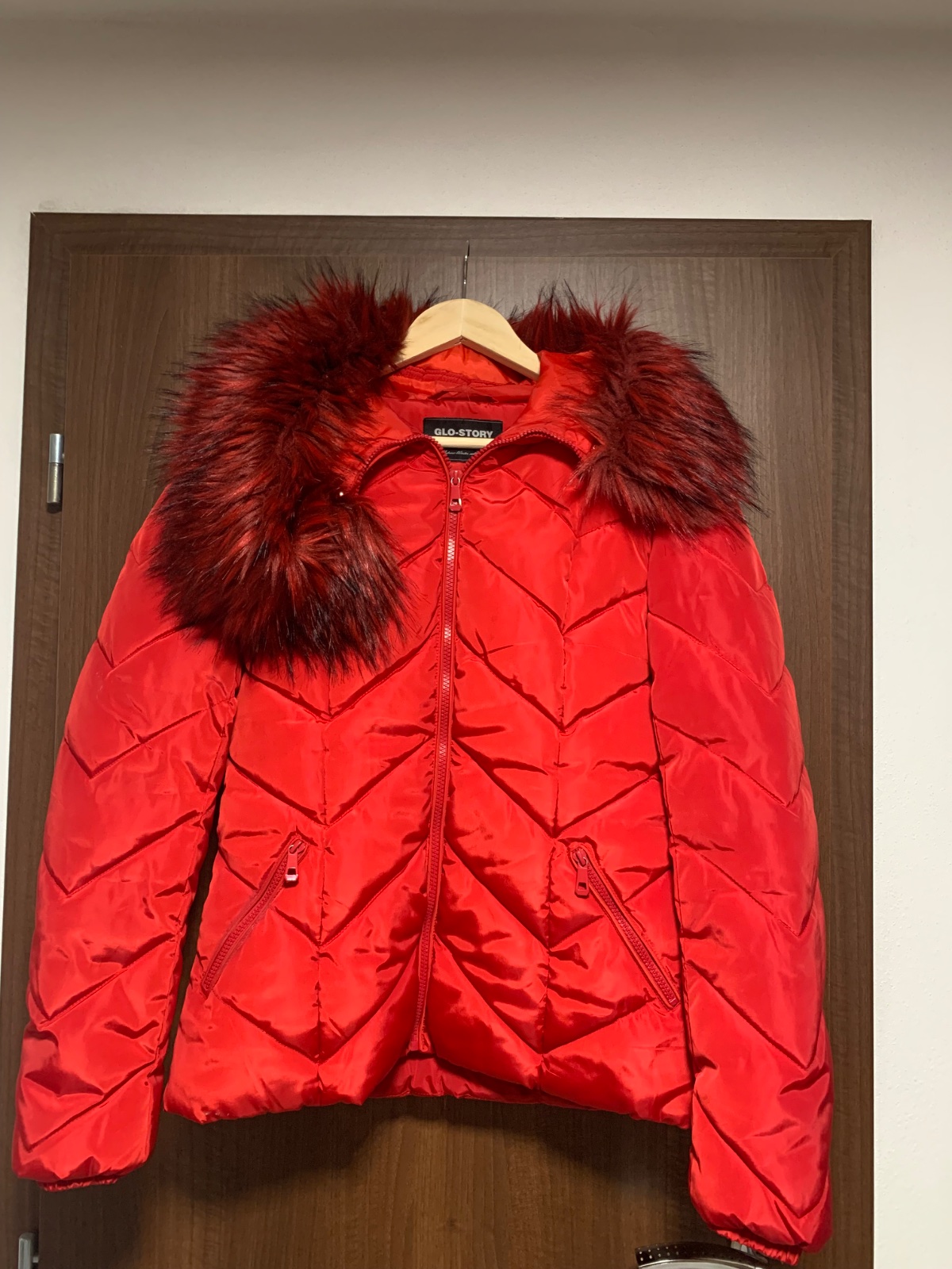 Krasna, je do slabsej zimy, kratka do pasu, pekne popresivana golier je umela kozusina so striebornou nitou, mne je uz mala, minimalne znaky nosenia, sirka pod pazuchami 50, dl,ka 56, dlzka rukava 62