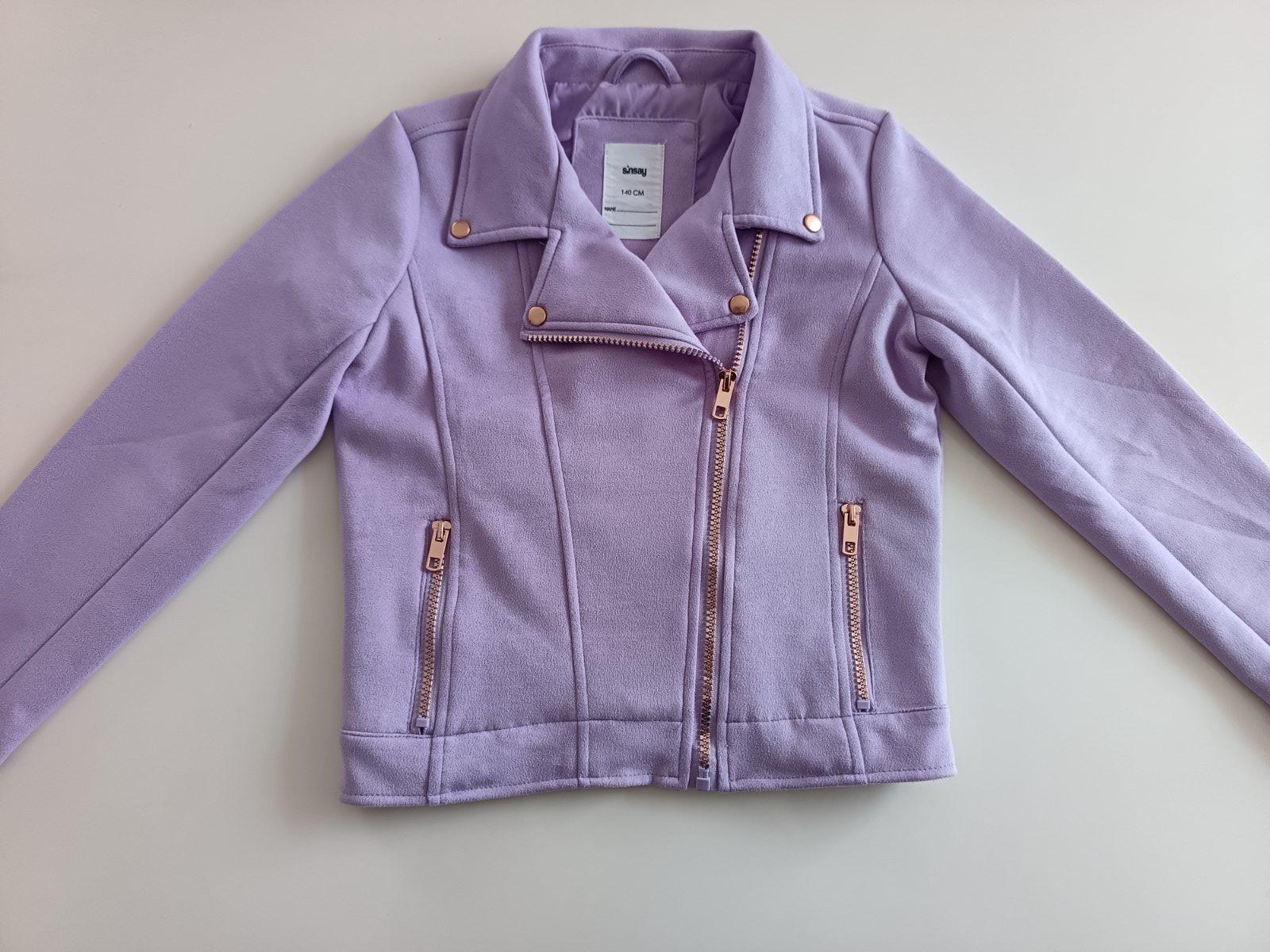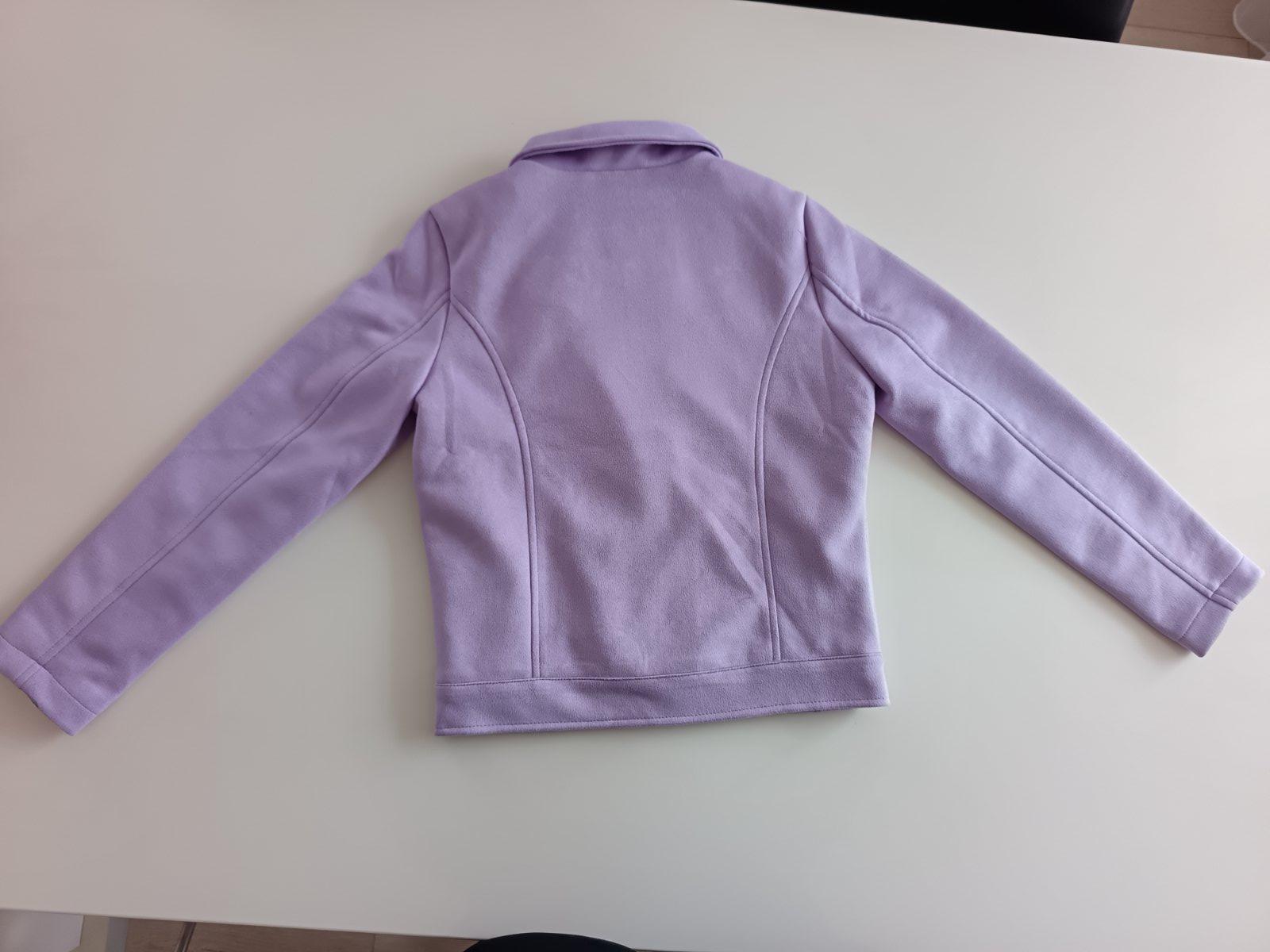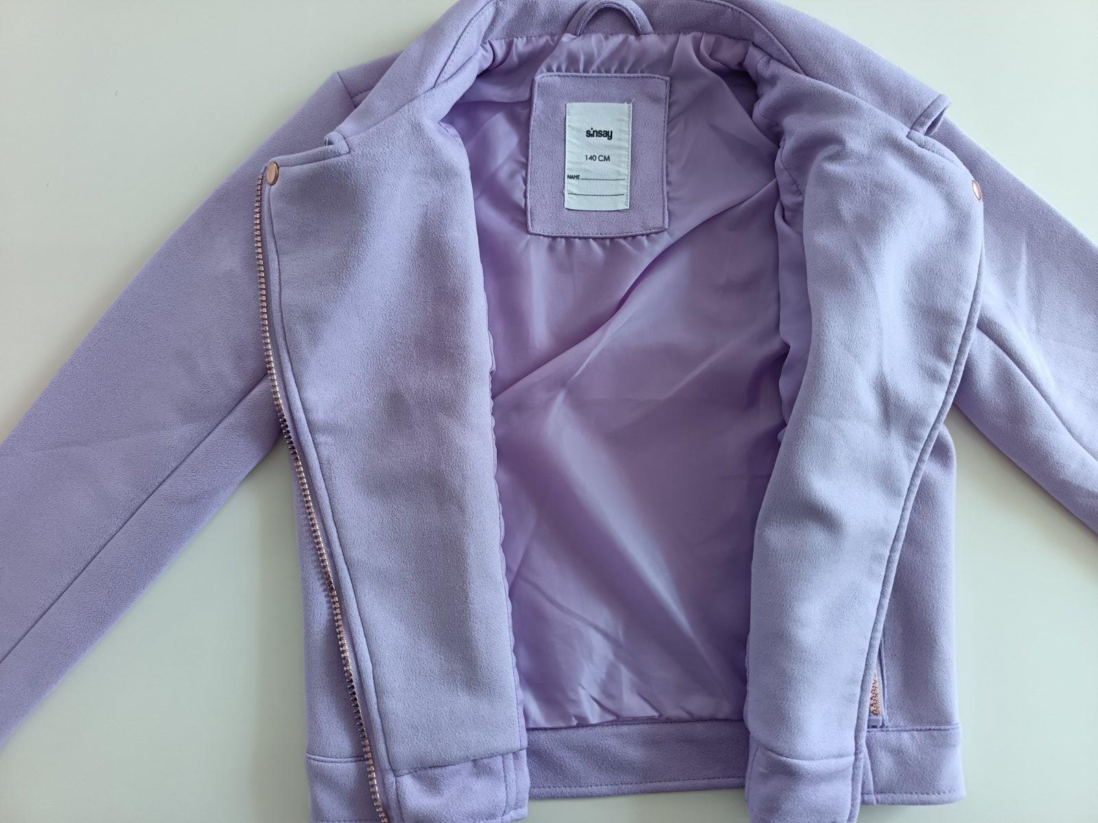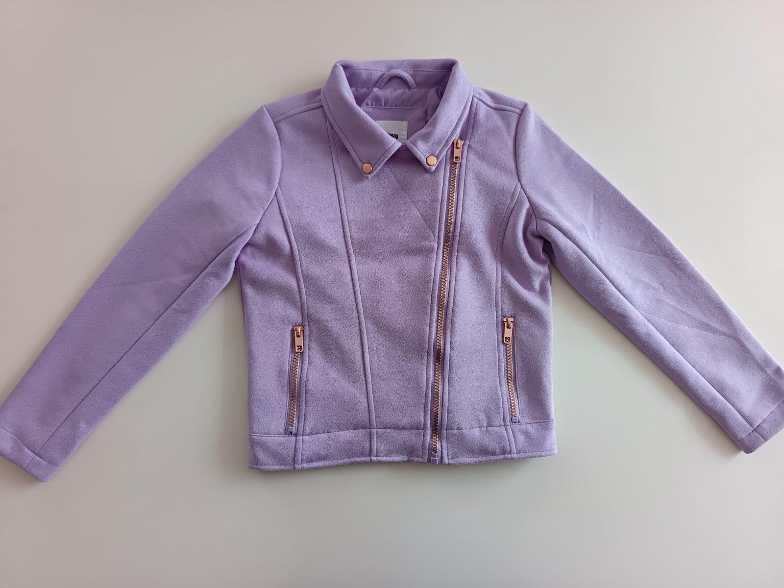 Svetlo fialová bunda, akoby brusena, mäkká koža, príjemná na dotyk, zapínanie z predu na zips, taktiež vrecká majú zips, podšita, bez poškodenia