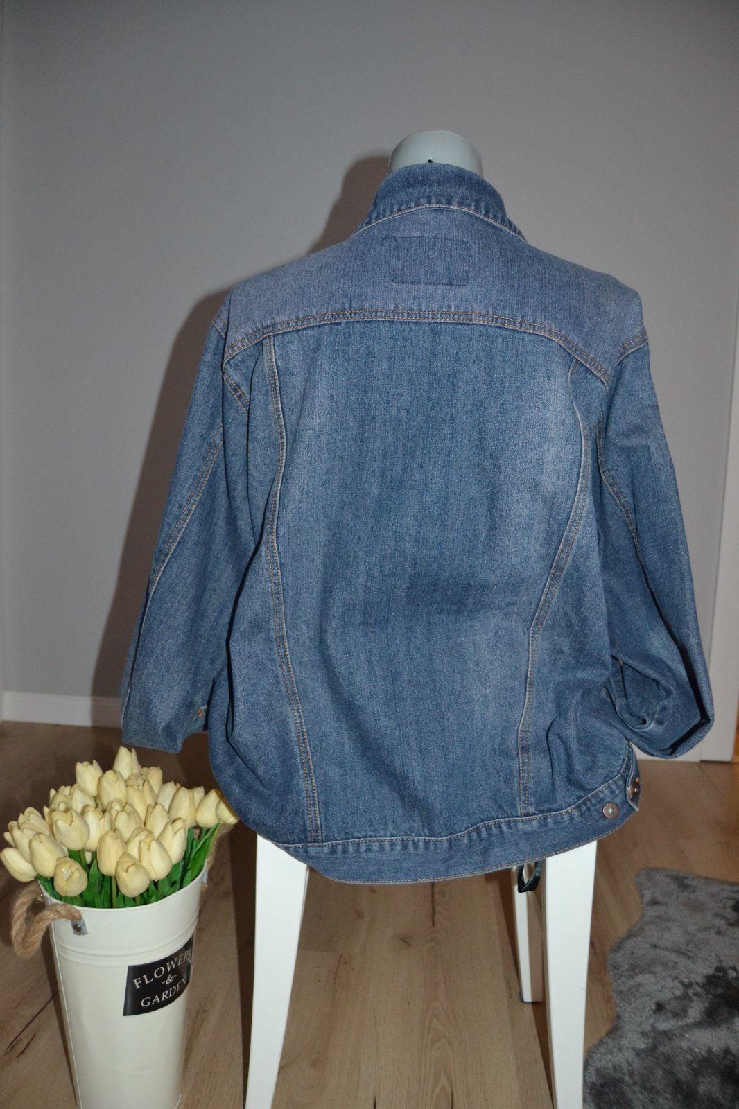 Pánska rifľová bunda v modrej farbe, veľkosť L, rozmery obvod cez prsia 124 cm, rukávy 64 cm, dĺžka bundy 69 cm.