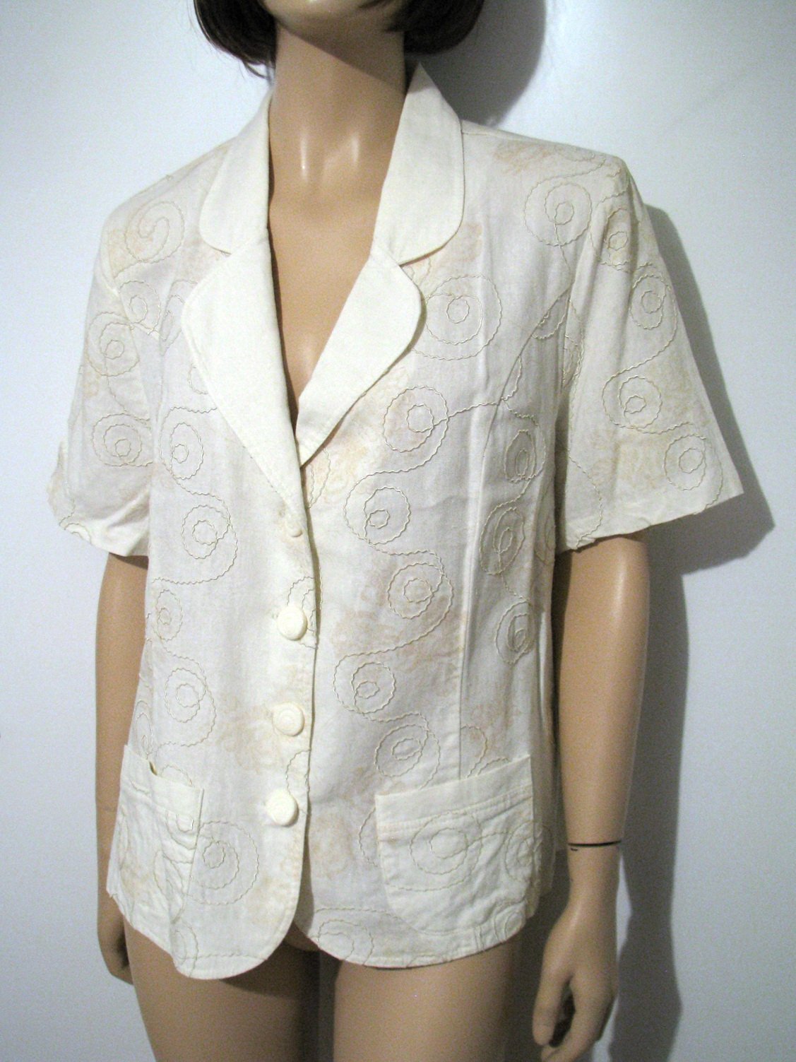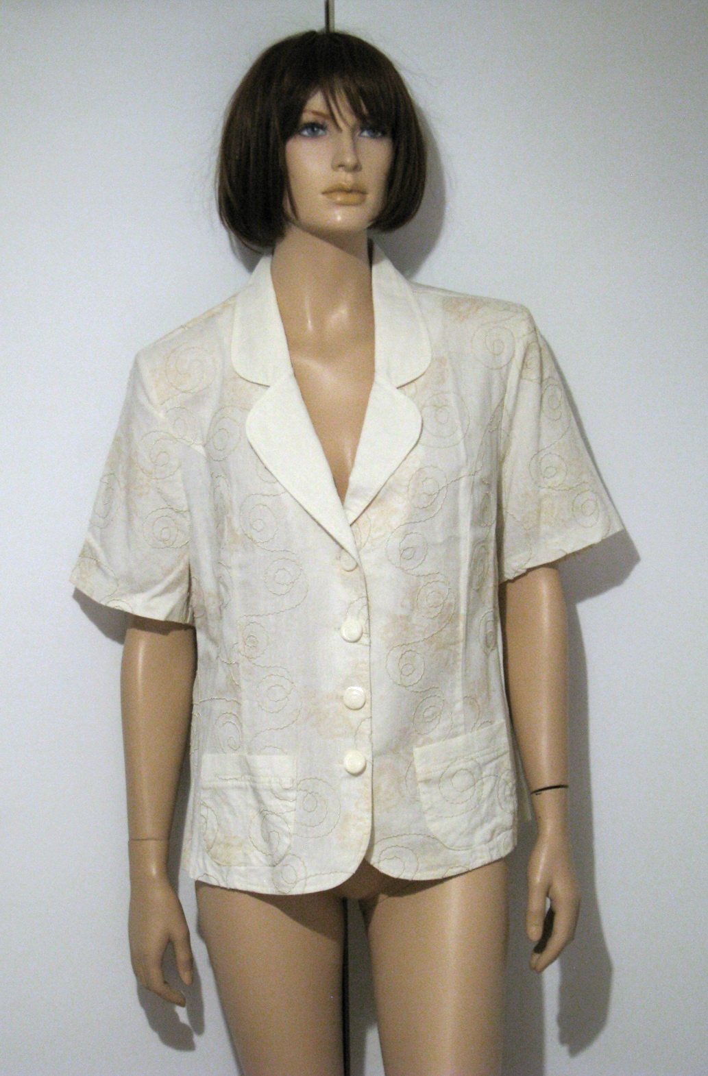 Letné krémové sako s krátkymi rukávmi, s jemnou béžovou kvetinovou potlačou a plastickou lesklou aplikáciou. Materiál 70% bavlna, 30% polyester. Poľská výroba. Výborne zachovalé, bez poškodení. Rozmery sú: šírka cez prsia 61 cm, šírka cca v páse 55 cm, šírka pri spodnom okraji 64 cm, dĺžka dolu chrbtom od miesta prišitia goliera 61 cm.