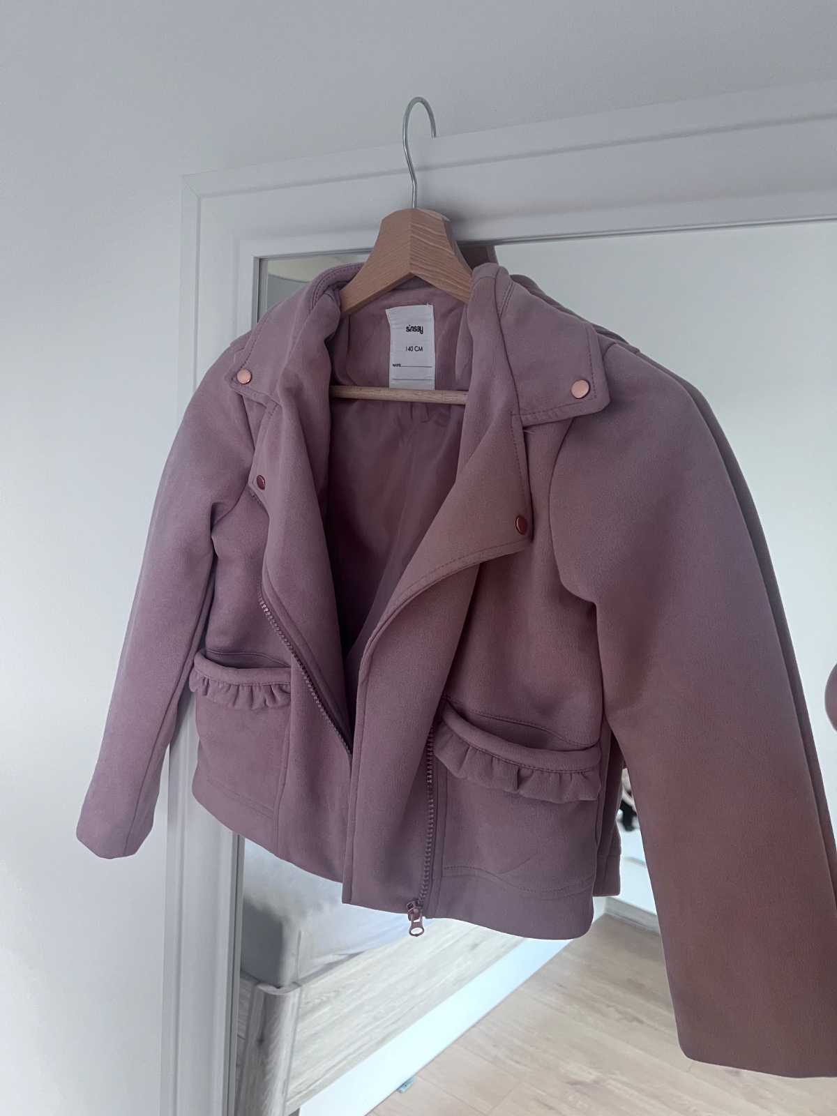 Predám krádnu detskú semišovú bundu staroružovej farby. Vnútri zašitá v oblasti lístku, inak bez poškodenia. Cena 4€